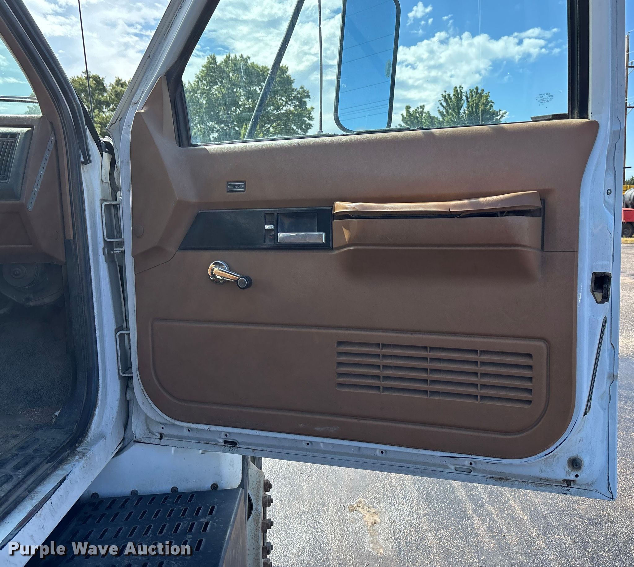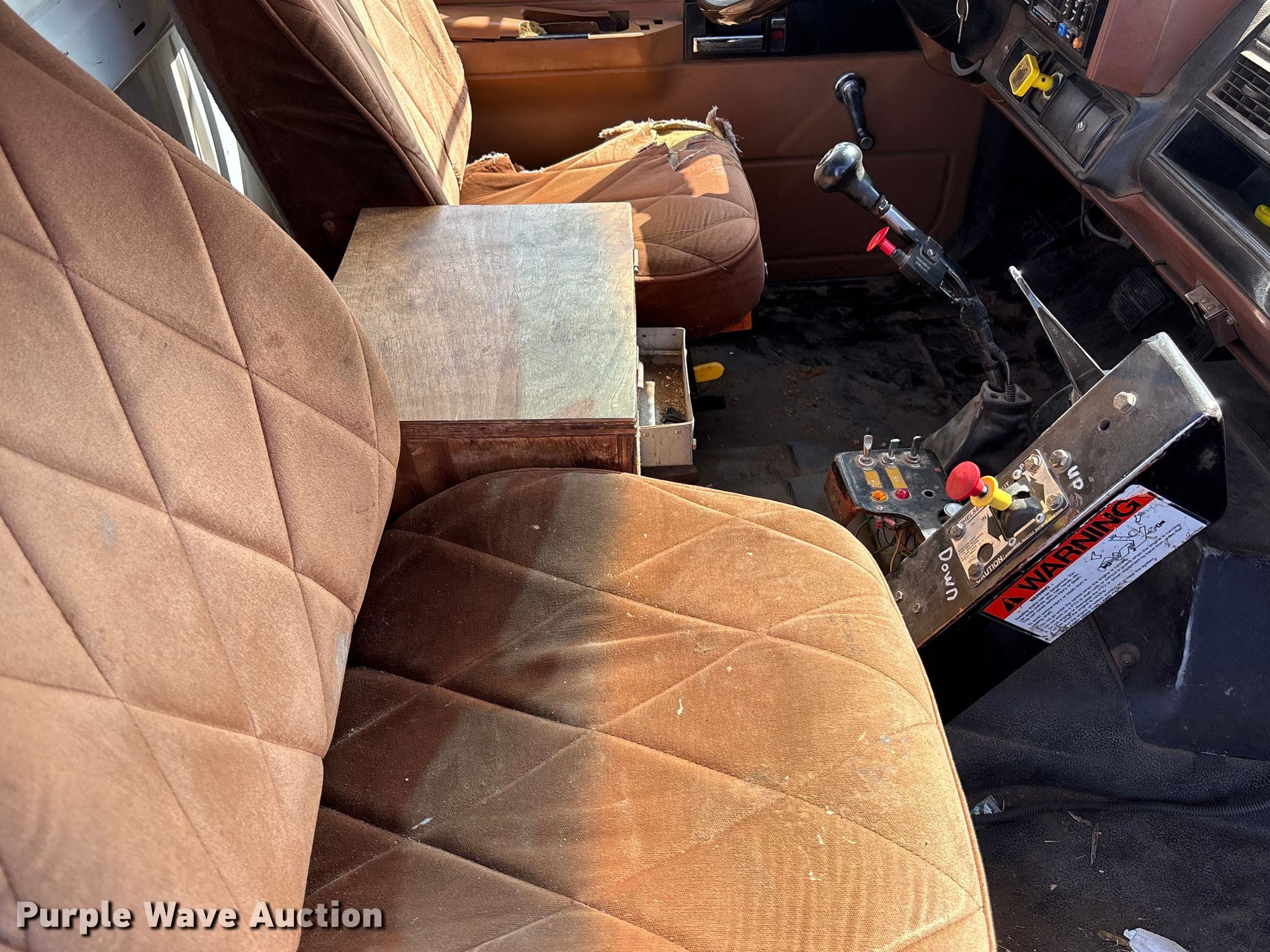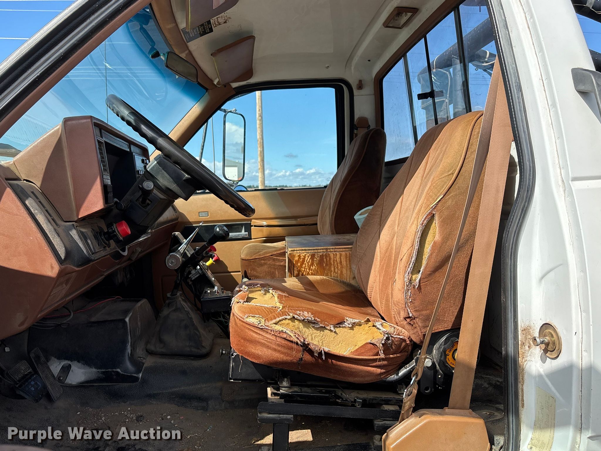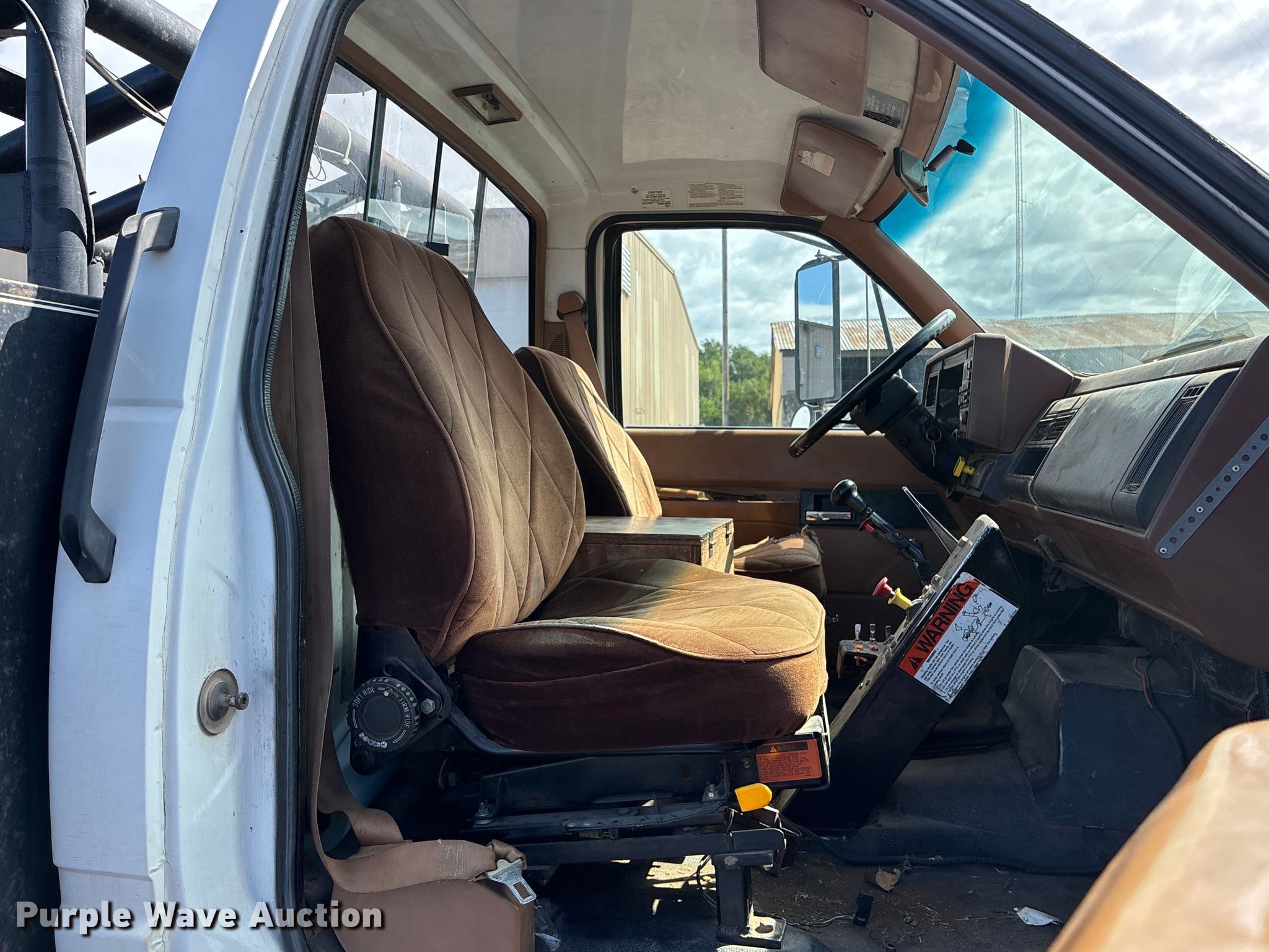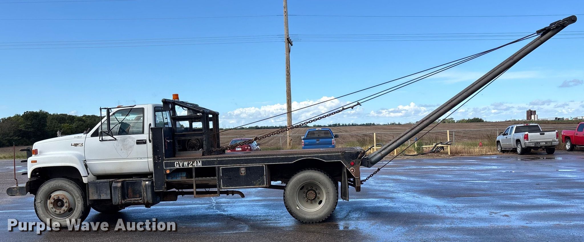 1992 CHEV Flatbed Winch Truck winch truck. Miles: 176,841 on odometer, VIN: 1GBM7H1P1NJ101027. Engine Displacement: 6.0L, Cylinders: 8, Fuel type: Gas. Transmission Manual, Speed: 10. Chassis Axles: Single, Suspension: Spring, Brakes: Air, PTO, Wheelbase: 192". Interior AC, Heat, Cruise control. Features Bed Flatbed, Length: 12' 6", Width: 8', Winch Capacity: 15,000 lbs, Rolling tailboard, Gin poles. Tires Size: 11R22.5. Kansas title. Title distribution may be delayed up to 14 days from verification of funds. Rice County Highway Department. Lyons, KS 67554