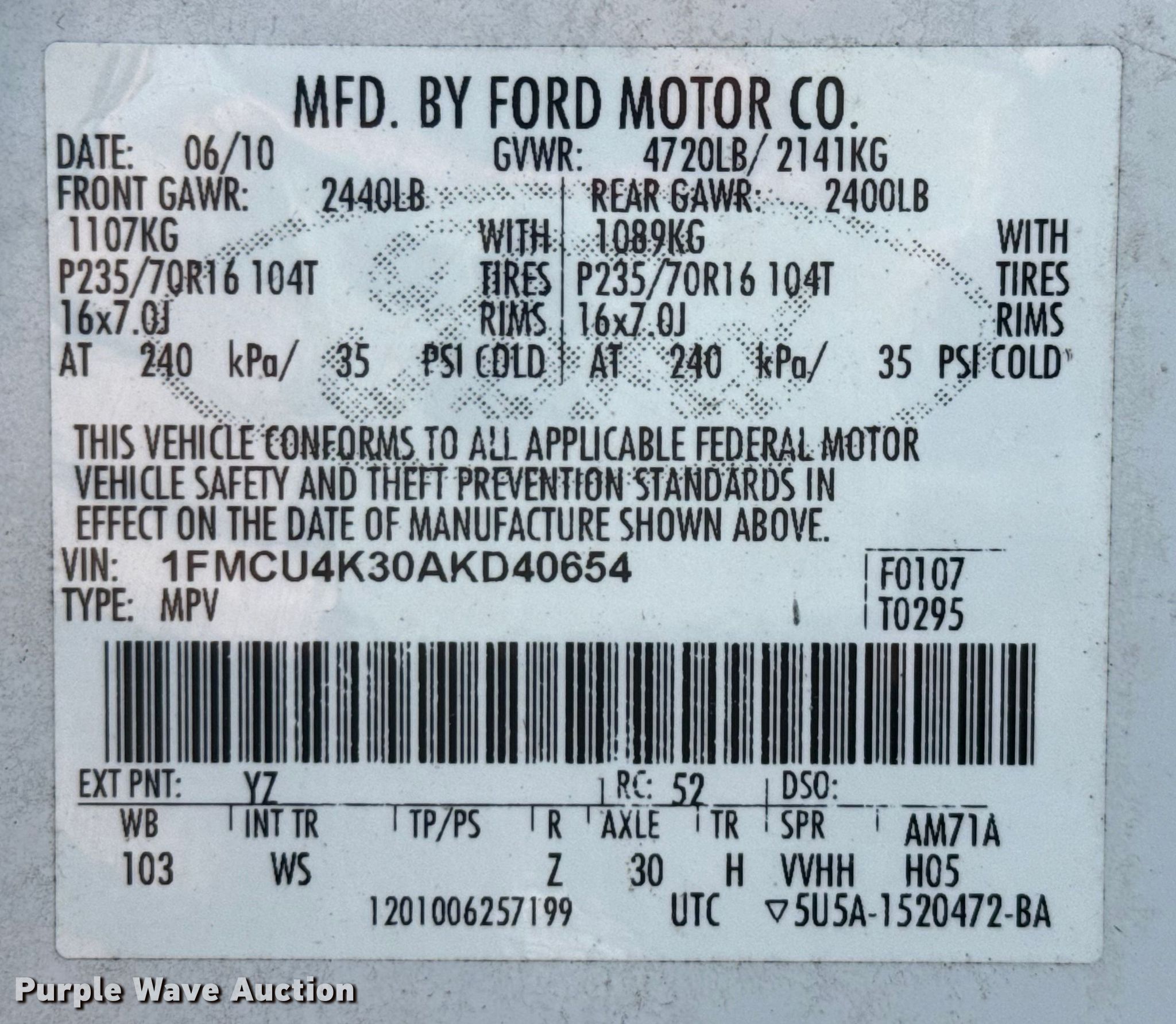 Purple Wave is selling a used Passenger Vehicle in Texas. This item is a 2010 Ford Escape Hybrid SUV with the following: Miles: 118,289 on odometer, VIN: 1FMCU4K30AKD40654, Unit #: 501