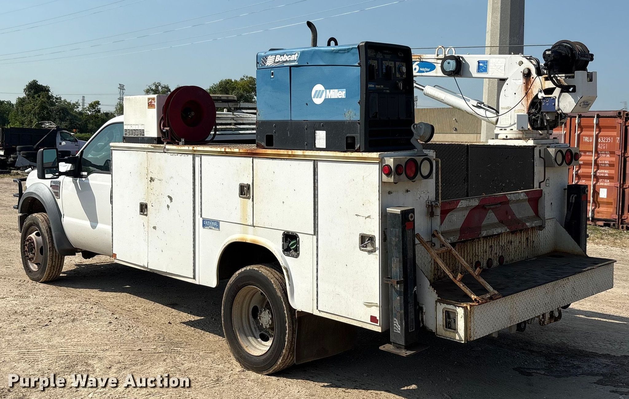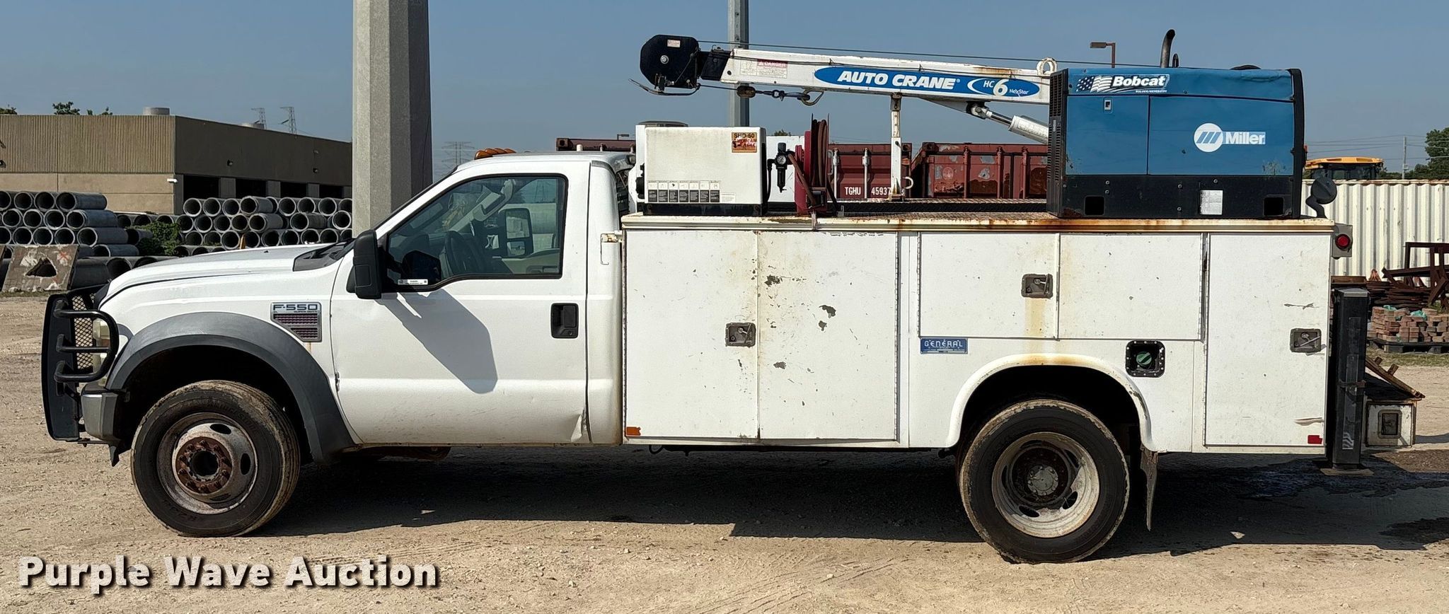 2009 Ford F550 utility / service truck. Miles: 102,127 on odometer, VIN: 1FDAF56R39EA17201, Unit #: 627. Engine Displacement: 6.4L, Cylinders: 8, Fuel type: Diesel. Transmission Automatic. Chassis Axles: Single, Suspension: Spring, Brakes: Hydraulic, PTO, GVWR: 19,500 lbs, Wheelbase: 165". Interior AC, Heat, Cruise control, Auxiliary controls, Brake controller. Features Bed Utility bed, General, Length: 11' 1", Width: 94", Torch bottle rack, Welder/generator Miller Bobcat 250, Hours: 24 on meter, Fuel type: Gas, 240V outlets: 1, 120V outlets: 4, Watts: 11,000, Welder type: Tig, CC, CV, Wire, Stick (AC/DC), Air compressor American Eagle SHD-60, Oil/lube system Reservoirs Hydraulic fluid, Crane Auto crane HC6, Maximum boom length: 20' Maximum lift capacity: 6,000 lbs.. Tires Size: 225/70R19.5. Notes Welder issues, turns over but will not start, Dash warning indicator: Airbag, Windshield chipped or cracked, Jump start required during on-site data collection, Hood issues, will not close, Driver door issues, Unknown operating condition of crane, Non-operational crane remote. It is unlawful for any officer or employee of the City of League City, either directly or indirectly, to submit bids or purchase at any auction sale. Texas title. Seller is a government entity who will be assigning and distributing the title. Please contact the seller for distribution questions. City of League City, TX. League City, TX 77573