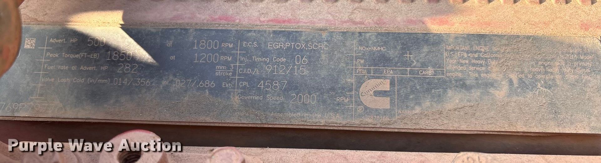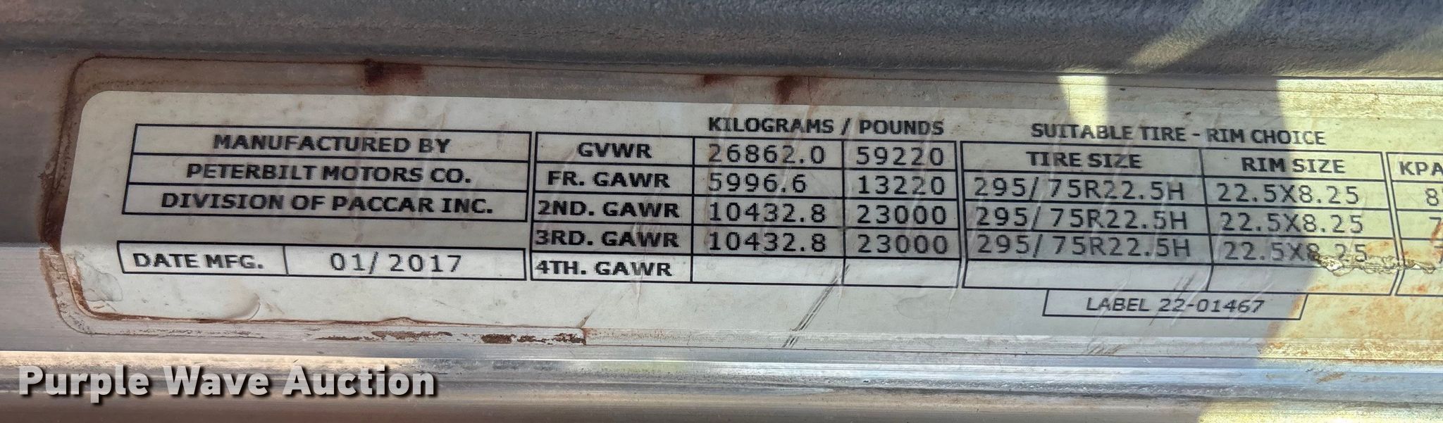 2018 Peterbilt 367 semi truck. Miles: 258,141 on odometer, Hours: 11,795 on meter, VIN: 1XPTD40X0JD451752, Unit #: 297. Engine Cummins ISX15, Displacement: 15.0L, Cylinders: 6, Fuel type: Diesel. Transmission Automatic. Chassis Axles: Tandem, Differential lock: Inter-axle, Suspension: Air Dump valves, Brakes: Air, PTO, Wet kit, GVWR: 59,220 lbs FAWR: 13,220 lbs, IAWR: 23,000 lbs, RAWR: 23,000 lbs. Interior AC, Heat, Heated mirrors, Power windows, Power locks, Cruise control, Air ride cab. Features Deck plate: Aluminum, Fifth wheel type: Sliding, Fuel tank: Dual. Tires Size: 11R22.5. Notes Outer duals missing, Dash warning indicator: ABS, Brake, Traction control, Jump start required during on-site data collection, Fifth wheels air line issues, disconnected. Oklahoma title. Title distribution may be delayed up to 14 days from verification of funds. City of Norman - Open inspection October 10th from 8:00 a.m. to 1:00 p.m.. Norman, OK 73069