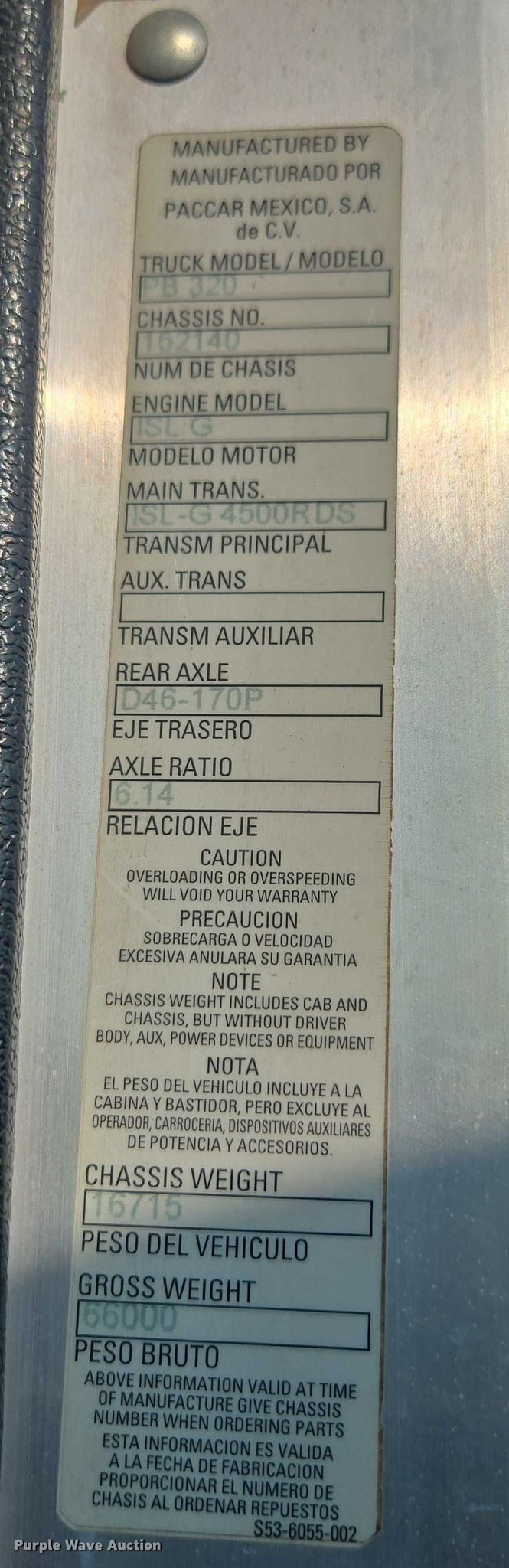 2012 Peterbilt 320 refuse truck. Miles: Unknown, VIN: 3BPZL20XXCF152140. Engine Cummins ISL G, Displacement: 10.0L, Cylinders: 6, Fuel type: CNG. Transmission Automatic. Chassis Double frame, Axles: Tandem, Differential lock: Inter-axle, Suspension: Spring, Brakes: Air, GVWR: 66,000 lbs.. Interior AC, Heat, Heated mirrors, Power windows, Cruise control. Features Refuse bed Load: Front. Tires Front: 315/80R22.5, Rear: 11R22.5. Notes Dash warning indicator: Check engine, ABS, Jump start required during on-site data collection, Hydraulic pump missing, Bed cylinders missing, Non-operational bed, Inner rear duals missing. Oklahoma title. Mileage has not been verified. Odometer discrepancy will be marked on the title. Title distribution may be delayed up to 14 days from verification of funds. City of Norman - Open inspection October 10th from 8:00 a.m. to 1:00 p.m.. Norman, OK 73069
