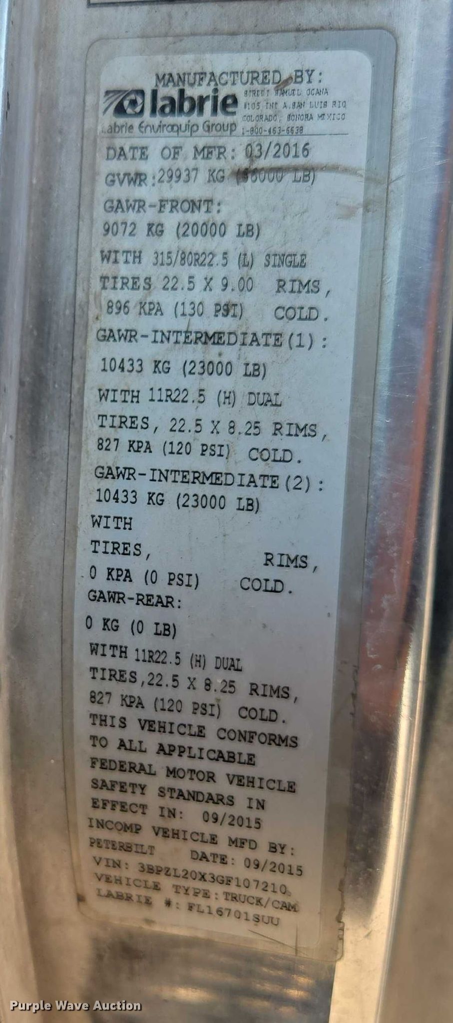 Purple Wave is selling a used Refuse Truck in Oklahoma. This item is a 2016 Peterbilt 320 refuse truck with the following: Miles: Unknown, VIN: 3BPZL20X3GF107210