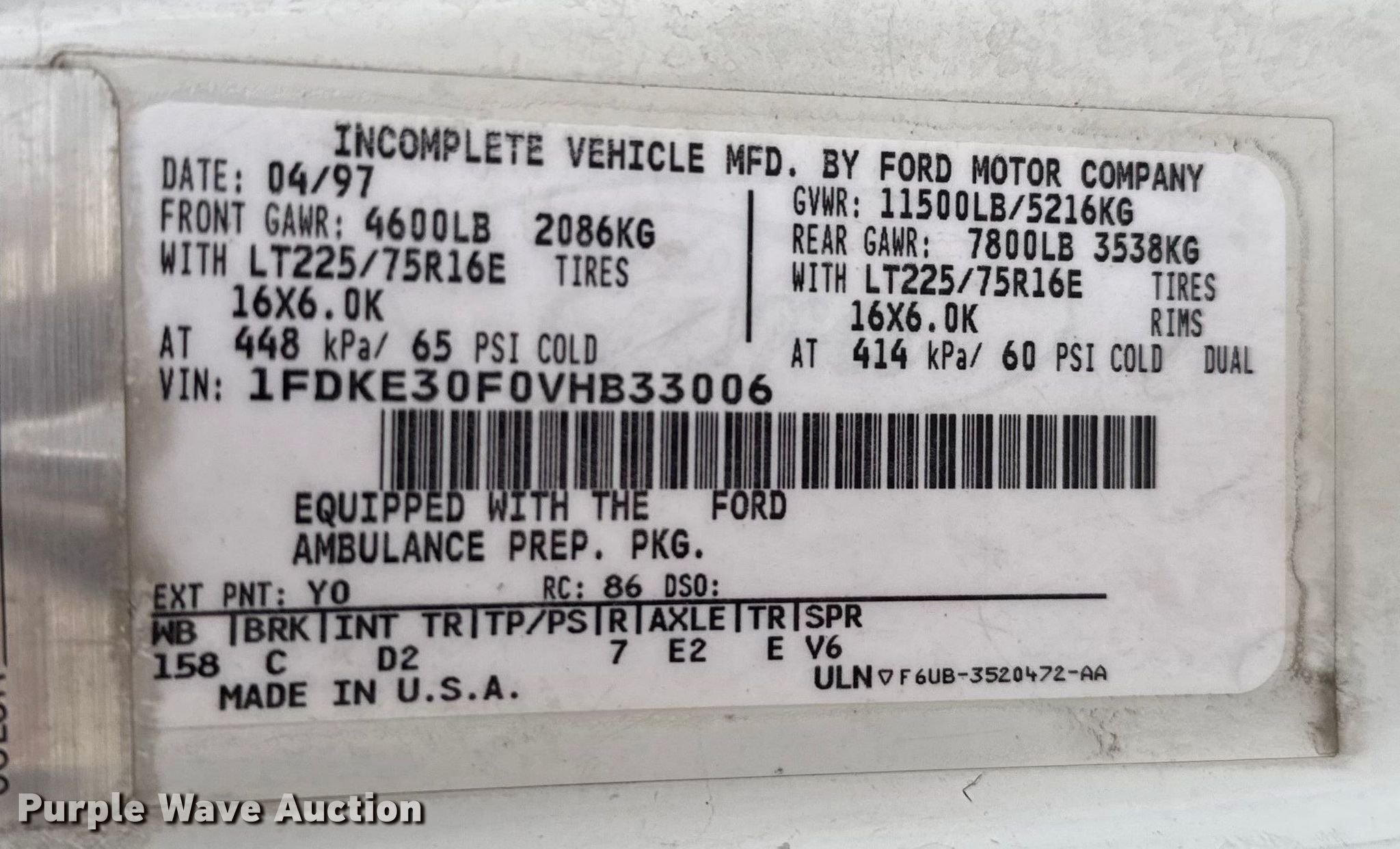 1997 Ford E350 ambulance. Miles: 169,210 on odometer, VIN: 1FDKE30F0VHB33006. Engine Displacement: 7.3L, Cylinders: 8, Fuel type: Diesel. Transmission Automatic. Chassis Axles: Single, Suspension: Spring, Brakes: Hydraulic, GVWR: 11,500 lbs. Interior AC, Heat, Power windows, Power locks, Cruise control, Auxiliary controls. Features Ambulance body McCoy E-350 158" DRW, PA/ siren controls, Oxygen hookups, Stryker gurney Capacity: 650 lbs. Tires Size: 225/75R16. Notes Dash warning indicator: ABS. Missouri title. Title distribution may be delayed up to 14 days from verification of funds. Worth County, Mo Ambulance District. Grant City, MO 64456