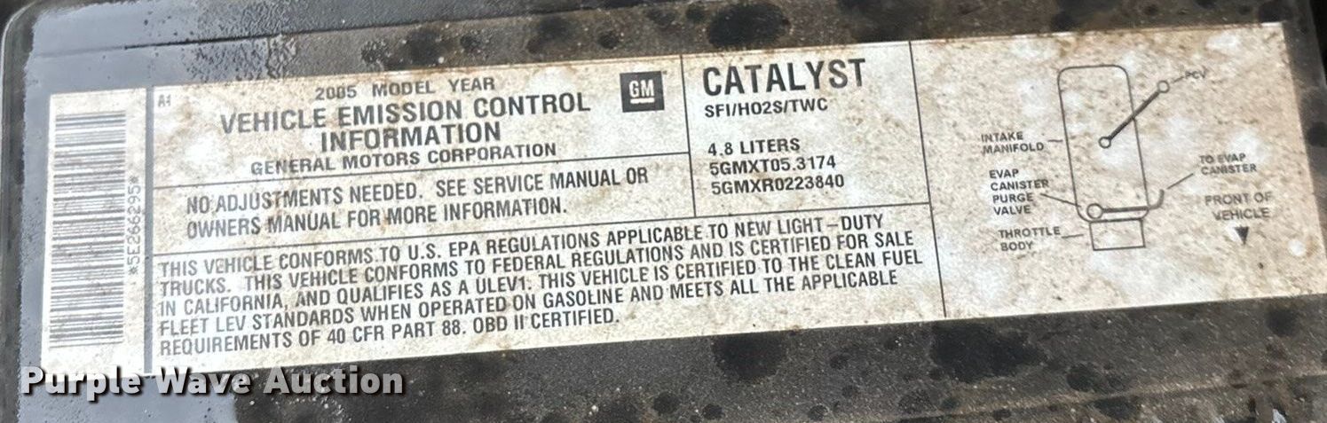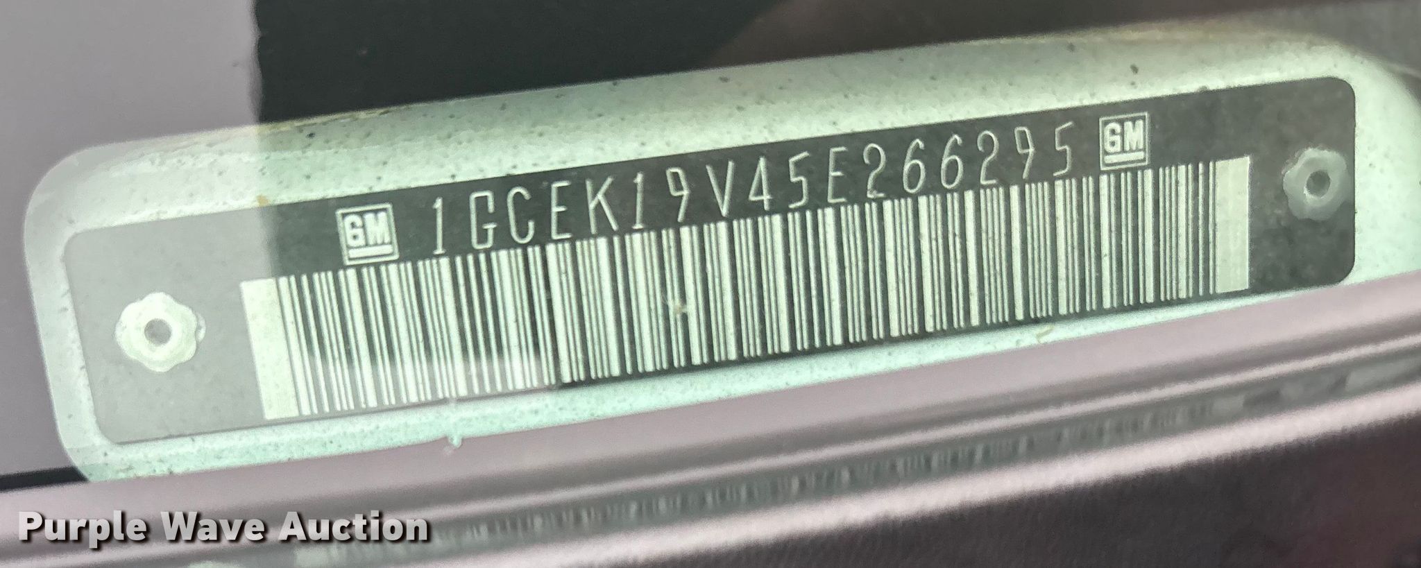 2005 Chevrolet Silverado 1500 Ext. Cab pickup truck. Miles: 67,225 on odometer, Hours: 2,148 on meter, VIN: 1GCEK19V45E266295. Engine Displacement: 4.8L V8 OHV, Cylinders: 8, Fuel type: Gas. Transmission Automatic, Four wheel drive. Interior AC, Heat, Brake controller. Features Bed Length: 8', Width: 60". Tires Size: 265/70R17. Kansas title. Title distribution may be delayed up to 14 days from verification of funds. Shawnee County, KS. Topeka, KS 66618