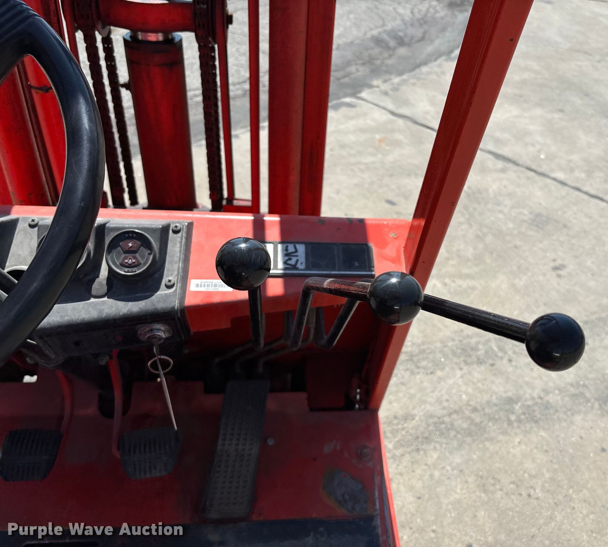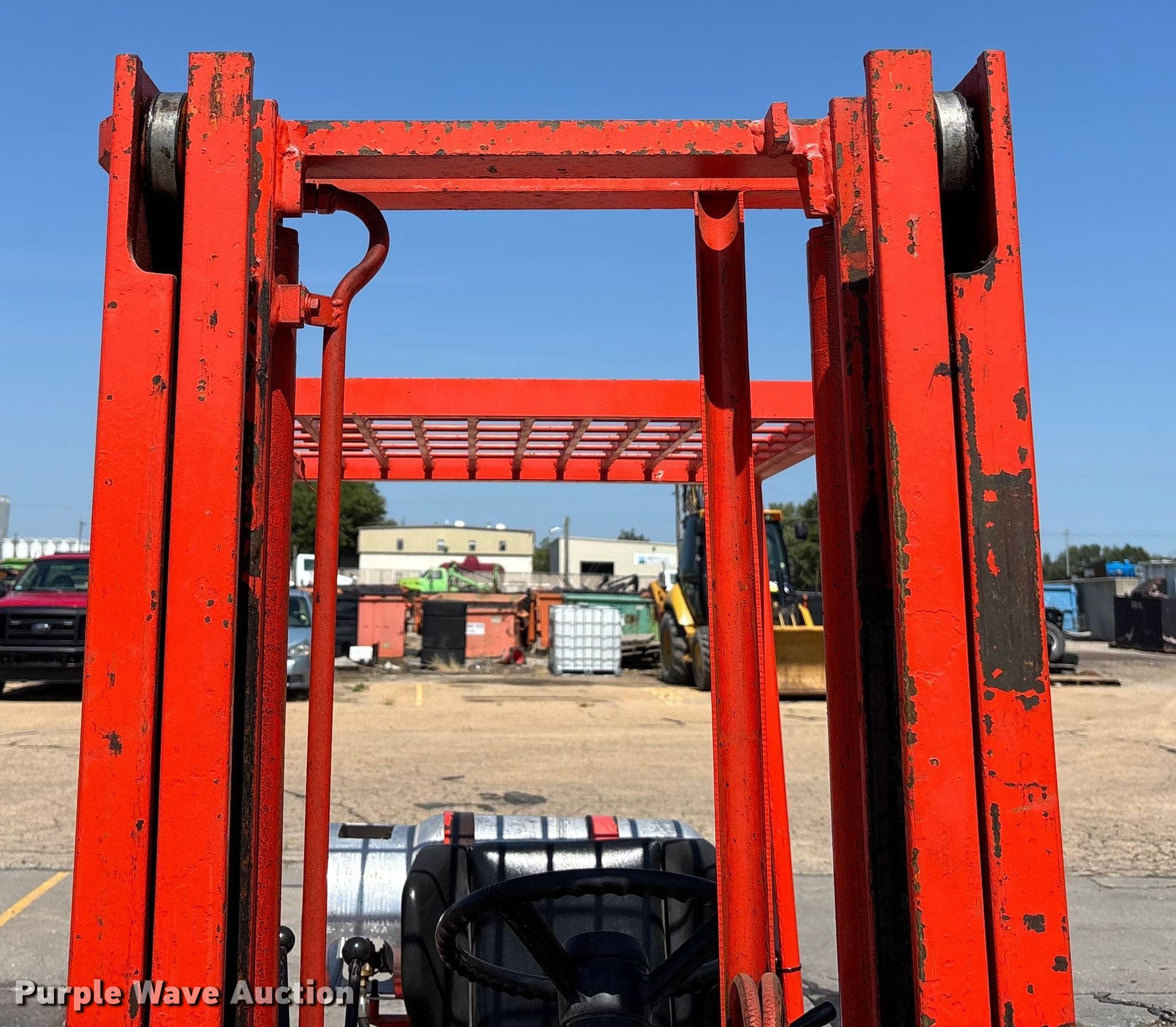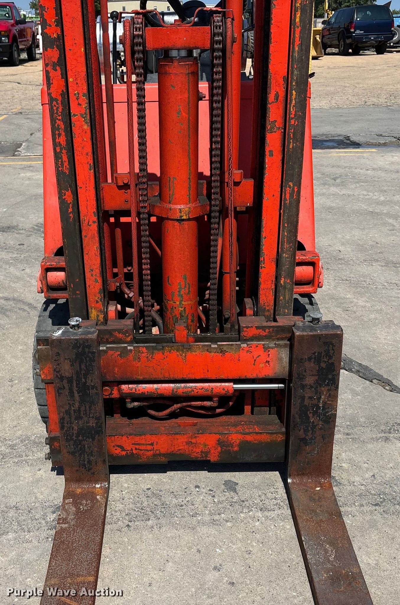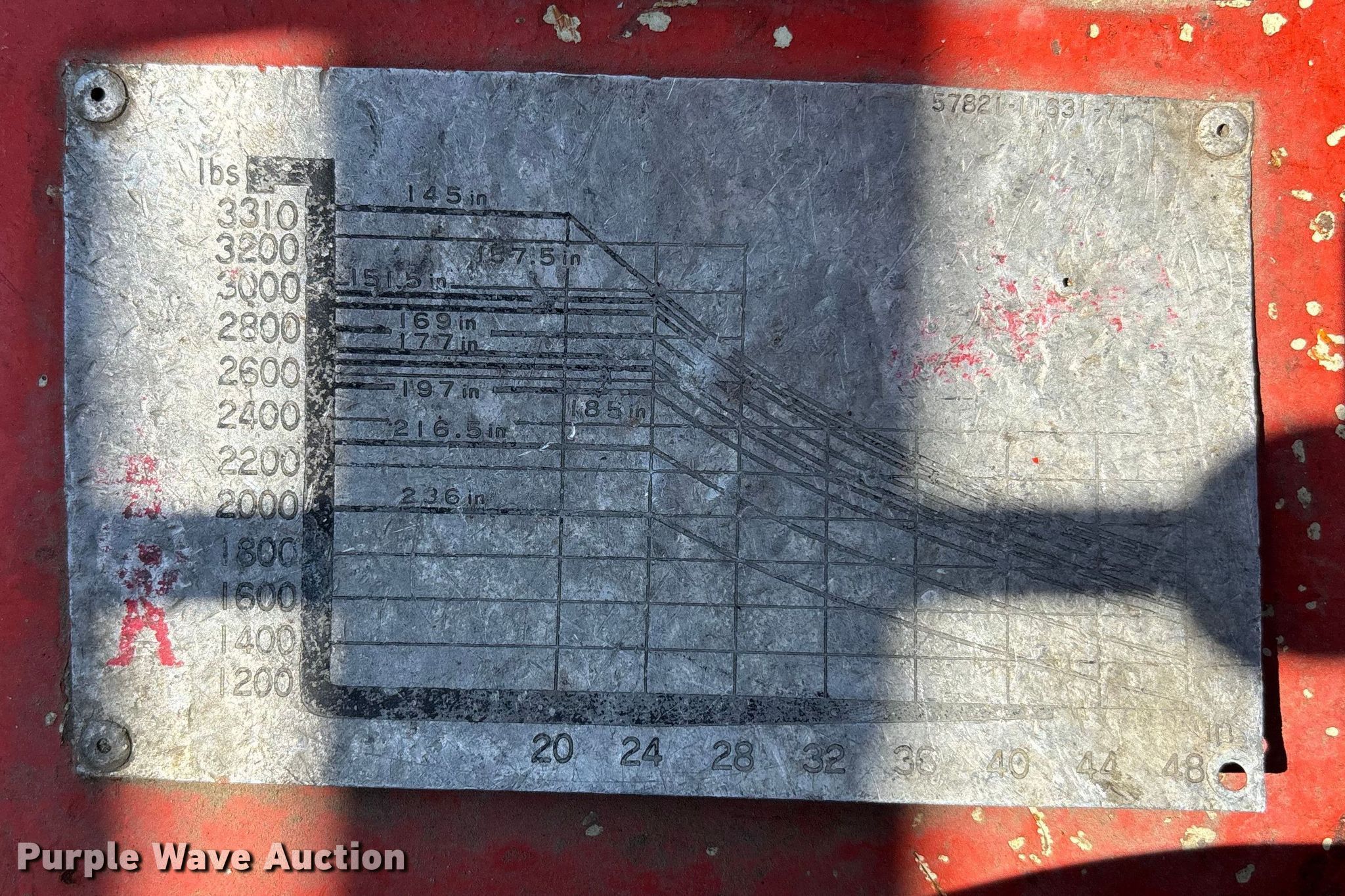 Toyota forklift. Hours: 7,090 on meter, Serial: 786A. Engine Cylinders: 4, Fuel type: LPG LP bottle: Not included. Transmission Automatic, 1F - 1R. Operators station Canopy. Features Maximum lift capacity: 3,310 lbs, Maximum lift height: 132", Collapsed mast height: 83", Mast stages: 2, Side shift, Mast tilt, Fork length: 42". Tires Front: 457x152x308, Rear: 14x4.5 R8, Solid. Shawnee County, KS. Topeka, KS 66618