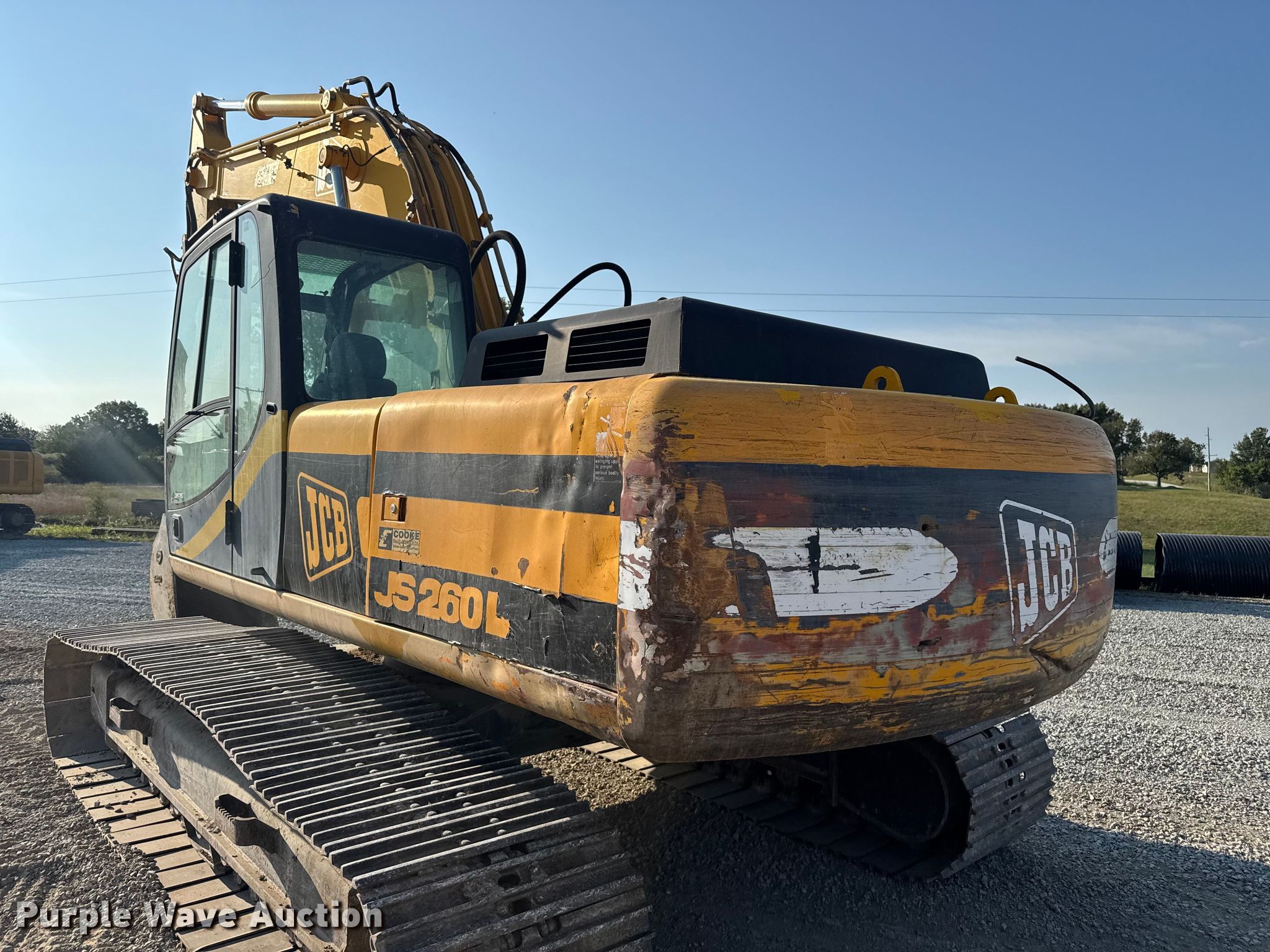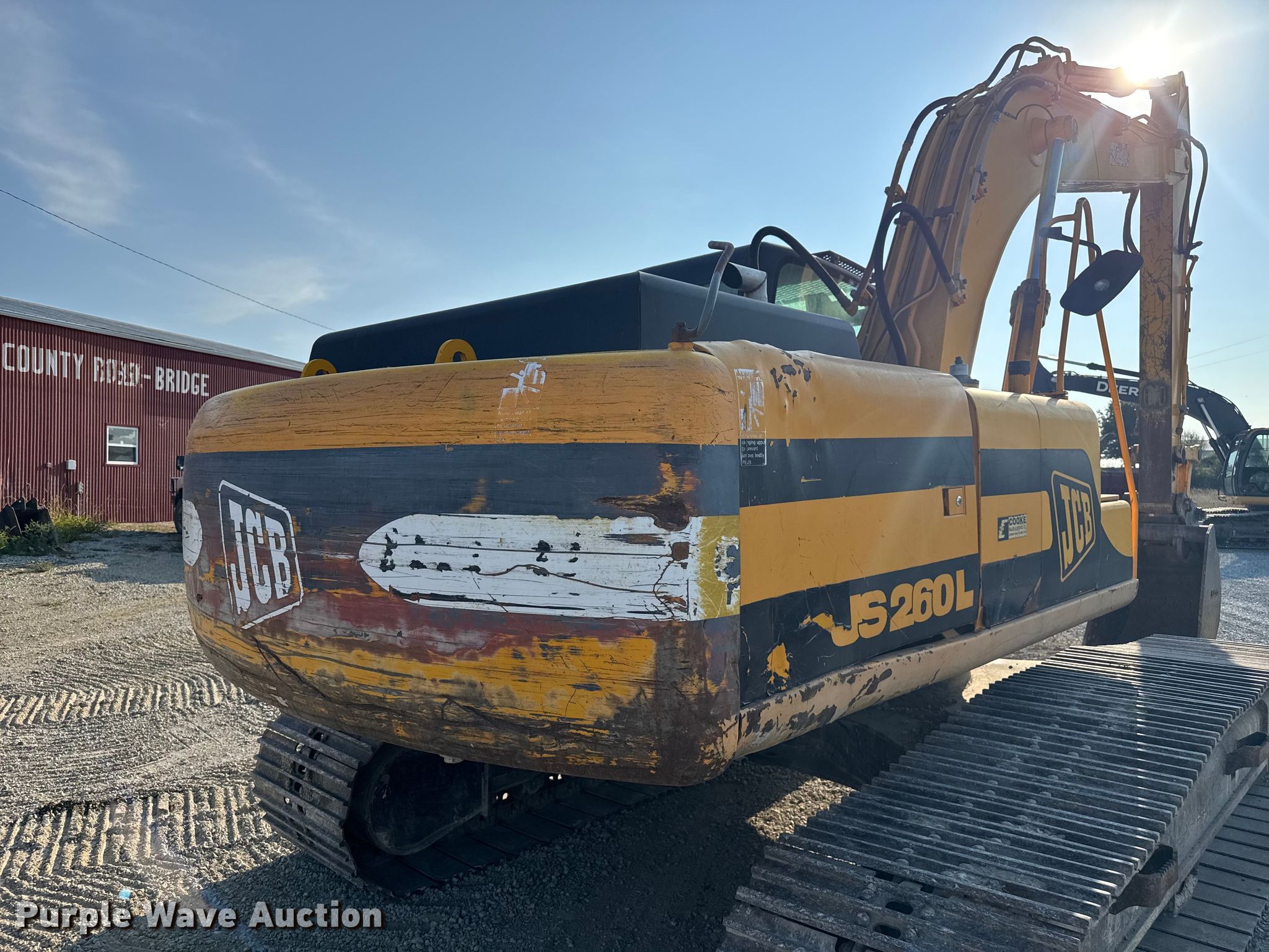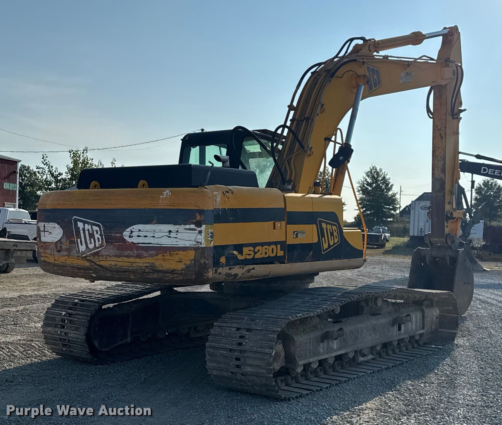 1998 JCB JS260L excavator. Hours: 4,854 on meter, Serial: 0708781. Engine Isuzu, Cylinders: 6, Fuel type: Diesel. Transmission Hydrostatic. Operators station Enclosed cab, AC, Heat. Features Auxiliary hydraulics, Boom Standard, Stick Stick length: 10', Quick coupler: Mechanical WR XLS, Bucket Esco, Width: 37", Cutting edge: Weld-on, Teeth: 5. Tracks Width: 31.5", Steel, Grouser pads: Triple. Notes Side door panels damaged, bent, Rear weight dented. Grundy County, MO. Trenton, MO 64683