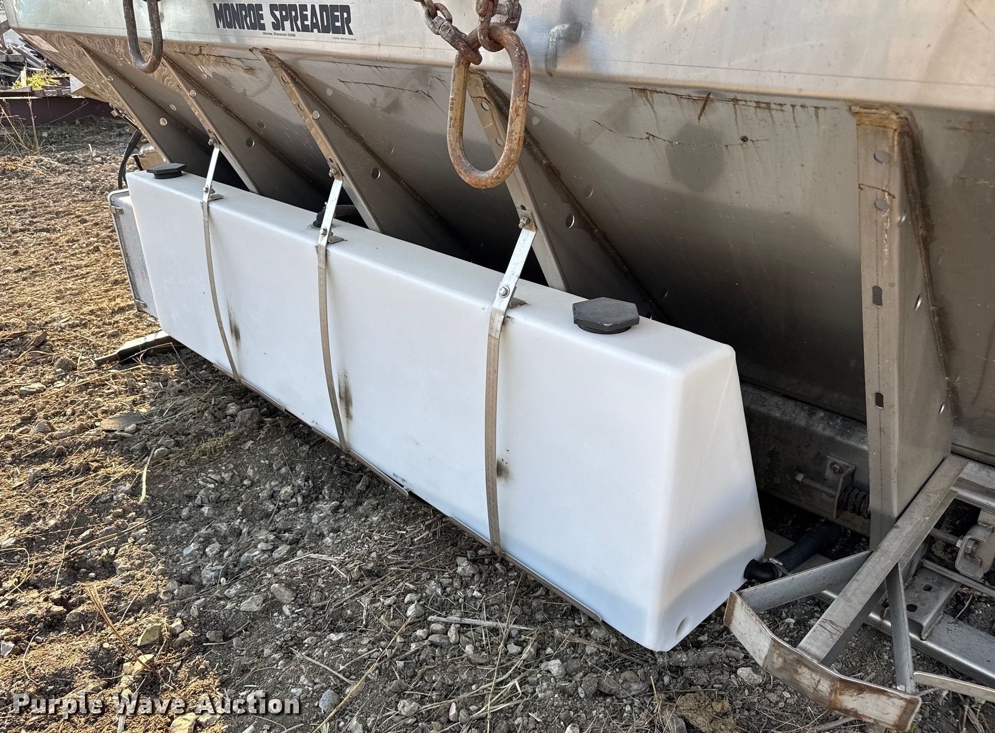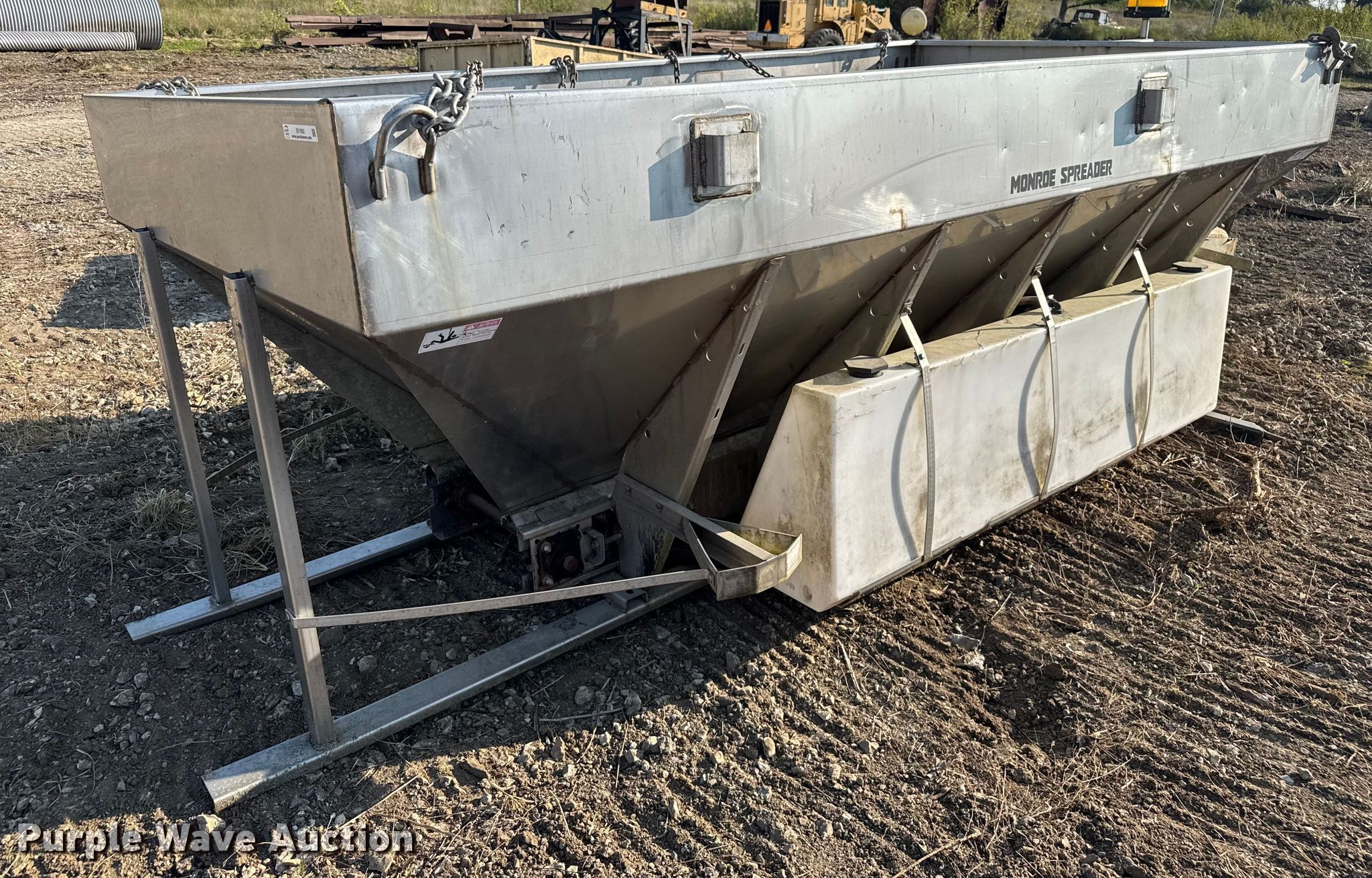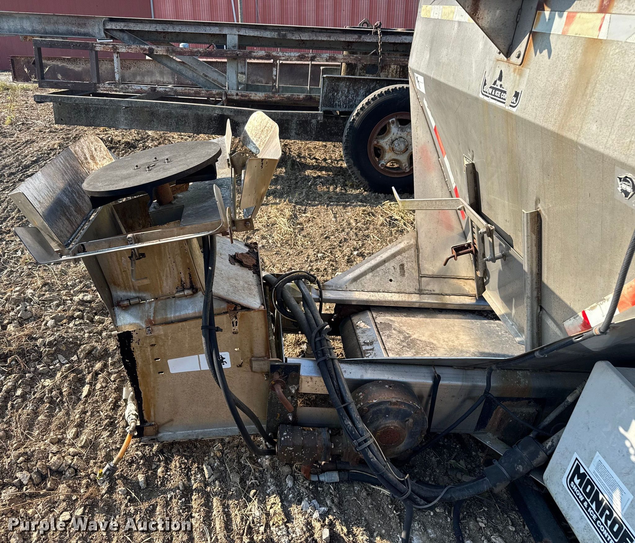 Purple Wave is selling a used Truck Part and Attach. in Missouri. This item is a Monroe spreader with the following: Serial: 03-01-8046, 13' L x 7' W, Spinner diameter: 18", (2) solution tanks, Roll tarp, Missing belt