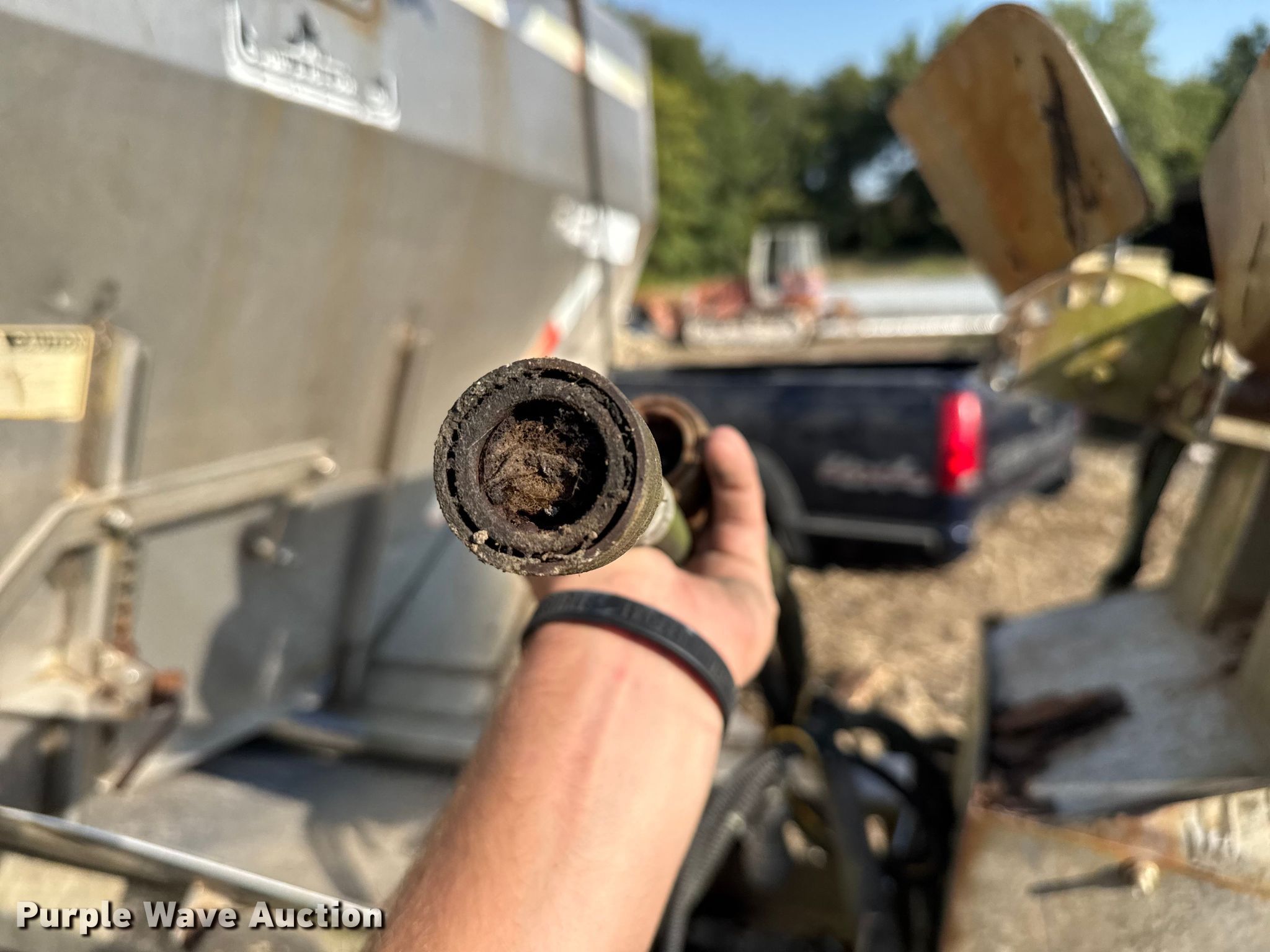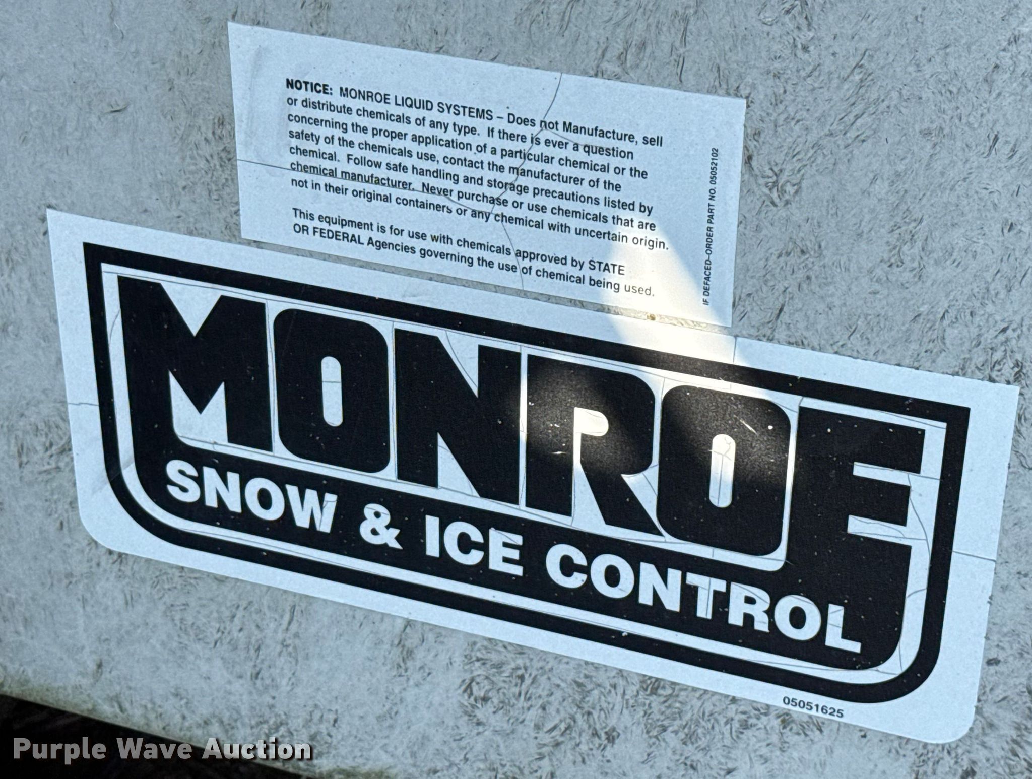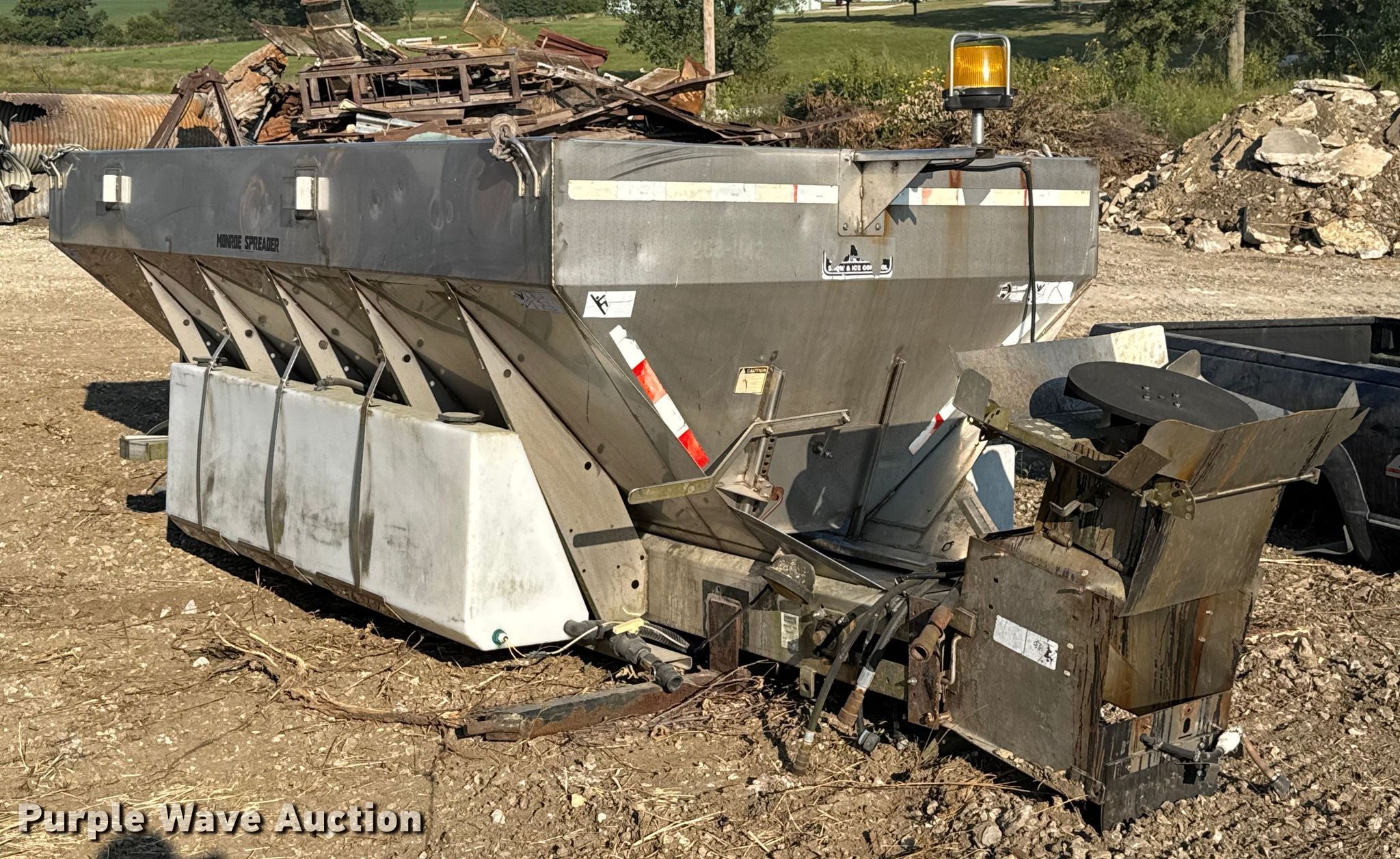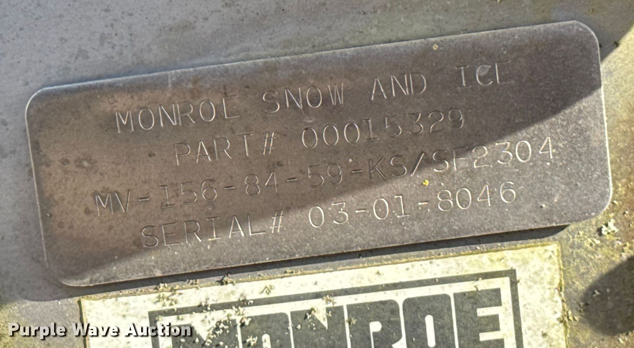 Purple Wave is selling a used Truck Part and Attach. in Missouri. This item is a Monroe spreader with the following: Serial: 03-01-8046, 13' L x 7' W, Spinner diameter: 18", (2) solution tanks, Roll tarp, Missing belt