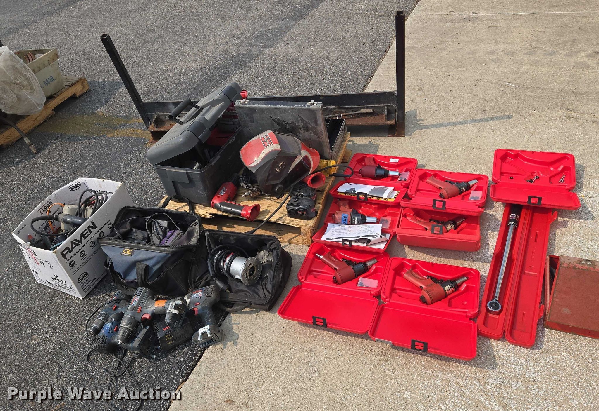 Purple Wave is selling a used Tools in Kansas. This item is a Tools with the following: (6) pneumatic riveters, Milwaukee reciprocating saw, Milwaukee concrete drill, Milwaukee vacuum pump, Metal brake, Drills, Chargers and more, Unknown operating conditions
