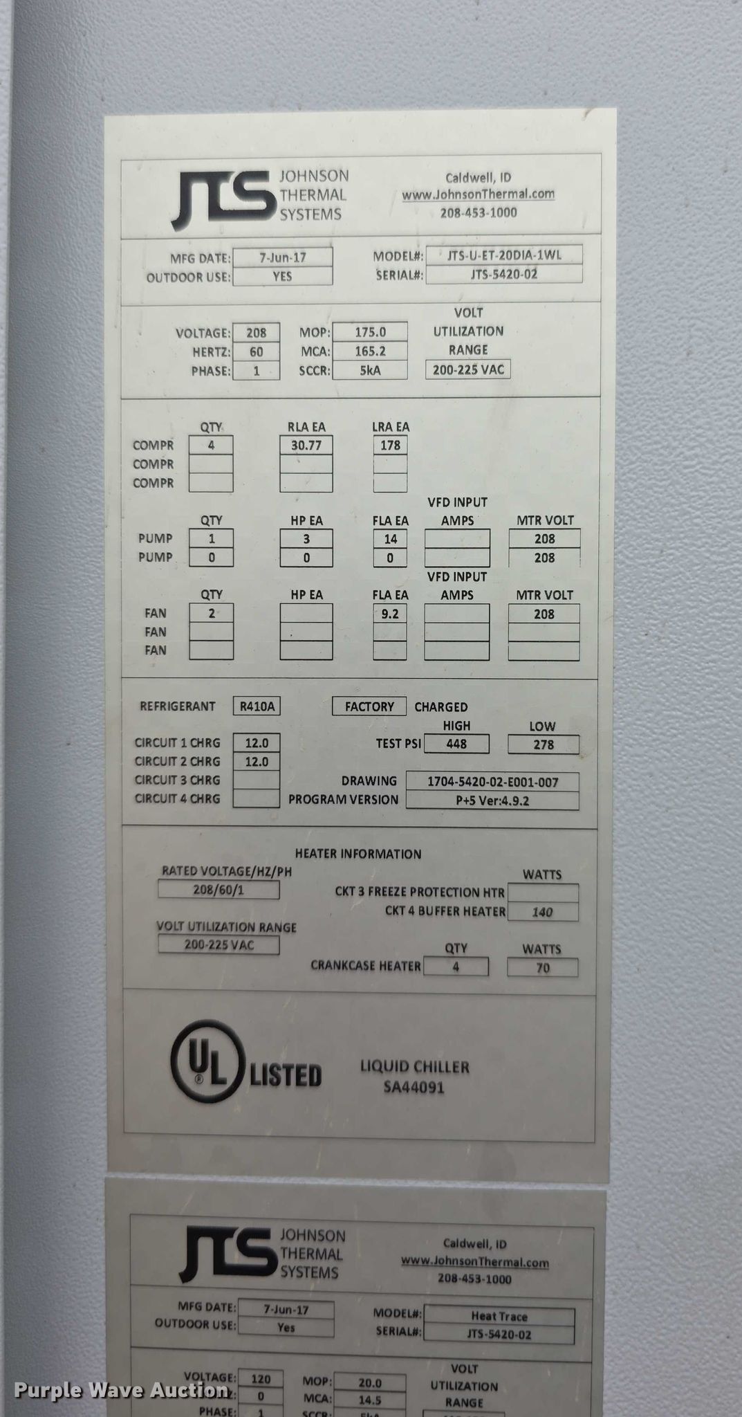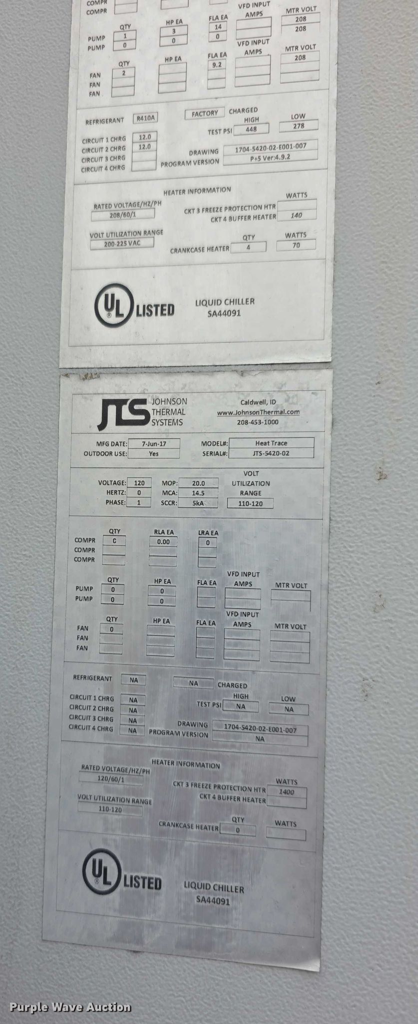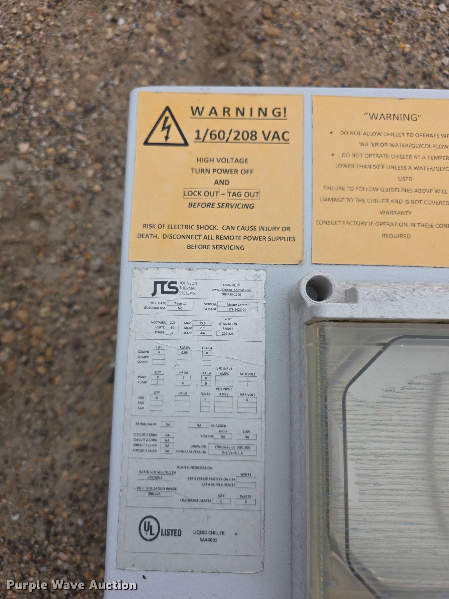 Purple Wave is selling a used Other Industrial or Business in Kansas. This item is a 2017 Johnson Thermal JTSUET20DIA1WL chiller with the following: Serial: JTS542002, Phase: Single, Volts: 208, Breaker box, Location #: 62022