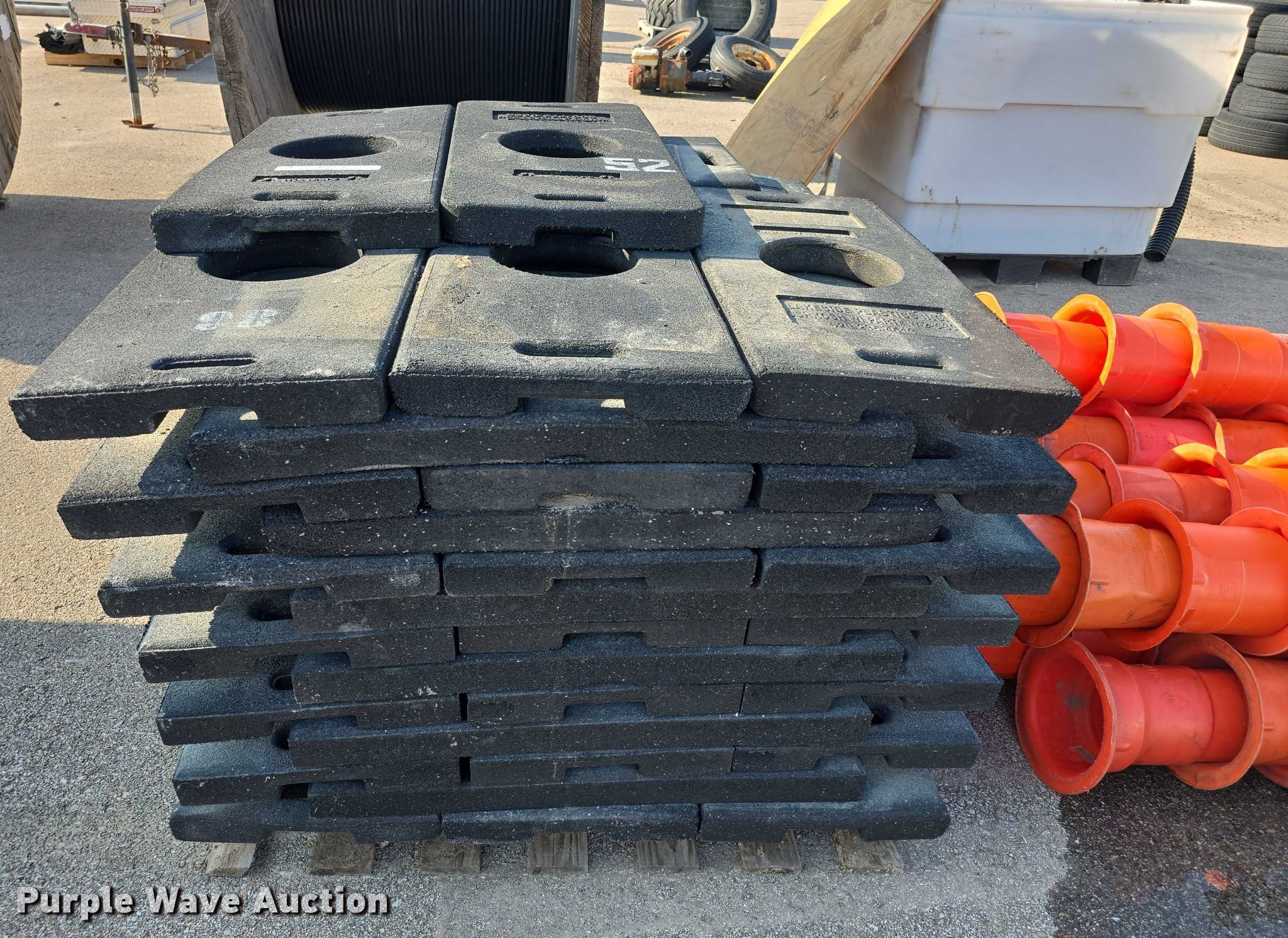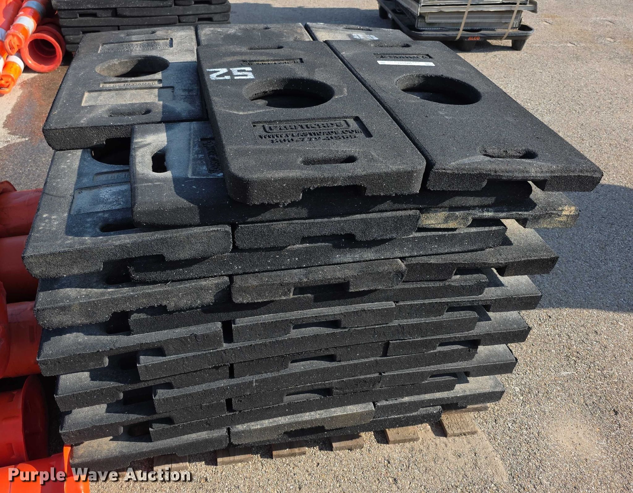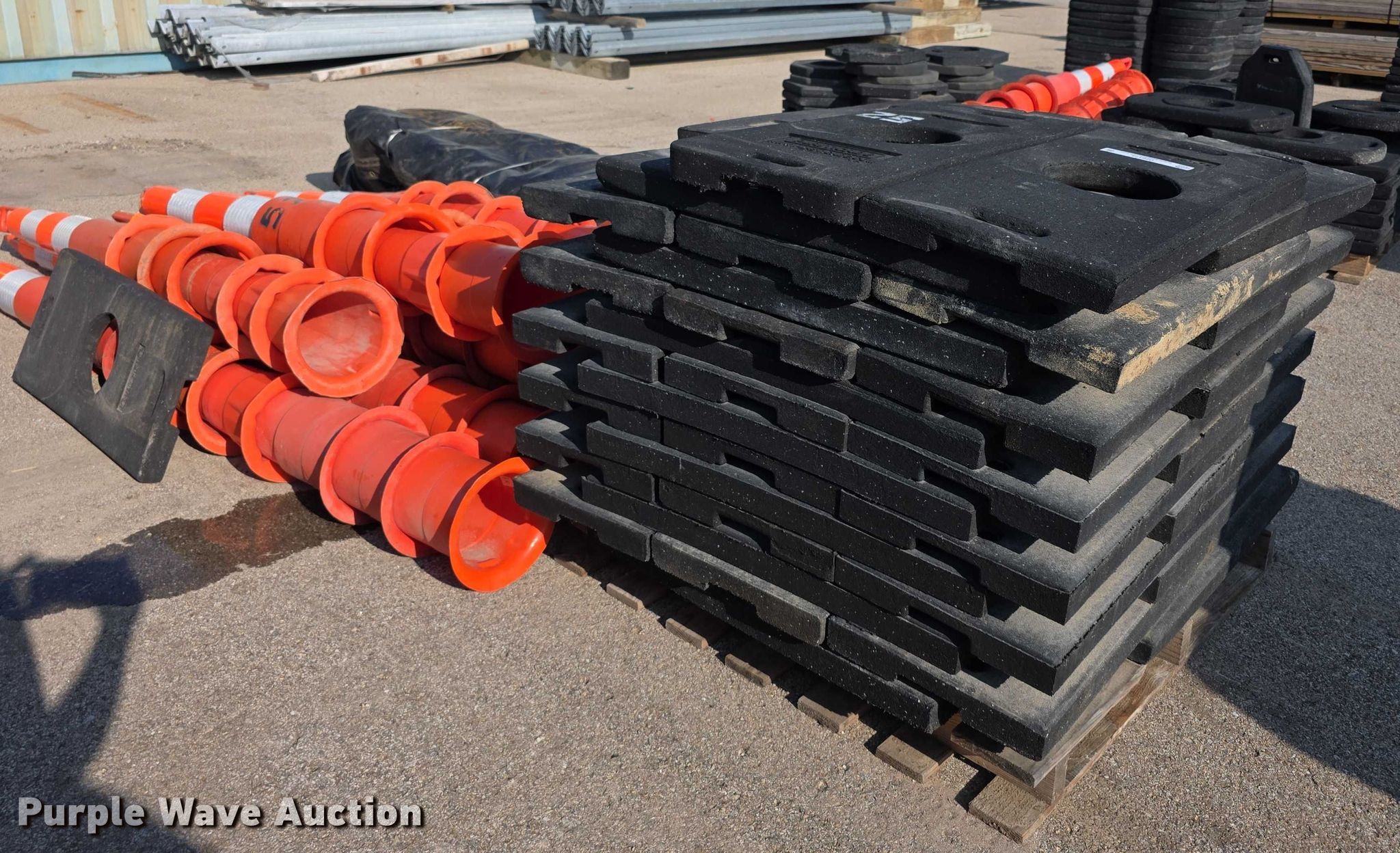 Purple Wave is selling a used Road Safety Equip. in Kansas. This item is a Road safety equipment with the following: Approx. 56 traffic cone bases, 30" x 14", Approx. 69 traffic cones, (2) concrete blankets