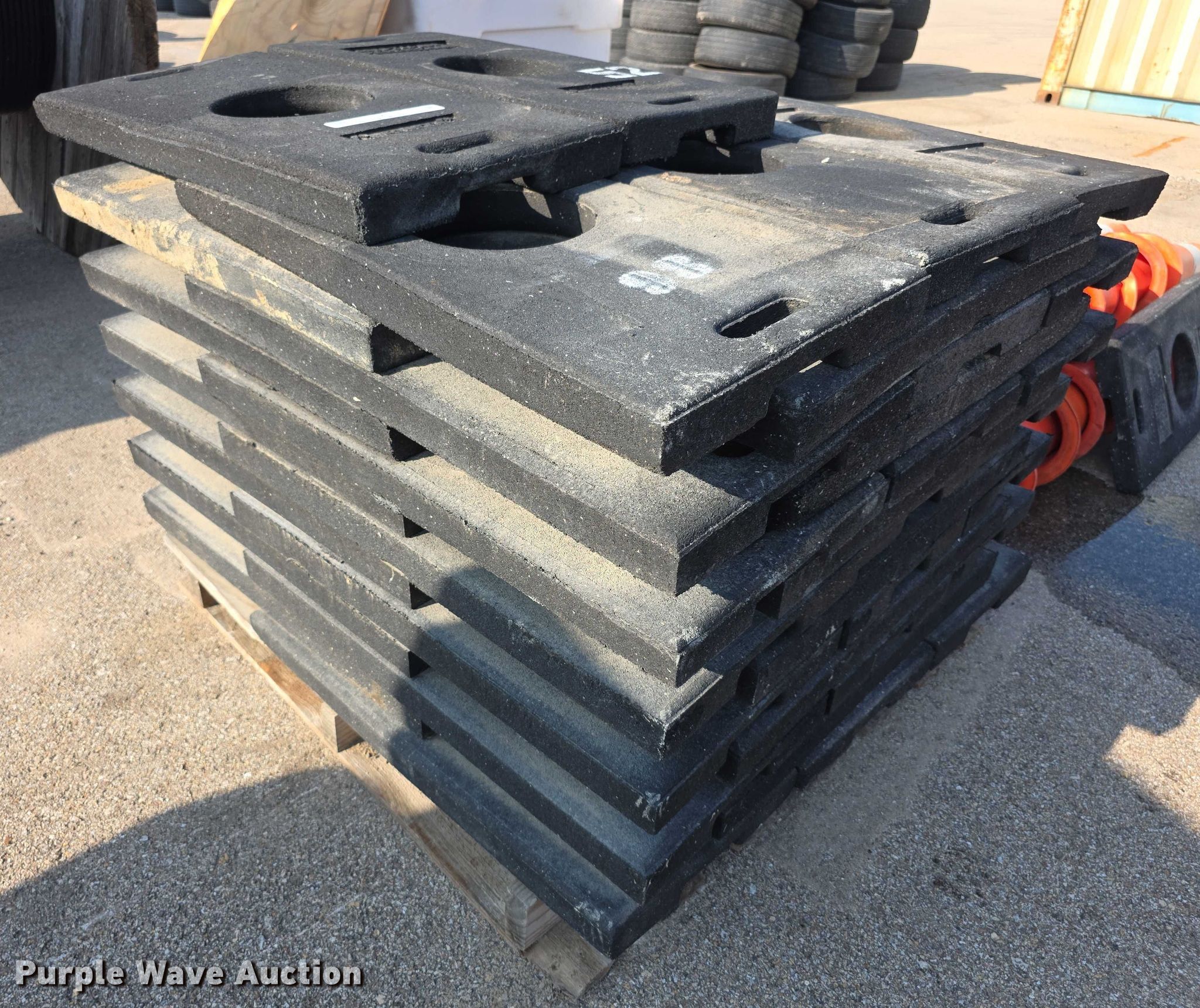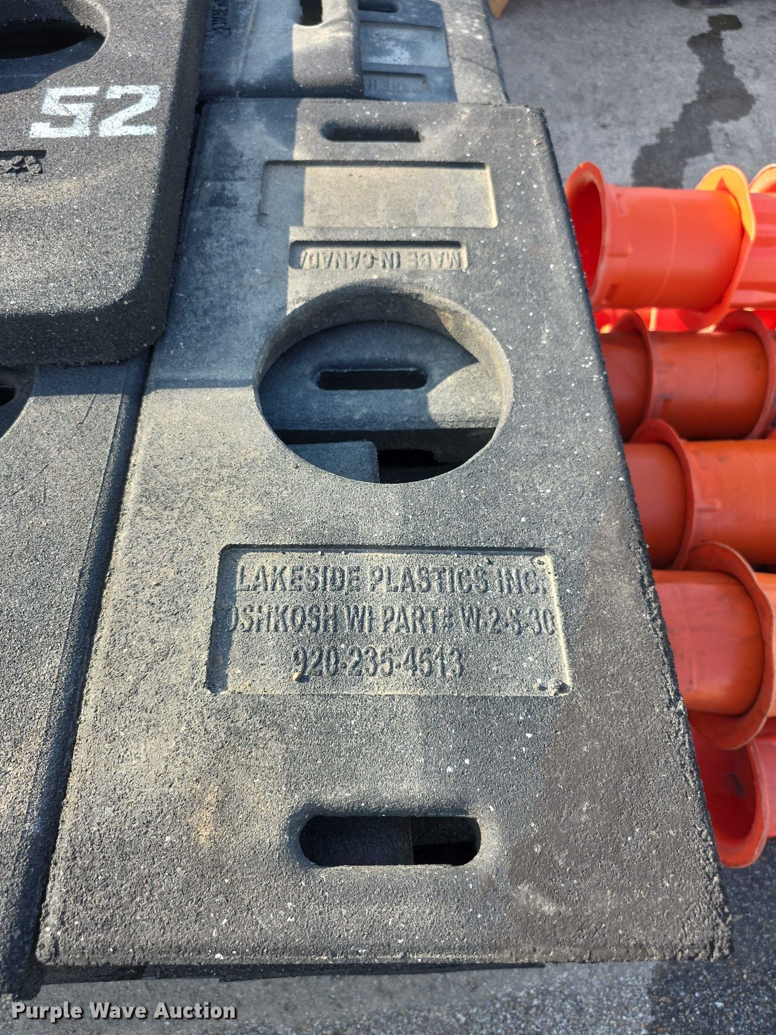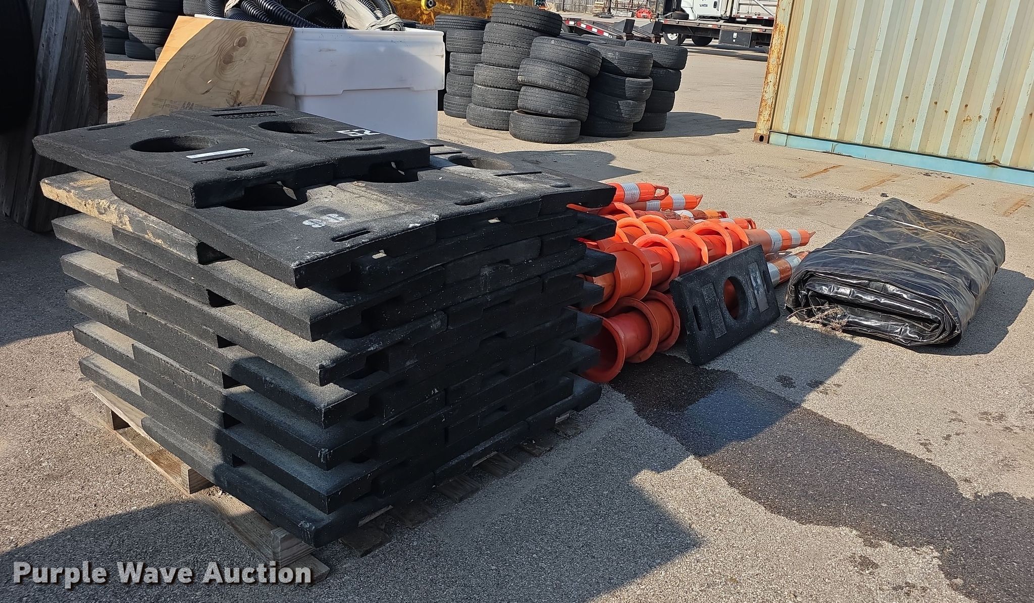 Purple Wave is selling a used Road Safety Equip. in Kansas. This item is a Road safety equipment with the following: Approx. 56 traffic cone bases, 30" x 14", Approx. 69 traffic cones, (2) concrete blankets