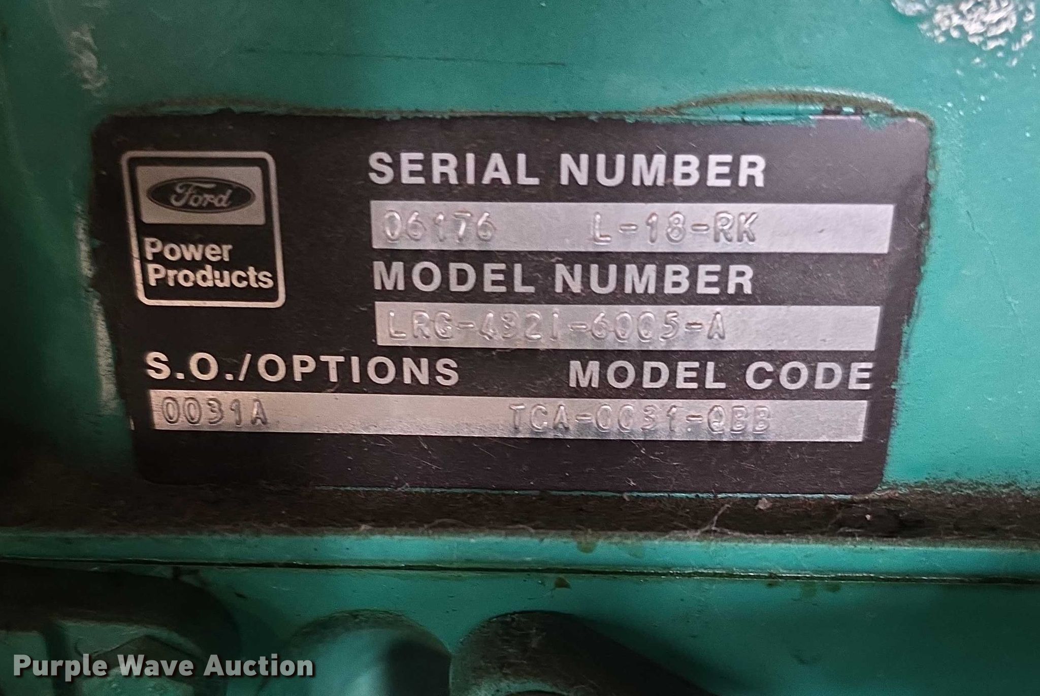 Cummins 20ES generator. Hours: 868 on meter, Serial: E960606852, Location #: 62022. Engine Ford LRG43216005A, Serial: 06176L18RK, Cylinders: 4, Fuel type: LPG. Features Generator Onan, kVA: 20, kW: 20, Phase: Single, Skid mounted. Kansas Turnpike Authority. Lawrence, KS 66044