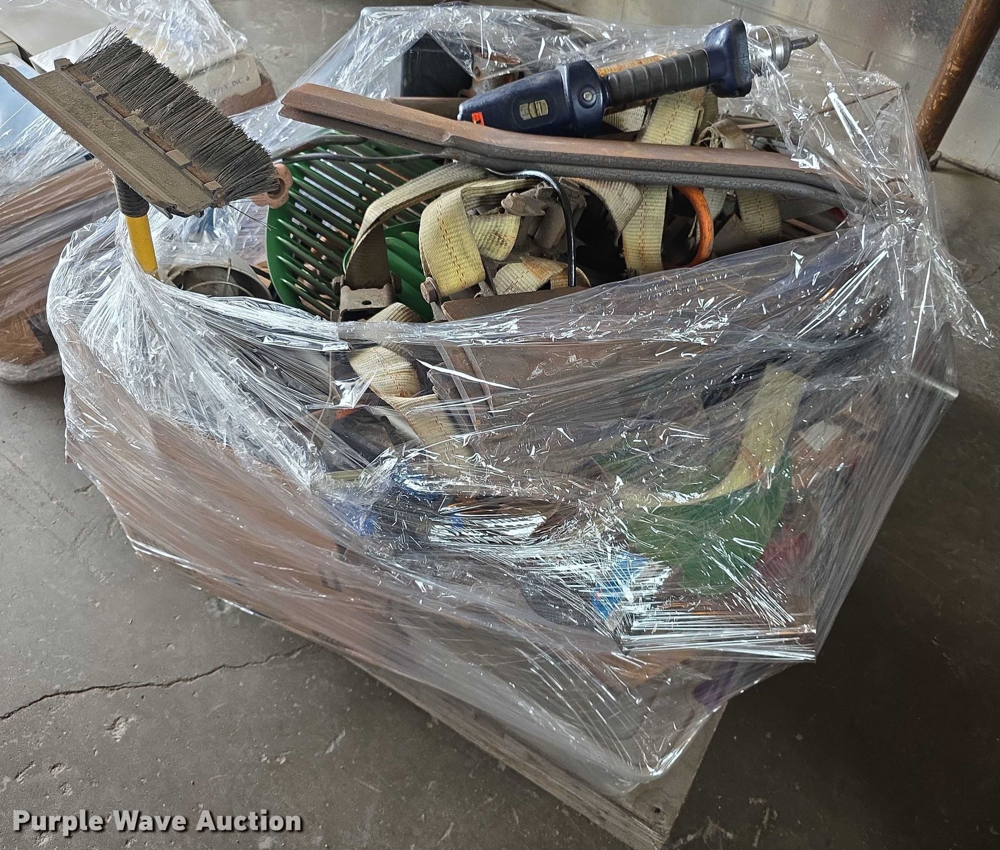 Purple Wave is selling a used Tools in Kansas. This item is a Tools with the following: John Deere tractor parts, Binders, Tie downs, Mower blades, Grease gun and more