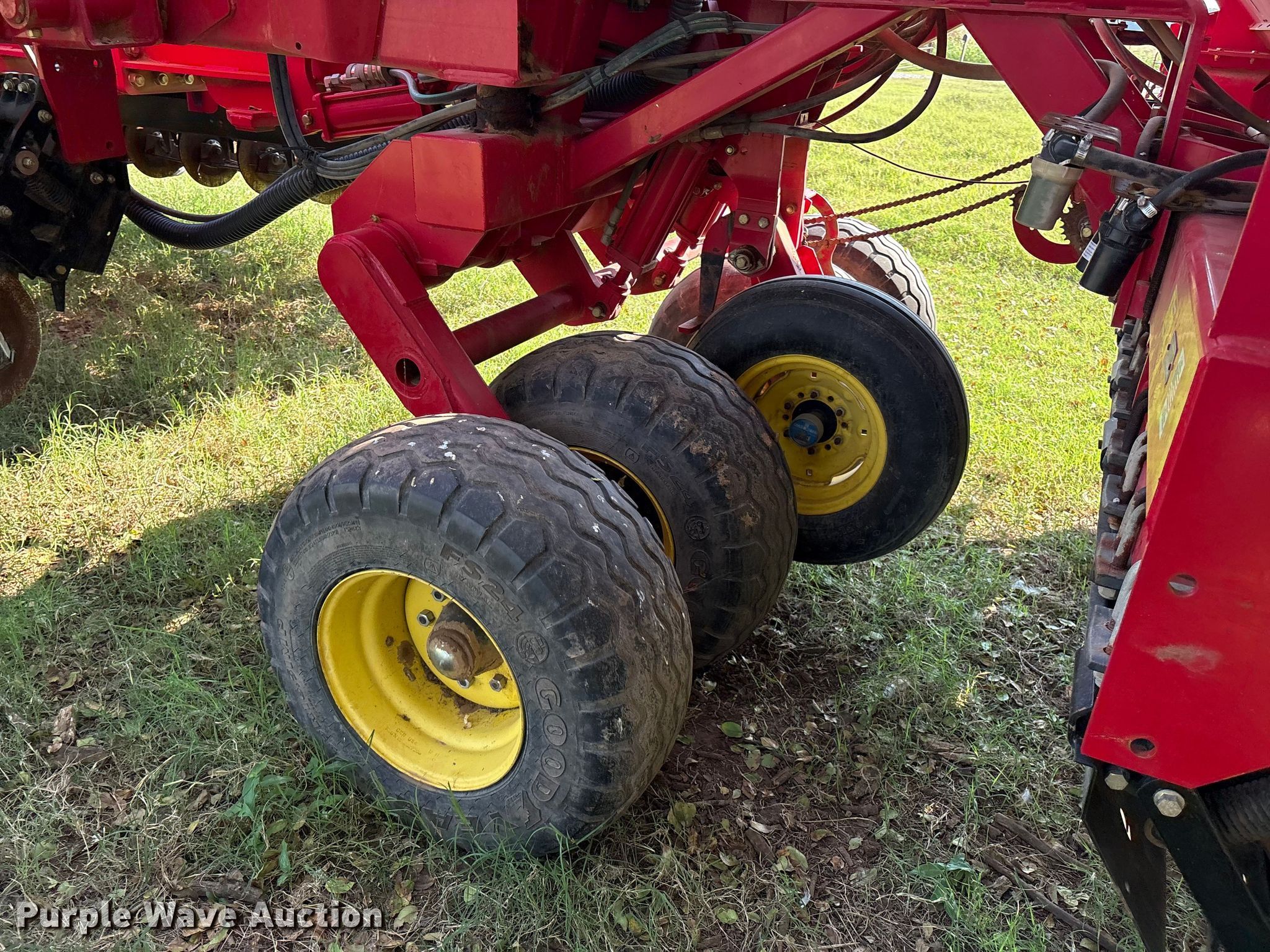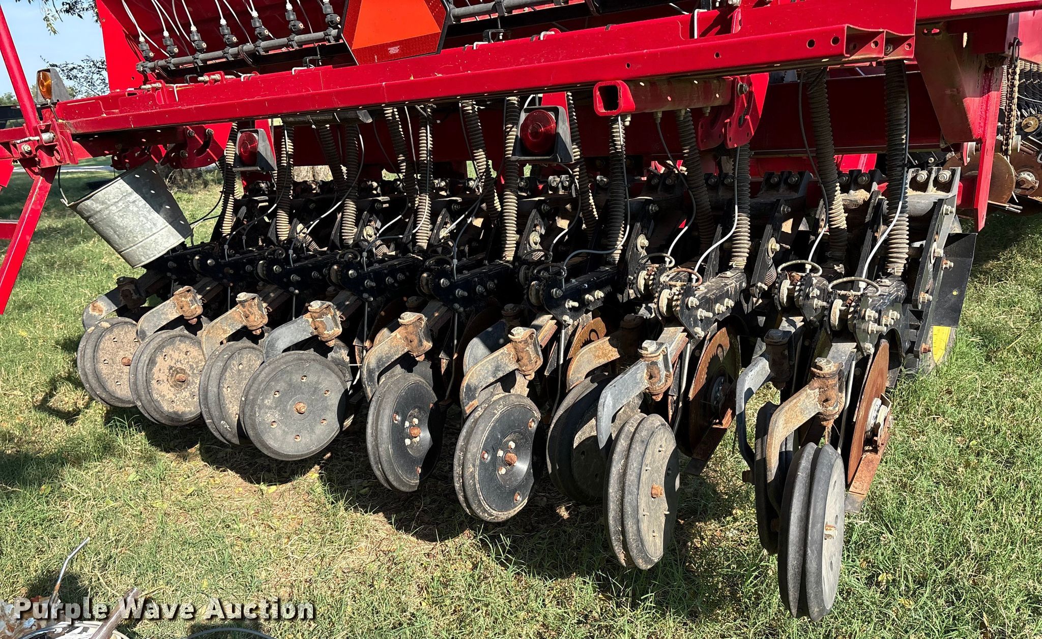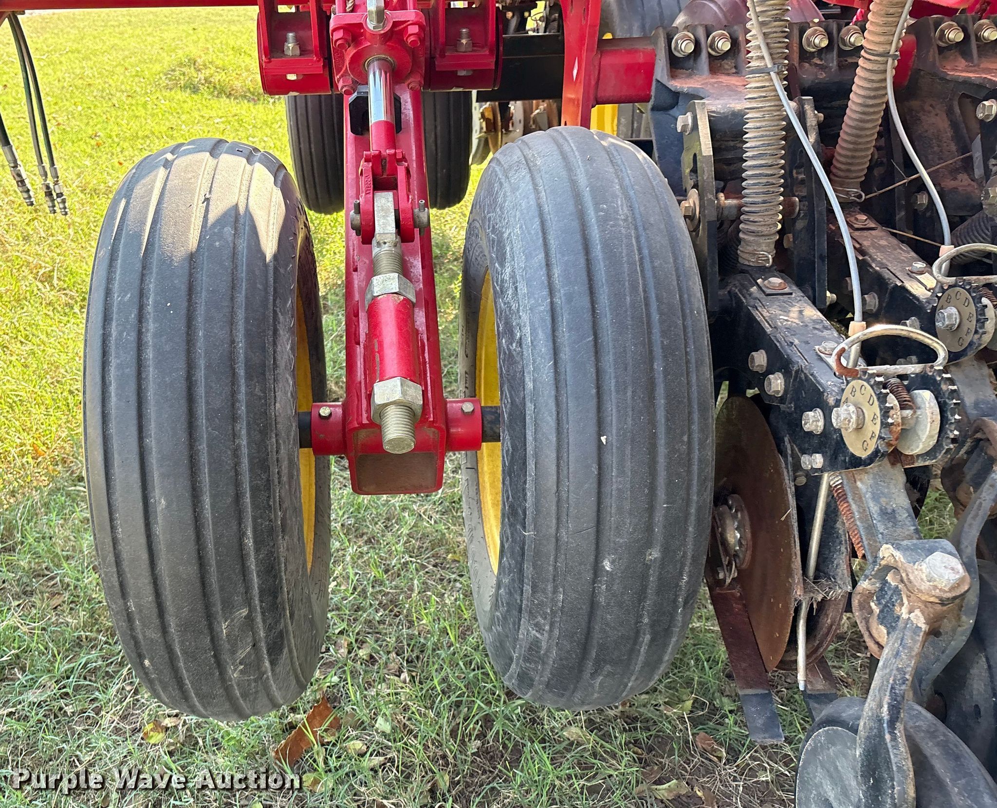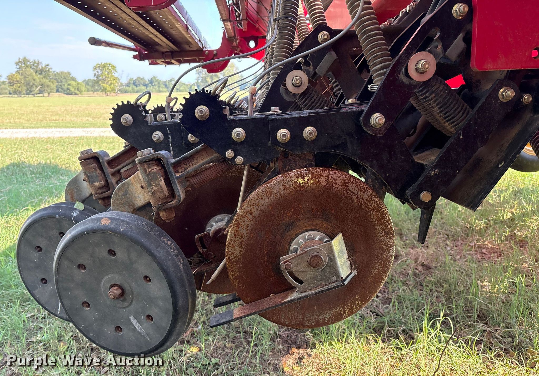 Sunflower 9435 planter. Width: 30', Row units: 48, Row spacing: 7". Features Frame Hitch: Two point, Split row spacing: 15", Fold type: Front, Pivot, Seed delivery Bulk fill system, Row units Disk openers: Double, Gauge wheels: Double, Closing system: Single Type: Rubber.. Tires Transport tire size: 380/55r16.5 Quantity: 4, Drive/ outside tire size: 9.5L-15SL Quantity: 12. Ellis Farms Retirement Auction. Wayne, OK 73095