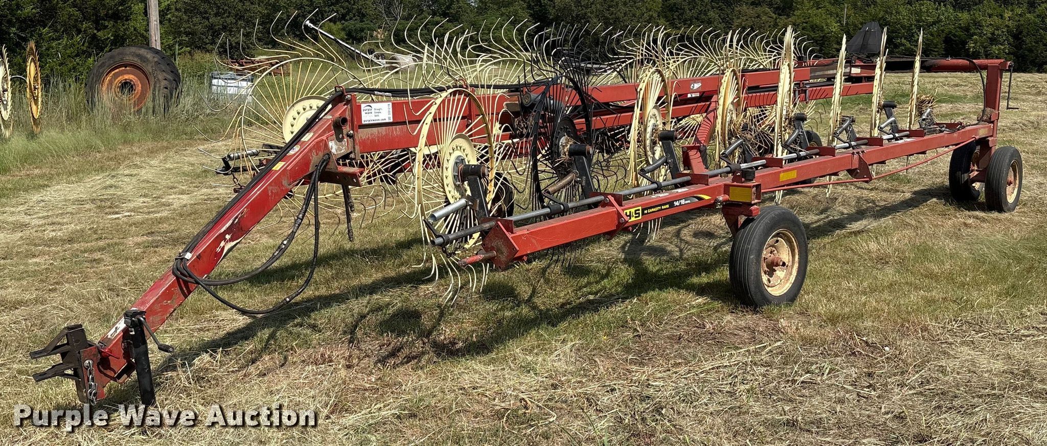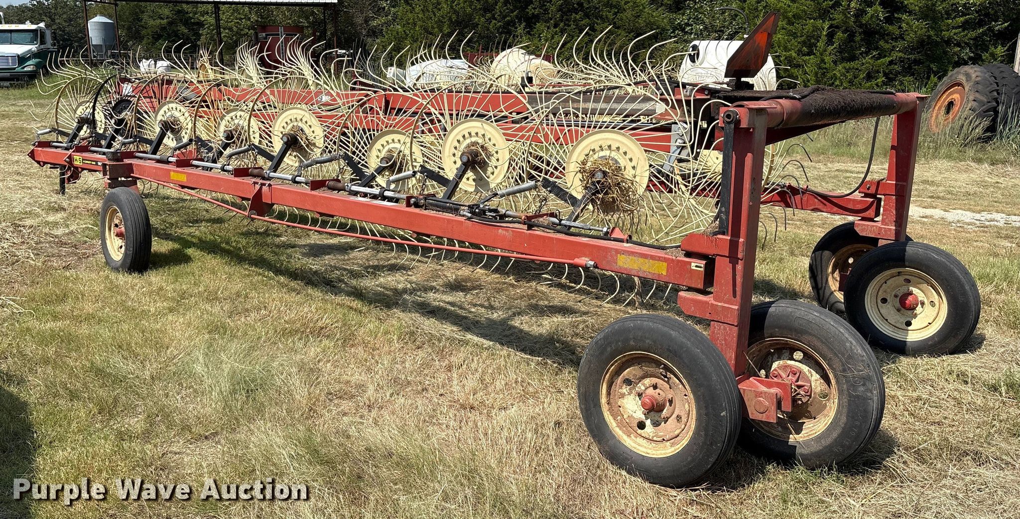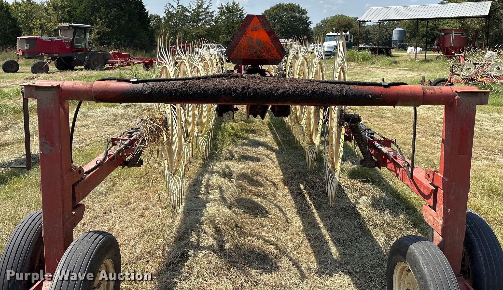 Purple Wave is selling a used Hay Rake in Oklahoma. This item is a H&S 14/16WHL hay rake with the following: Width: 44', Wheels: 16, Diameter: 56", Hydraulic fold, Ground driven