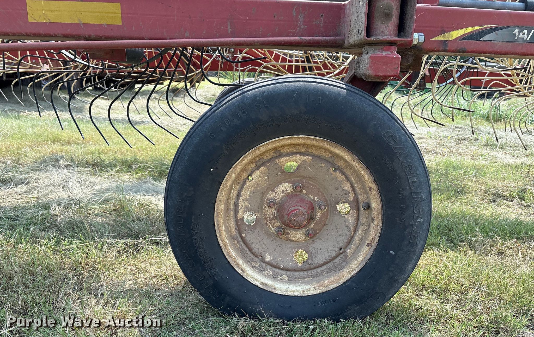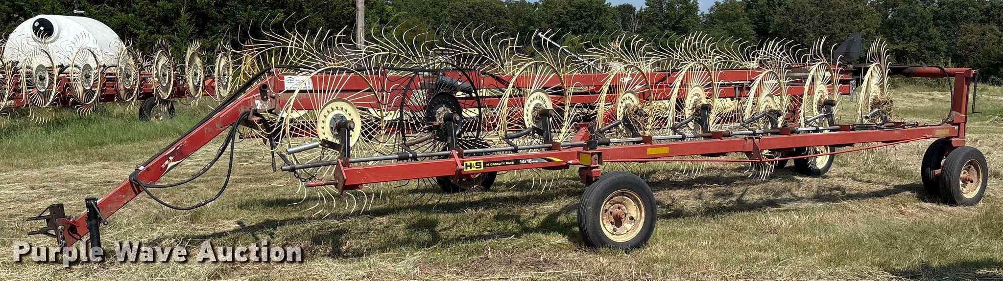 H&S 14/16WHL hay rake. Features. Width: 44', Wheels: 16 Diameter: 56", Hydraulic fold, Ground driven. Tires Size: 6.7-15SL. Ellis Farms Retirement Auction. Wayne, OK 73095