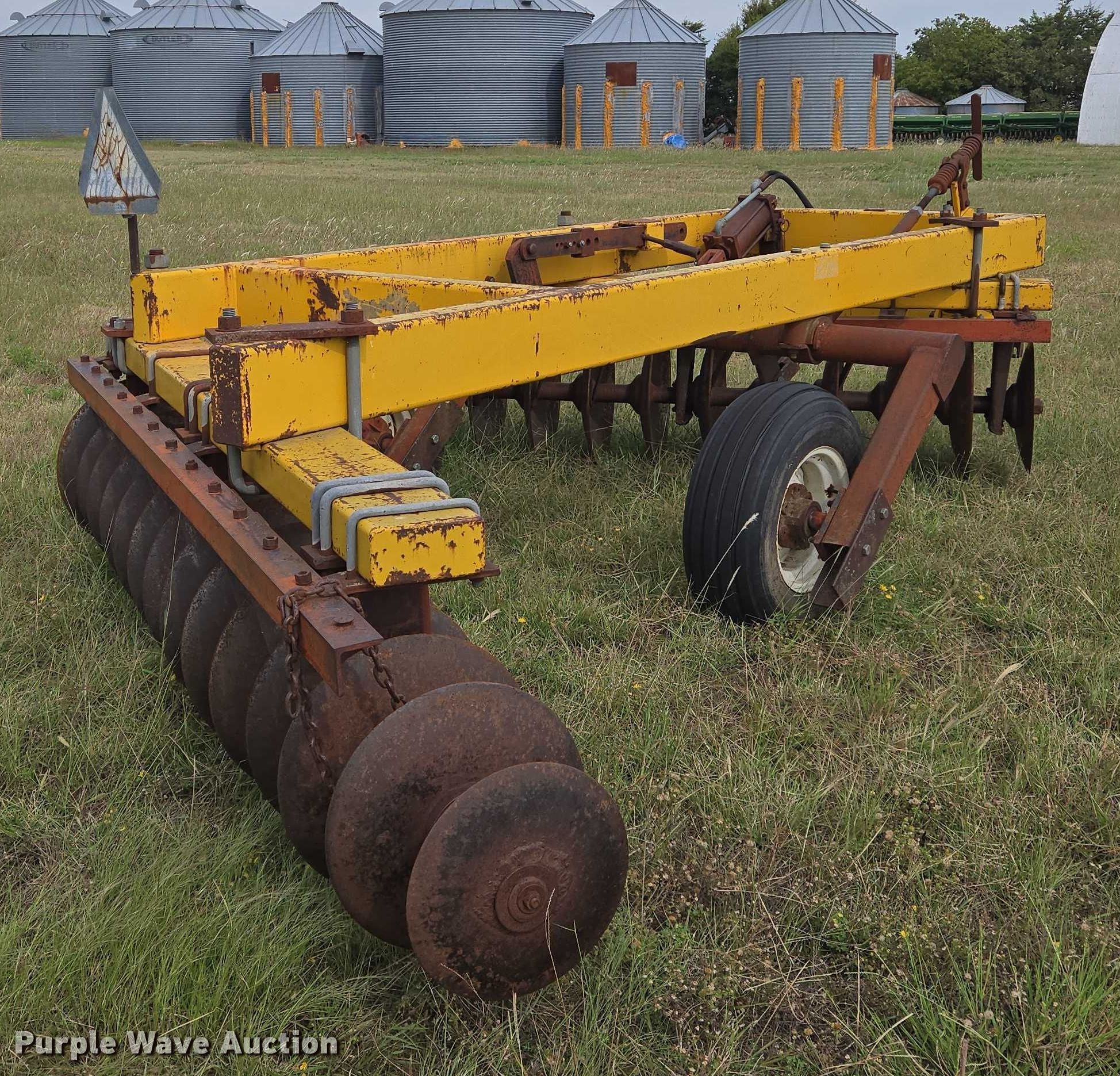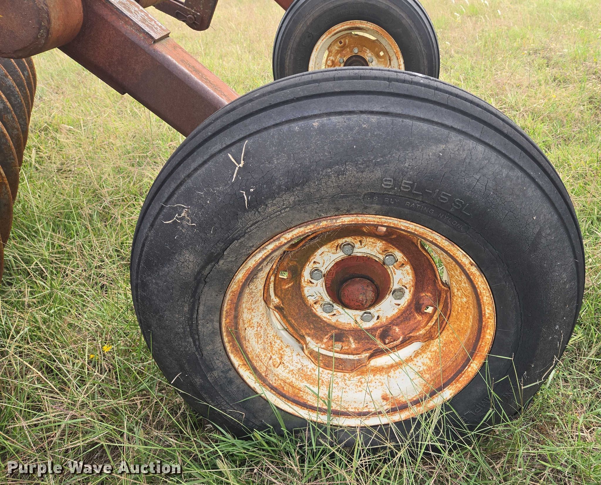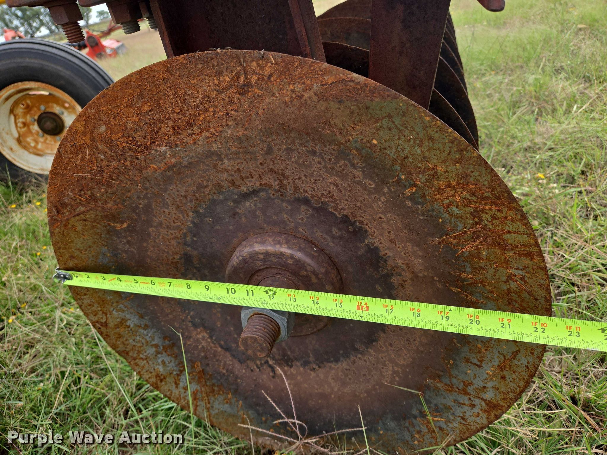 Wilbeck W11249 tandem off-set disk. Overall width: 12', Serial: 724. Features Front blades Diameter: 19", Spacing: 8", Rear blades Diameter: 22", Spacing: 9.5", Disk scrapers, Operation Hydraulic lift. Tires Tire size: 9.5L-15. S&S Farms. Pratt, KS 67124