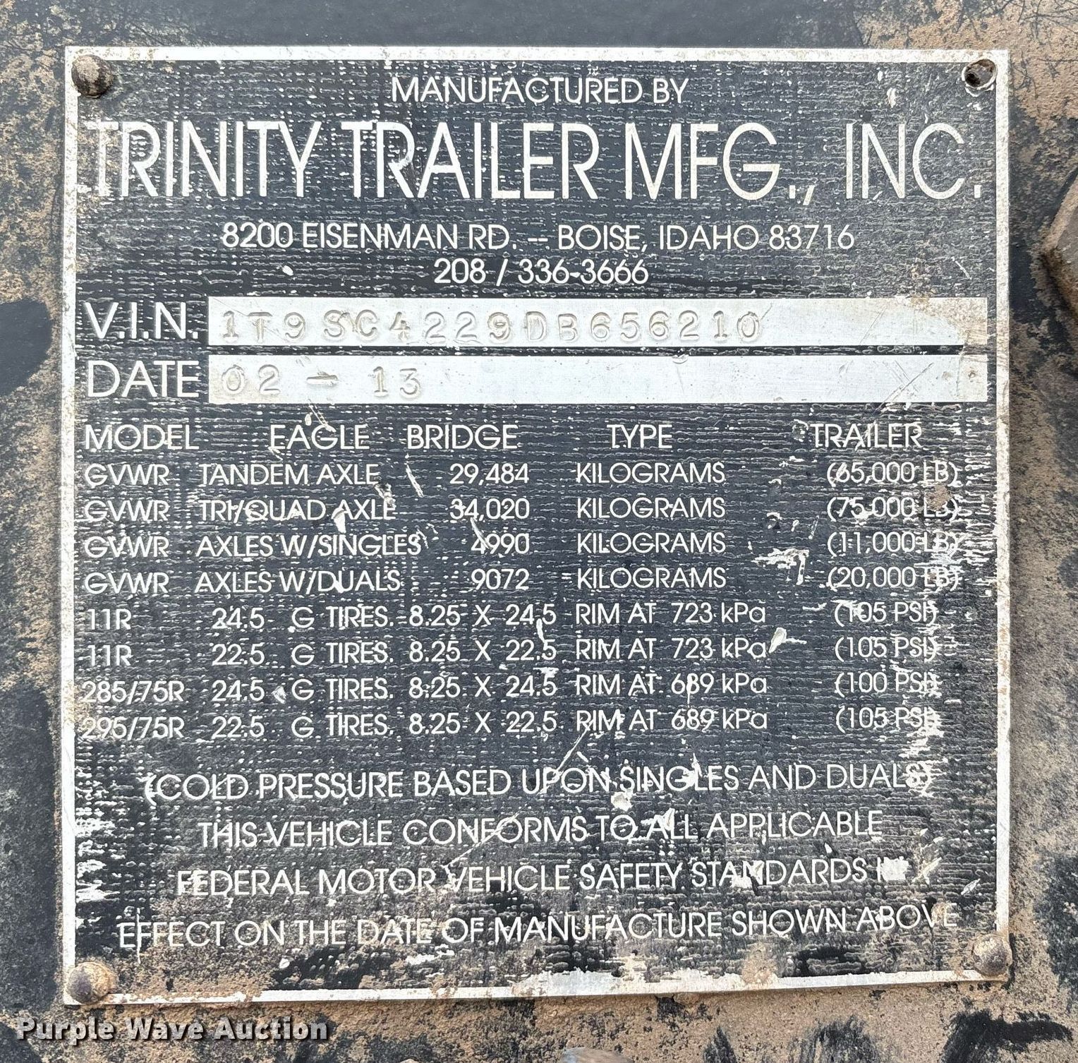 2013 Trinity Eagle Bridge live bottom trailer. VIN: 1T9SC4229DB656210. Dimensions Overall: 42' L x 102" W, Body: 40' L x 102" W, Side height: 76". Features Body type: Steel, Floor: Belted bottom Belt/ chain width: 55". Chassis Landing gear: Dual, Suspension: Air, Brakes: Air, Axles: Tandem, GVWR: 65,000 lbs. Tires Aluminum wheels, Size: 285/75R24.5. Lender owned. Item condition and history are unknown. Texas title. Title distribution may be delayed up to 30 days from verification of funds. First Financial Bank. Hereford, TX 79045