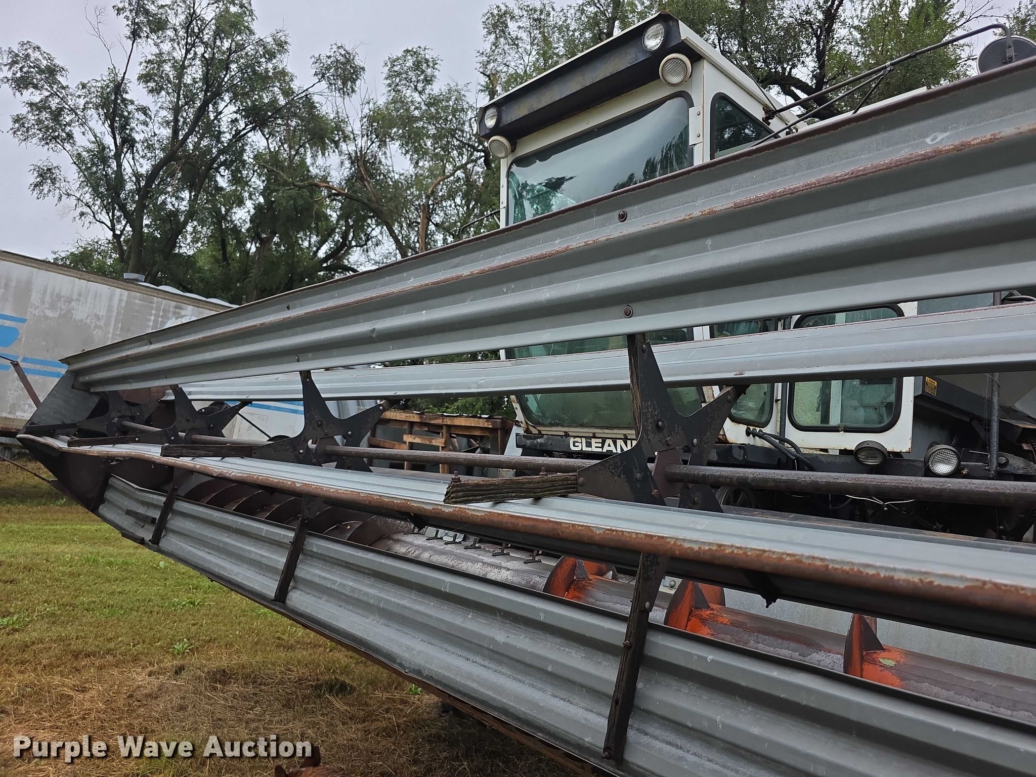 Gleaner M2 combine. Engine hours: 2,760 on meter, Separator hours: 504 on meter, Serial: M16013. Engine Model: 649T, Cylinders: 6, Fuel type: Diesel, HP: 130. Transmission Hydrostatic. Operators station AC, Heat. Features Chaff spreader, Straw chopper, Unloading auger length: 14', Header Gleaner LM, Serial: 6071, Row crop head All-crop, Single point coupler, Platform head Rigid, Reel: Bat, Skid plates: Steel. Tires Front: 23.1-30, Rear: 11.00-16, Brand: Firestone. Notes Battery missing, Unknown operating condition of AC, Heat, Unknown operating condition. Tescott, KS 67484