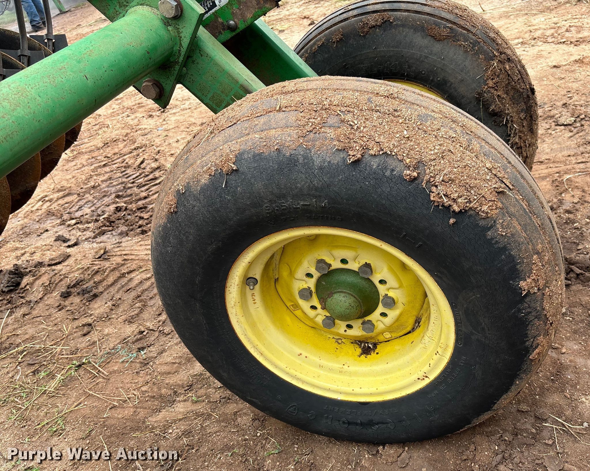 John Deere 630 tandem disk. Overall width: 23', Serial: N00630X006959. Features Front blades Diameter: 18", Spacing: 9", Rear blades Diameter: 18", Spacing: 9", Disk scrapers, Operation Hydraulic lift, Hydraulic fold, Leveler: Manual. Tires Tire size: 9.5L-14. Viola, KS 67149