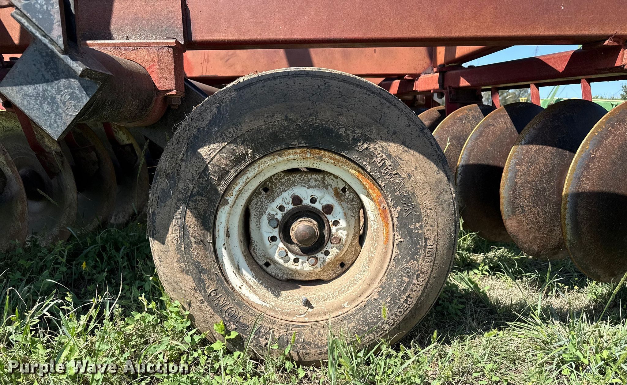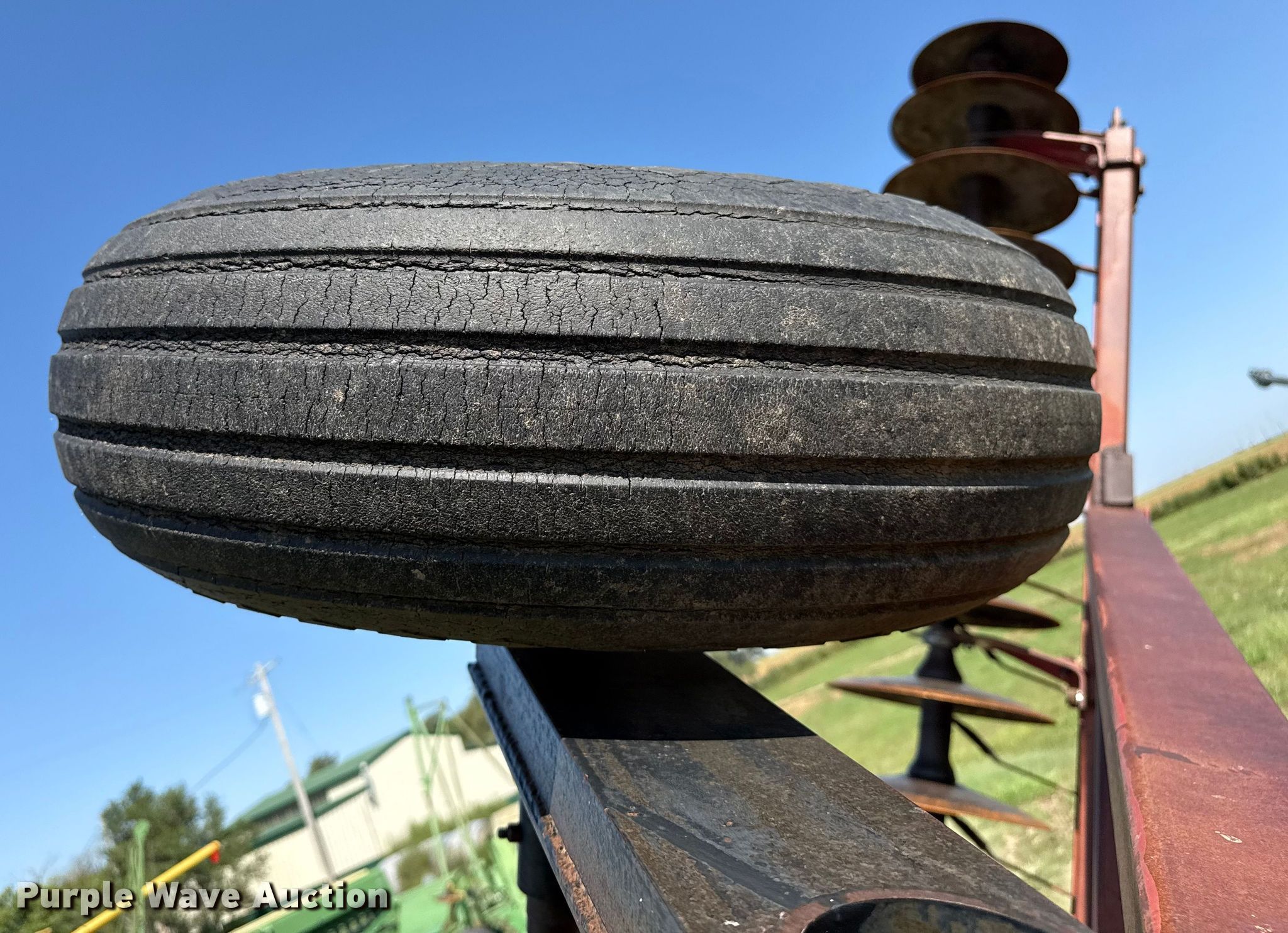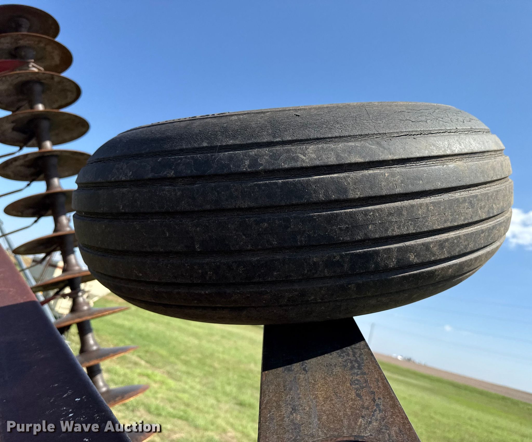International 490 double off-set disk. Overall width: 35', Serial: 0470000U103. Features Front blades Diameter: 20", Spacing: 6", Rear blades Diameter: 21", Spacing: 9", Disk scrapers, Operation Hydraulic lift, Hydraulic fold, Leveler: Manual, Attachments Rear hitch. Tires Tire size: 9.5L-14. Adams, OK 73901