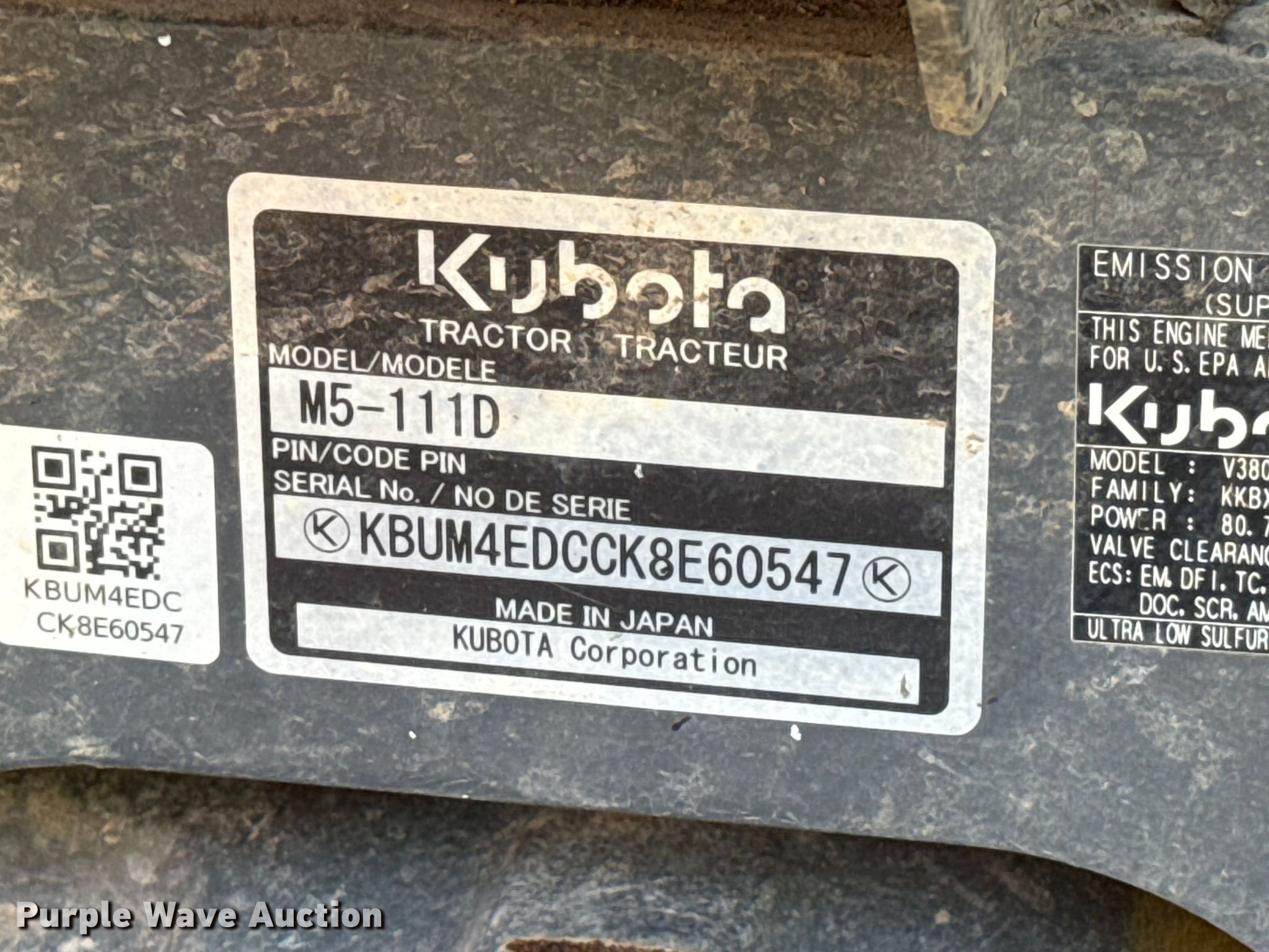 Purple Wave is selling a used Tractor in Oklahoma. This item is a 2020 Kubota M5-111D MFWD tractor with the following: Hours: 1,571 on meter, Serial: KBUM4EDCCK8E60547, Insurance Salvage Unit Claim #: 5-812357