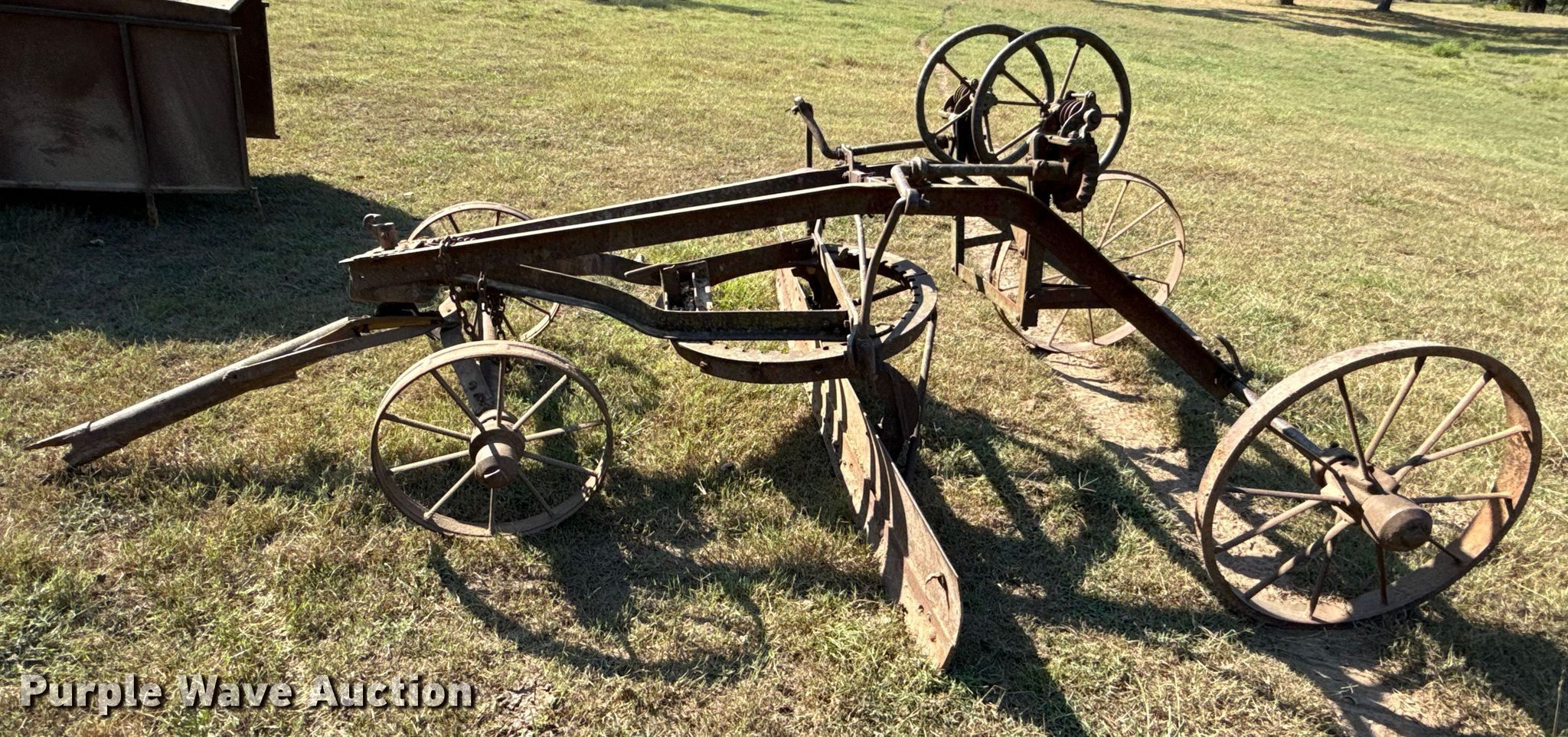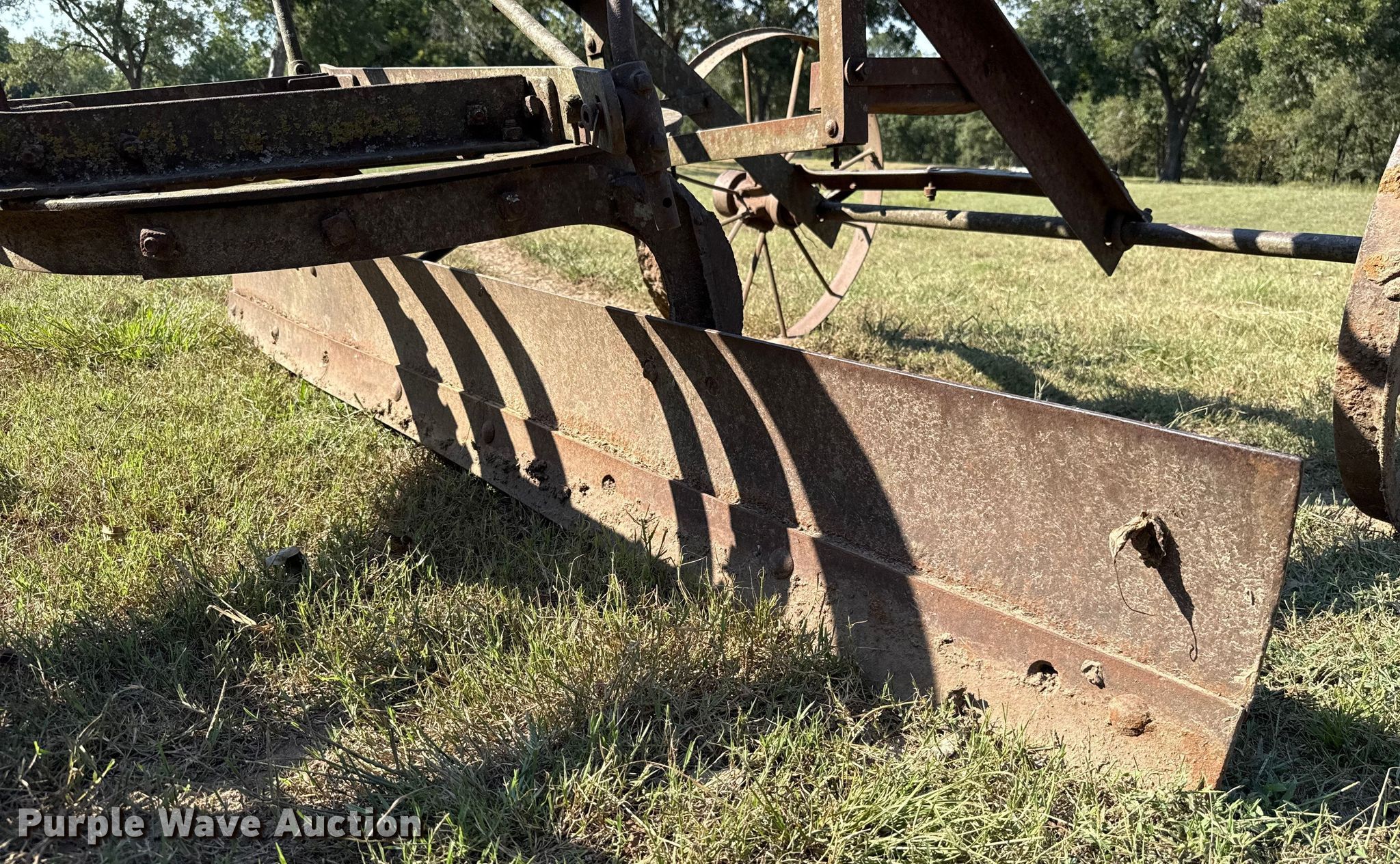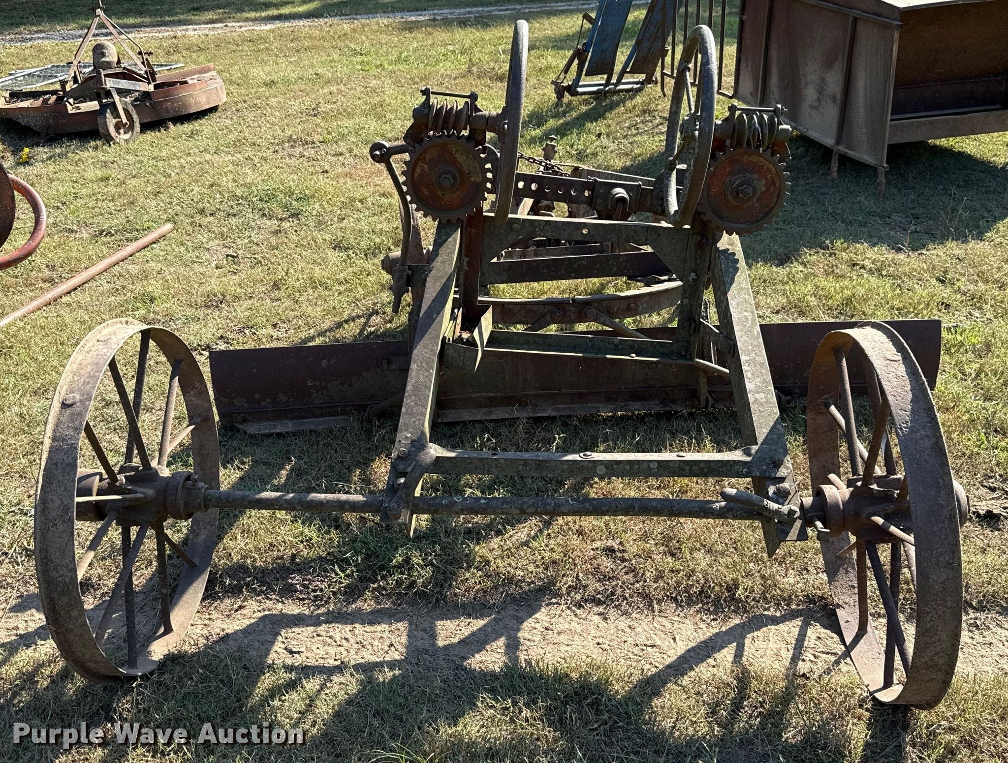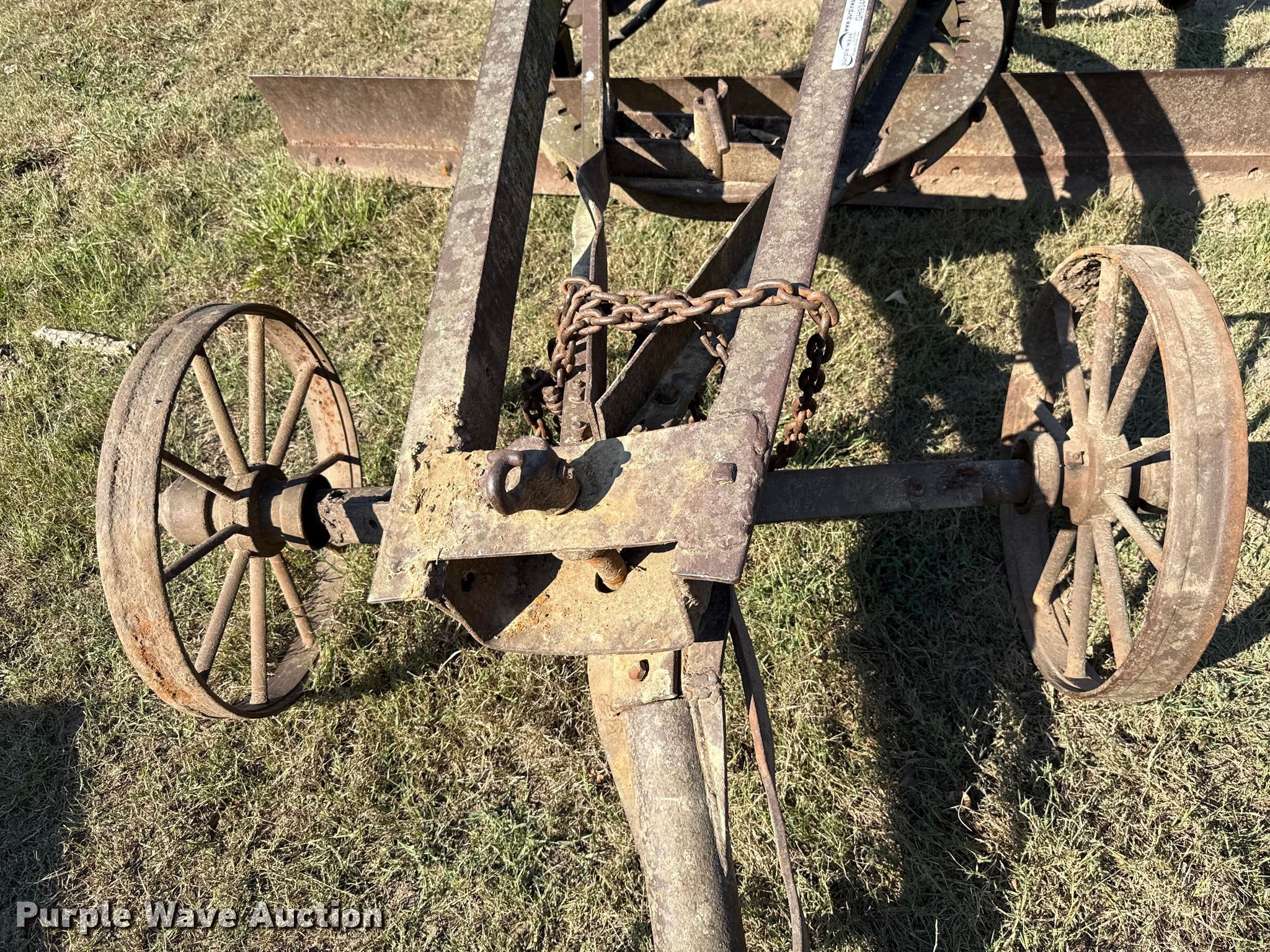 Purple Wave is selling a used Pull Type Scraper in Oklahoma. This item is a Pull type grader with the following: Moldboard total width: 8', Steel wheels, Hitch: Pin