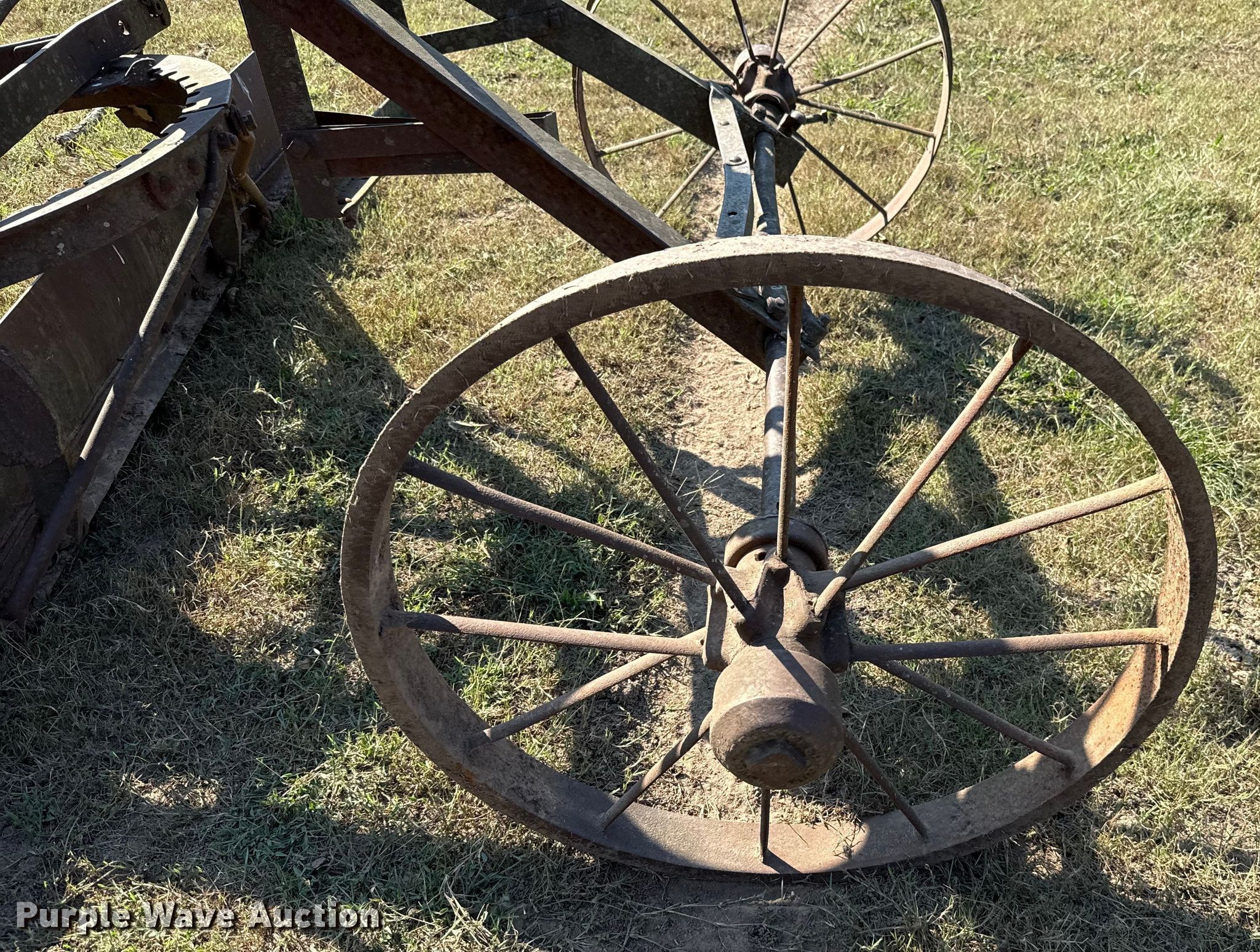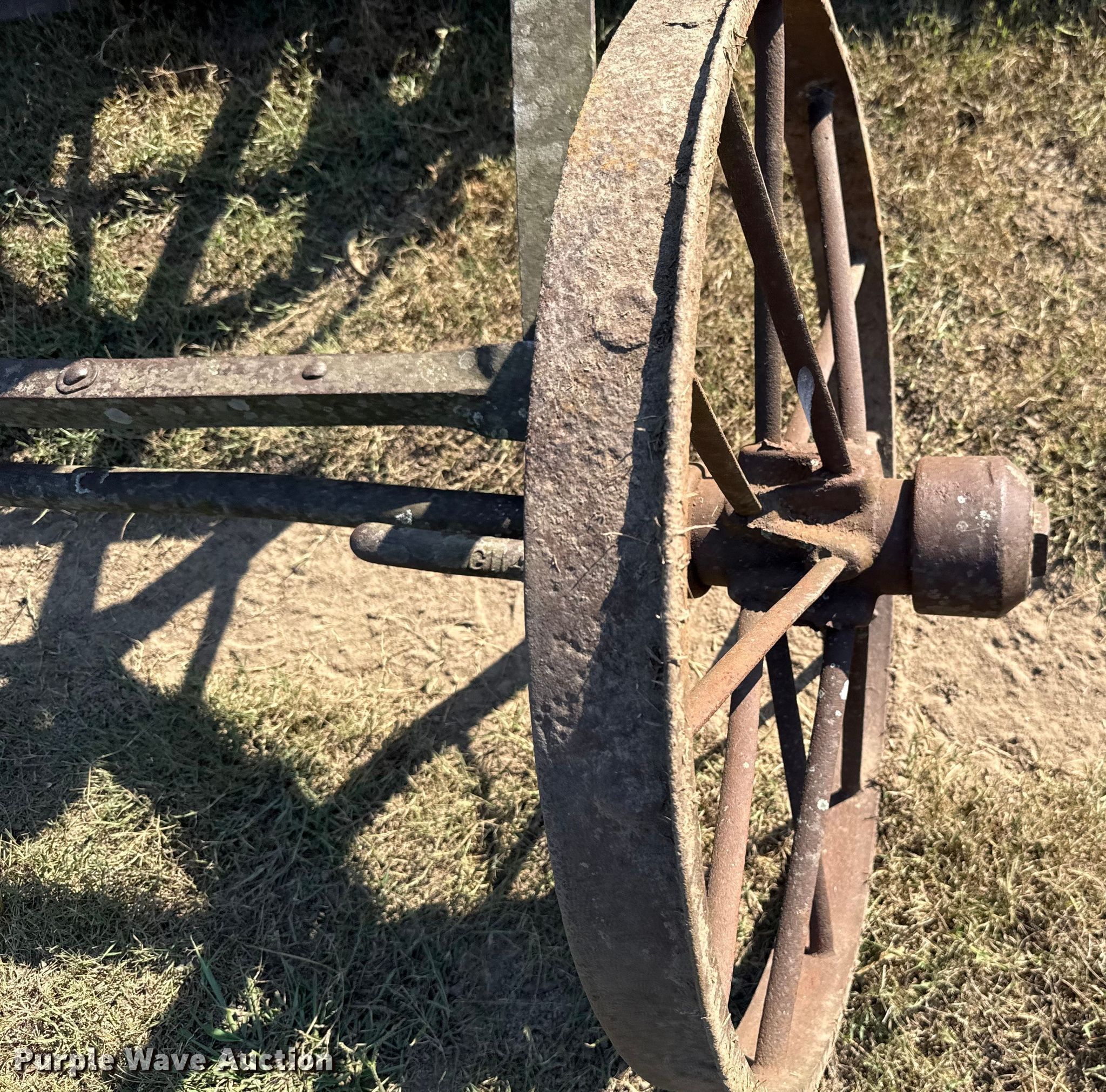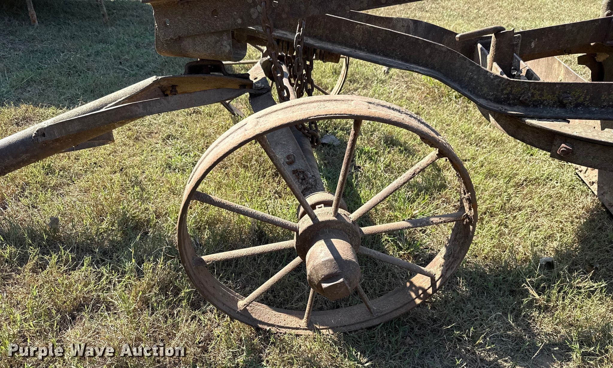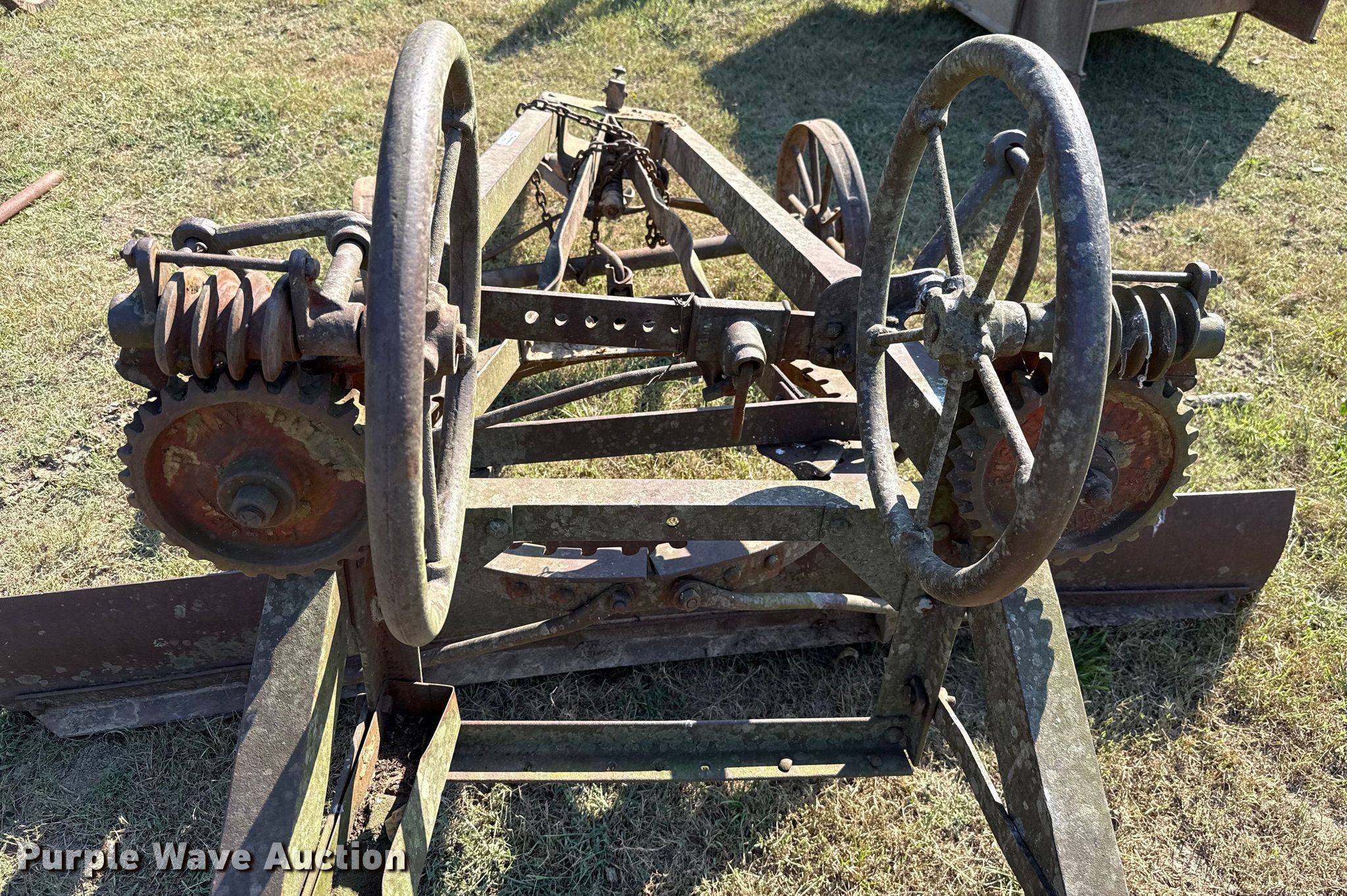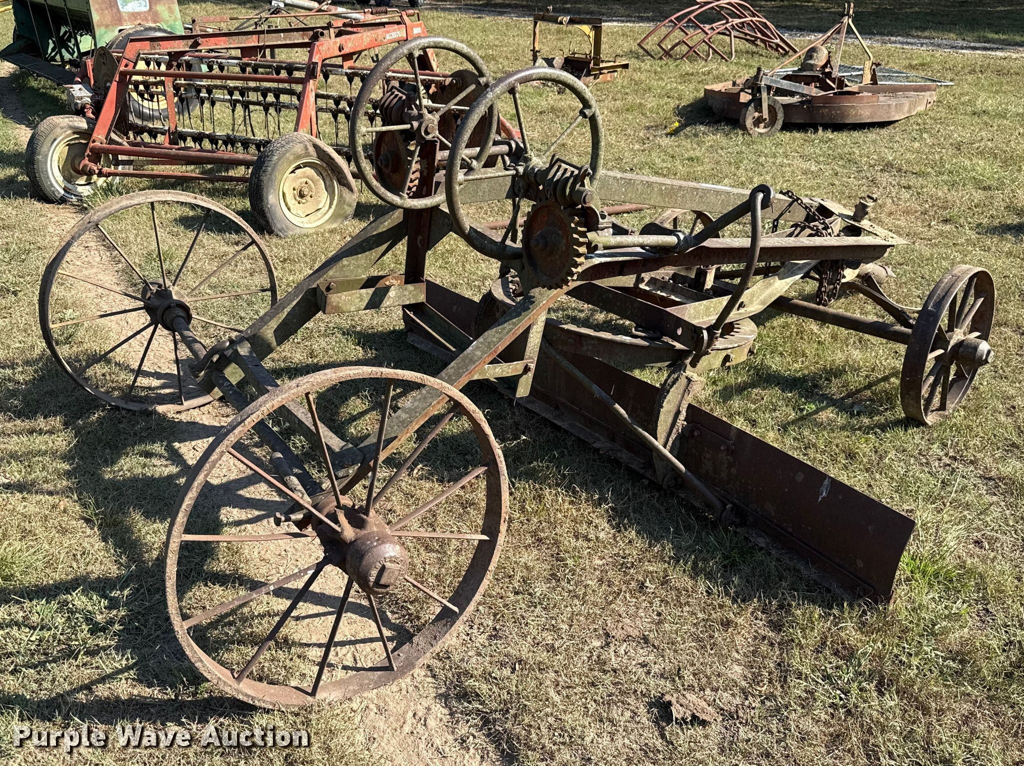 Purple Wave is selling a used Pull Type Scraper in Oklahoma. This item is a Pull type grader with the following: Moldboard total width: 8', Steel wheels, Hitch: Pin