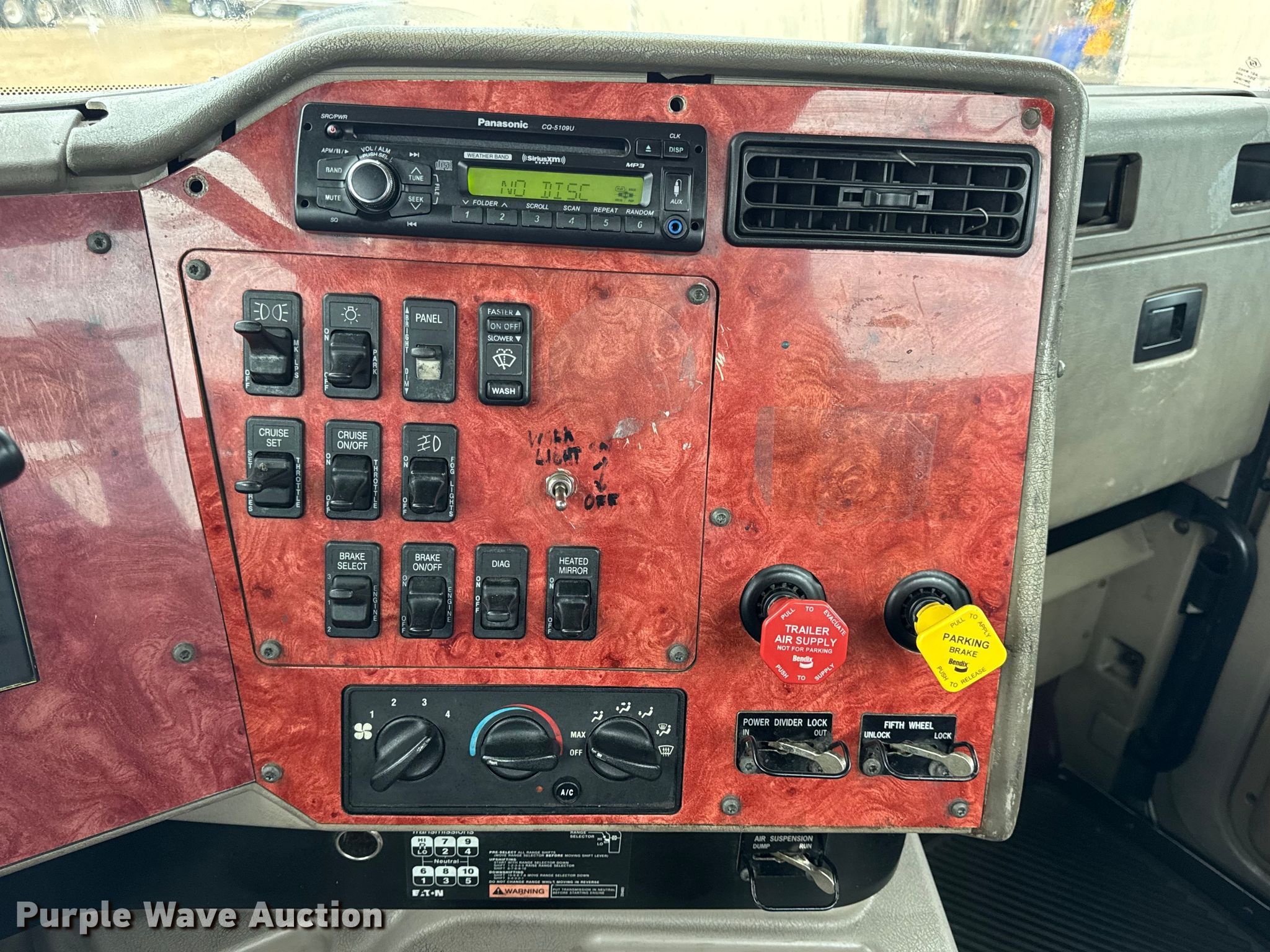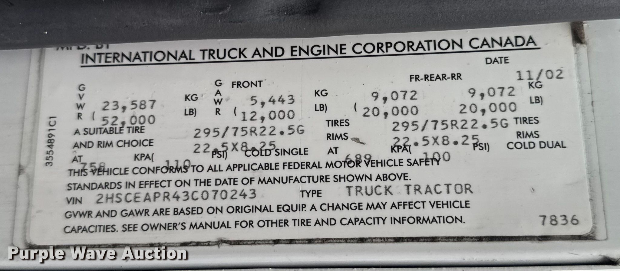 2003 International 9200i semi truck. Miles: 226,214 on odometer, Hours: 15,506 on meter, VIN: 2HSCEAPR43C070243. Engine Cummins ISX 400, Serial: 14044710, Displacement: 15L, Cylinders: 6, Fuel type: Diesel, HP: 400, Engine brake. Transmission Eaton Fuller, Manual, Speed: 10. Chassis Axles: Tandem, Differential lock: Inter-axle, Suspension: Air Dump valves, Brakes: Air, GVWR: 52,000 lbs FAWR: 12,000 lbs, IAWR: 20,000 lbs, RAWR: 20,000 lbs. Interior AC, Heat, Heated mirrors, Cruise control, Air ride cab. Features Deck plate: Aluminum, Fifth wheel type: Air operated, Sliding, Fuel tank: Dual. Tires Front: 275/80R22.5, Rear: 295/75R22.5. Notes Windshield chipped or cracked, Possible AC blower issues, weak, Non-operational speedometer and tachometer, Frame damage. Iowa title. Title distribution may be delayed up to 14 days from verification of funds. Hiland Dairy. New Bloomfield, MO 65063