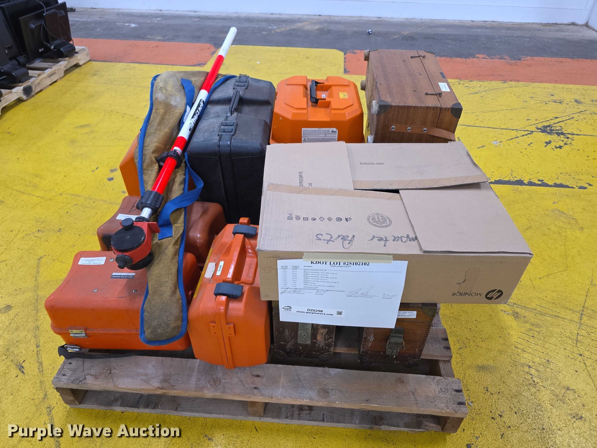 Purple Wave is selling a used Surveying Equip. in Kansas. This item is a Survey equipment with the following: Soil resistance meter, Transits, Magnetic locator, Prism pole and more, KDOT ID: 25102102