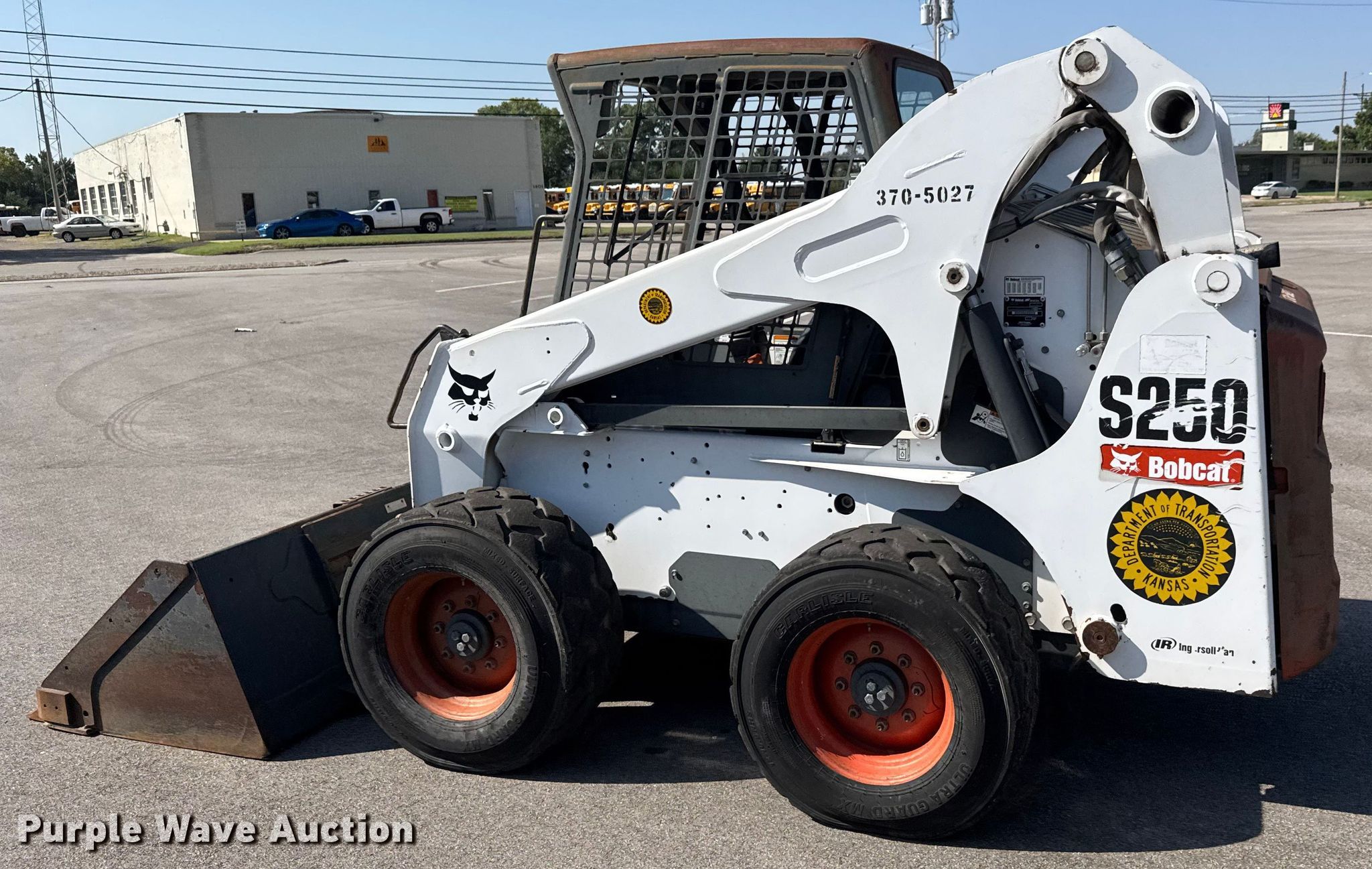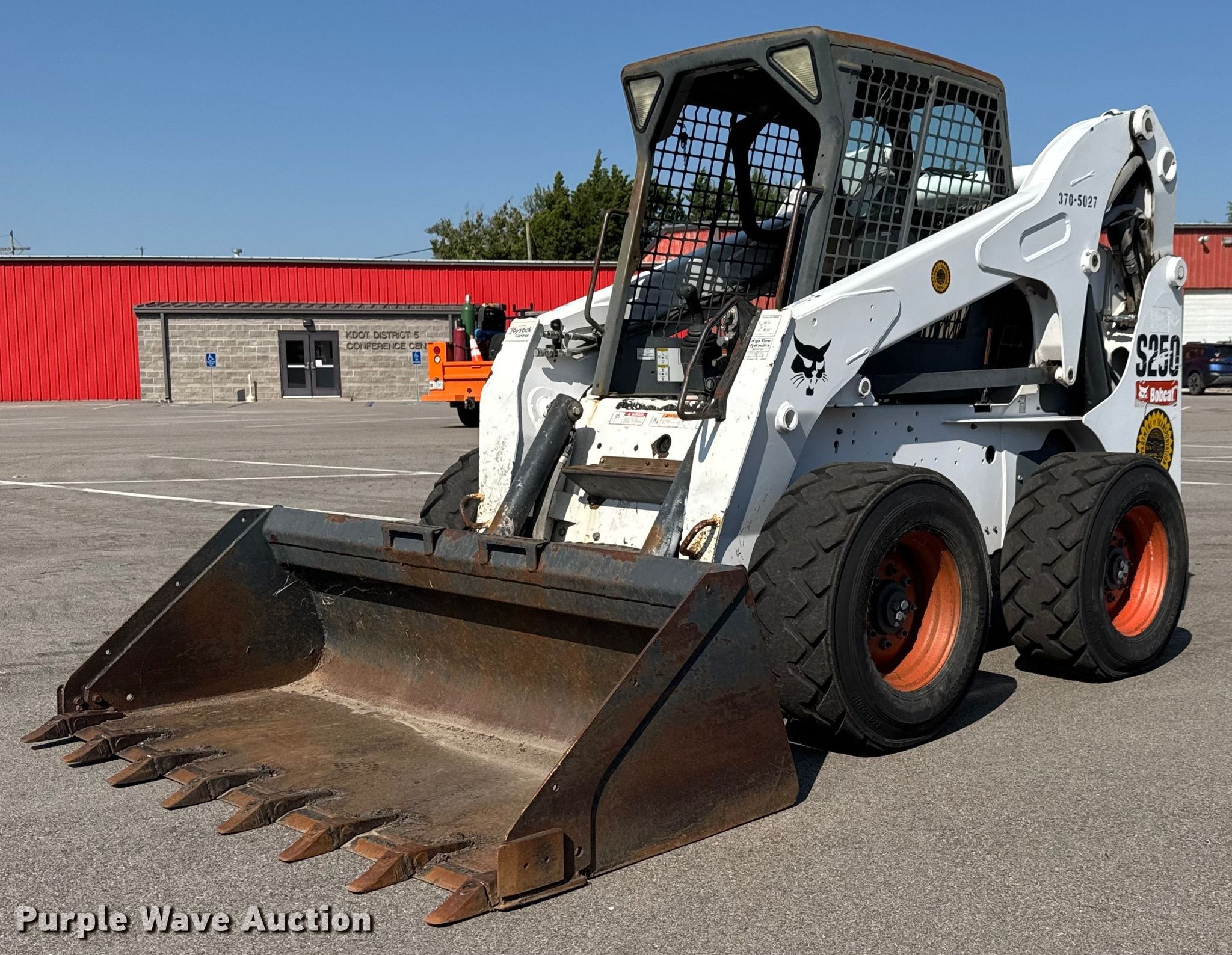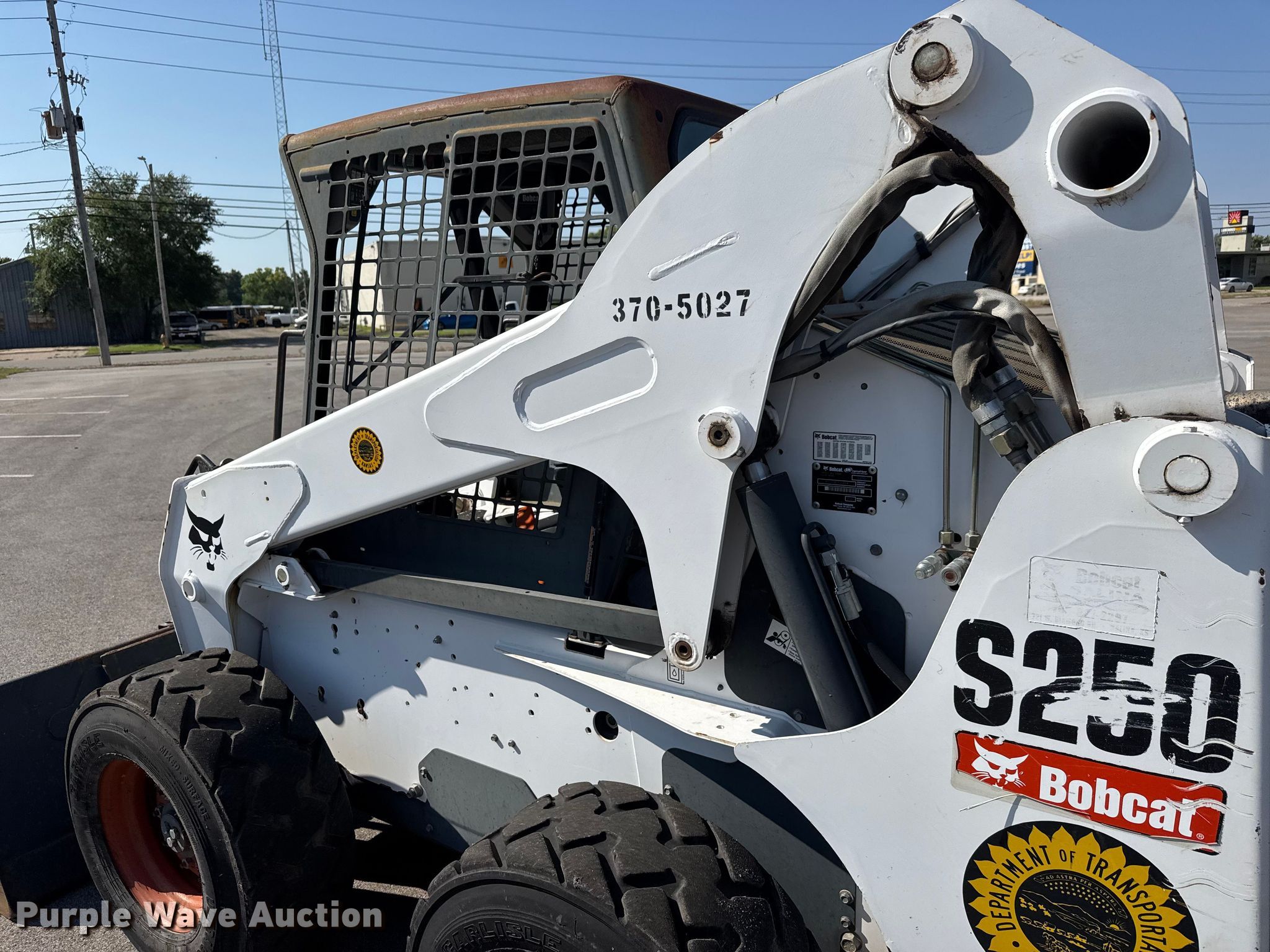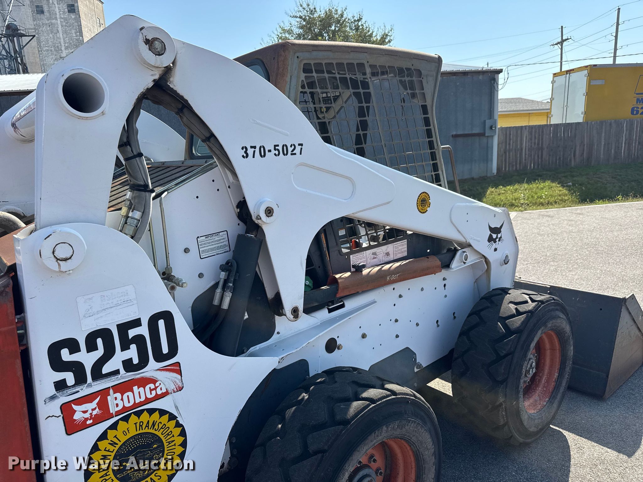 Purple Wave is selling a used Skid Steer Loader in Kansas. This item is a 2007 Bobcat S250 skid steer loader with the following: Hours: 1,882 on meter, Serial: 530917298, KDOT ID: 370-5027