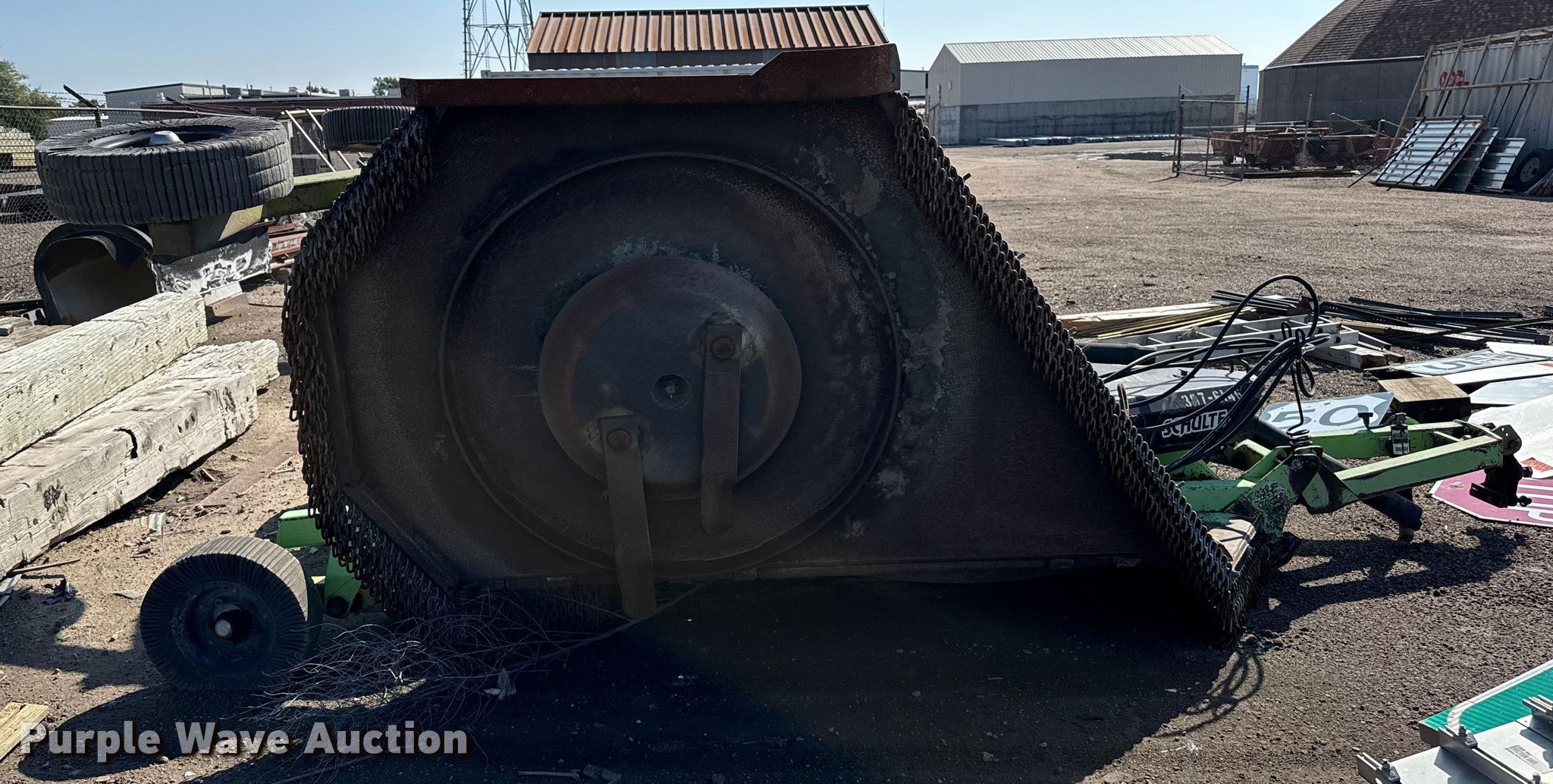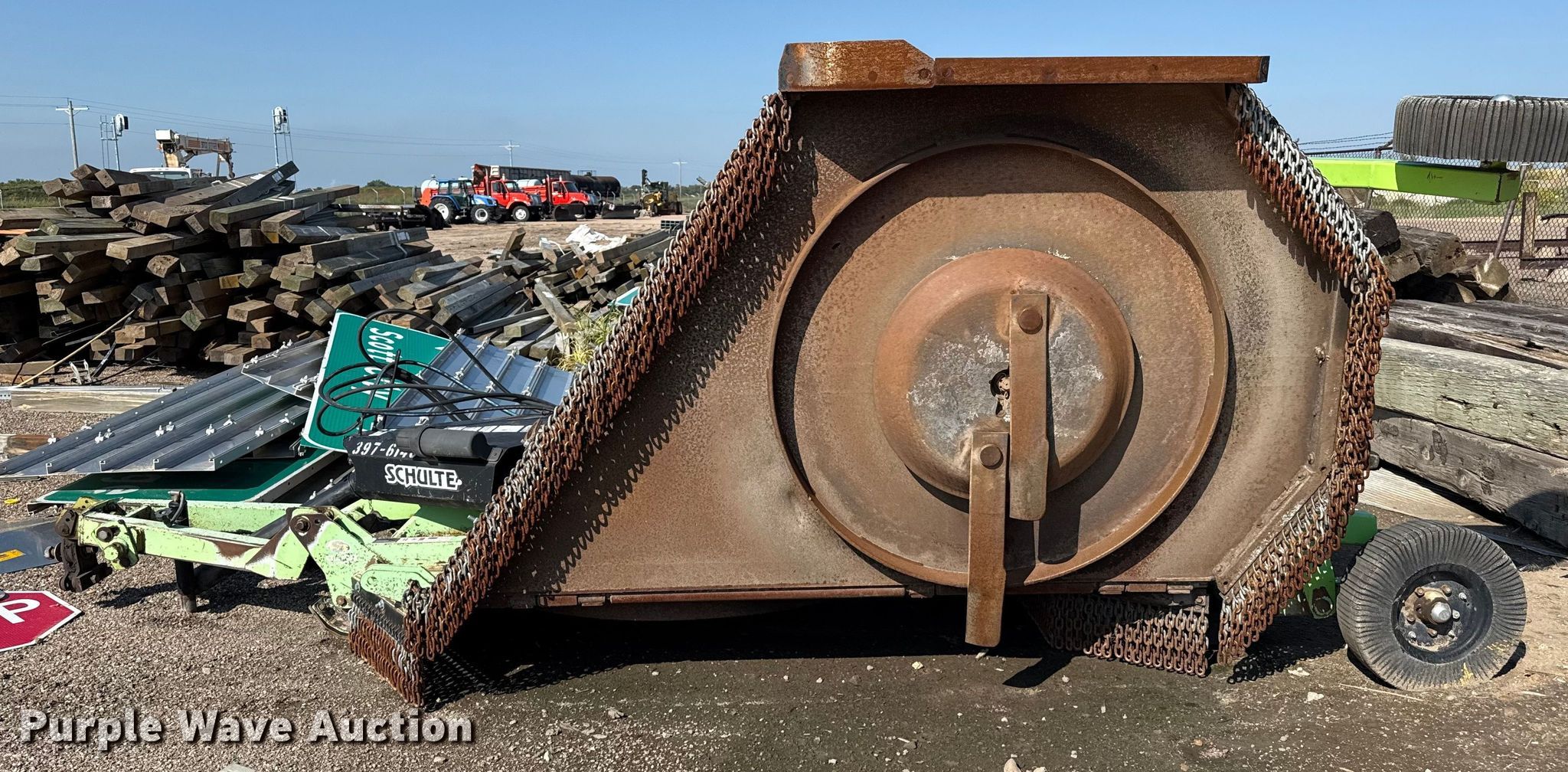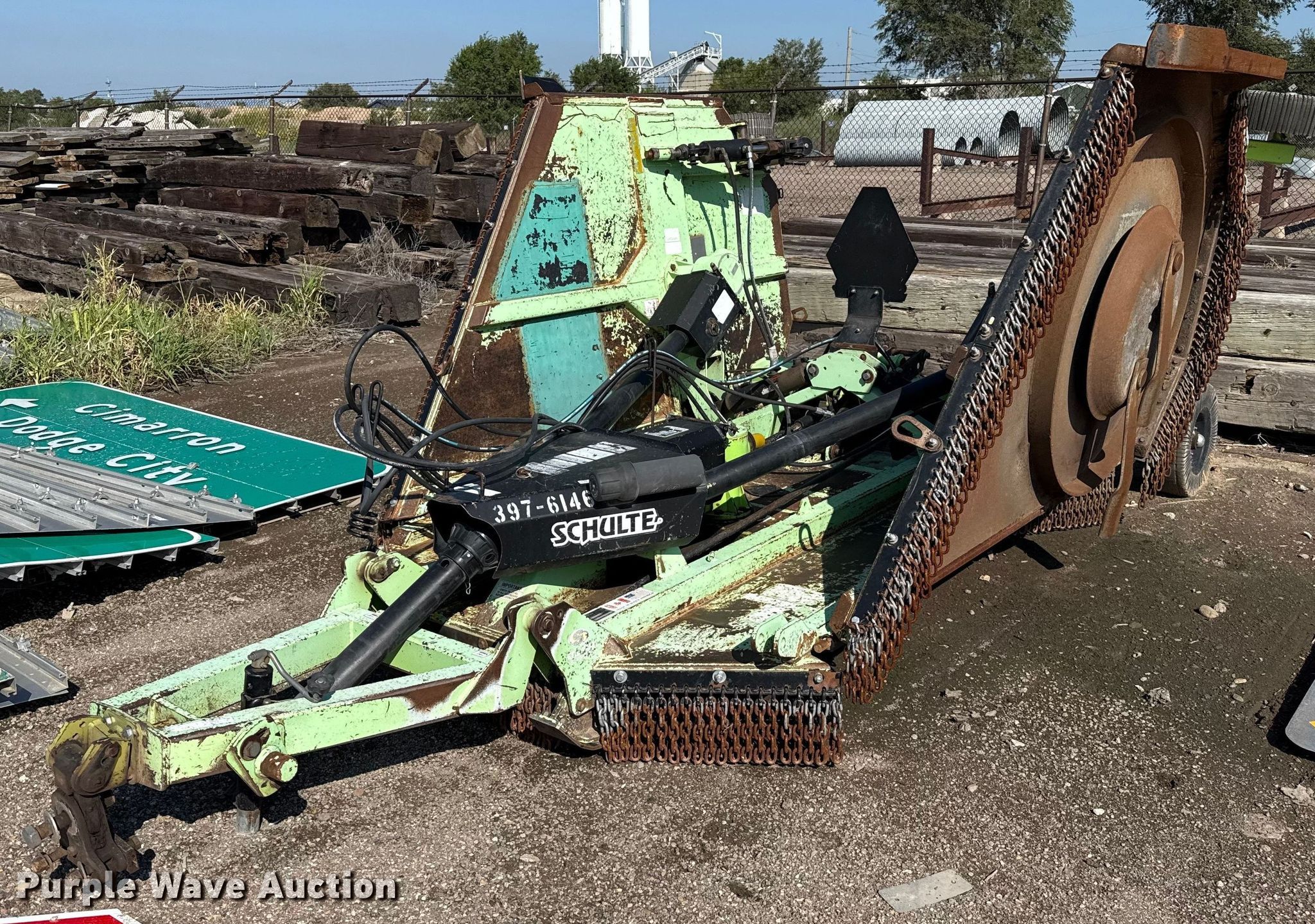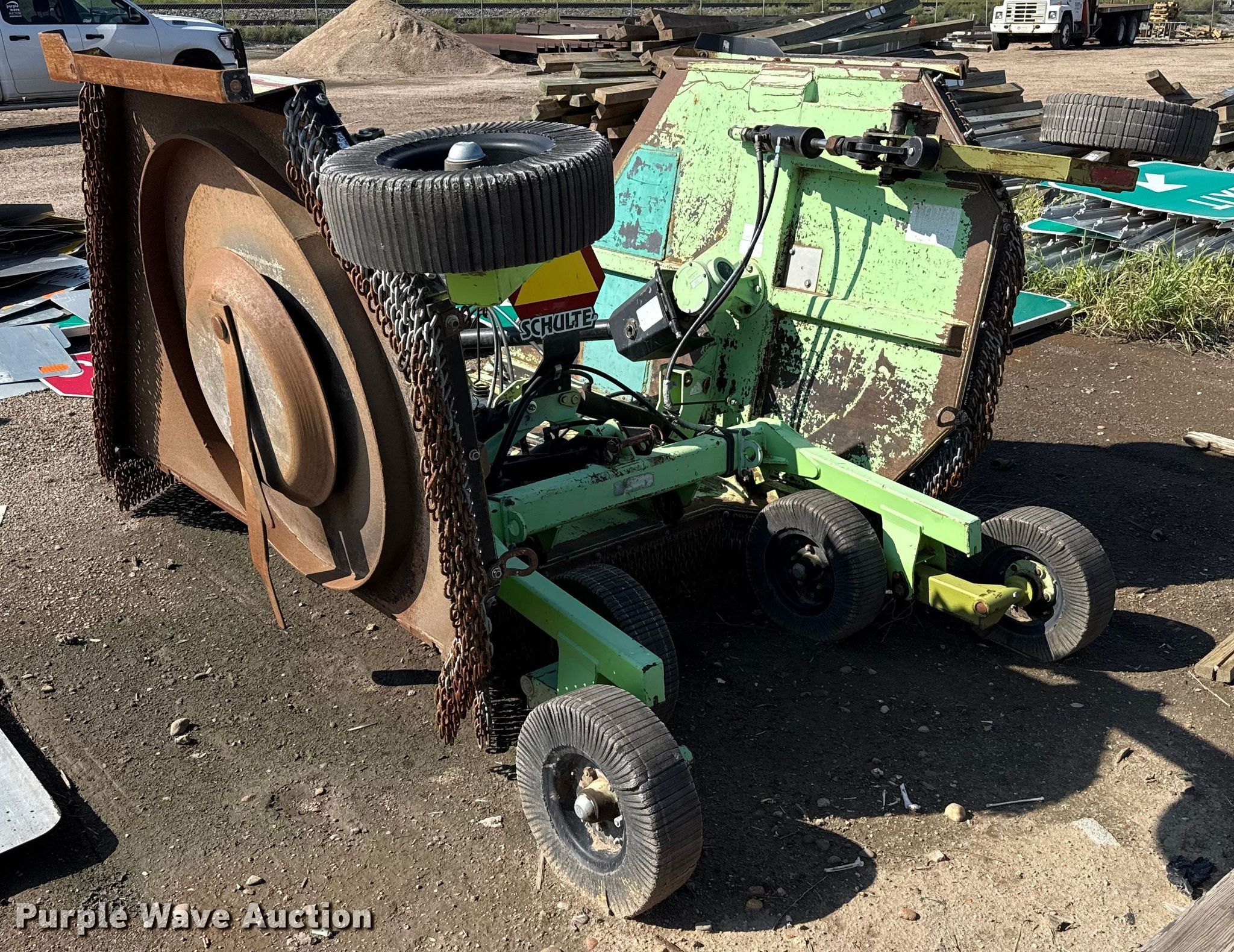 Schulte XH1500 batwing rotary mower. Serial: C30103377607, KDOT ID: 397-6146. Features Width: 15', Hydraulic lift, Hydraulic fold. Tires Solid. Notes Blades may need replaced, Clutches may need replaced, PTO half shaft missing. Kansas Department of Transportation - Garden City. Garden City, KS 67846