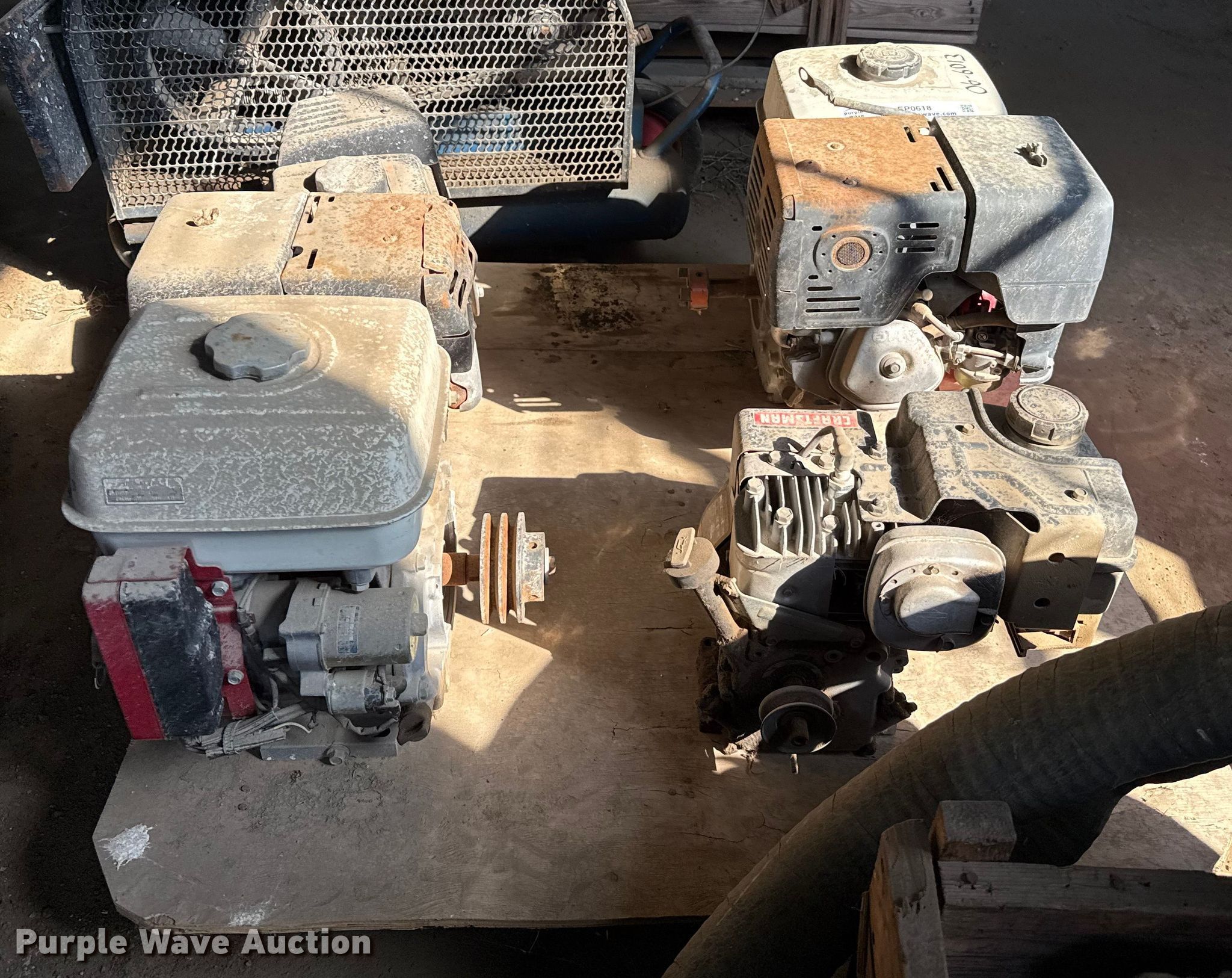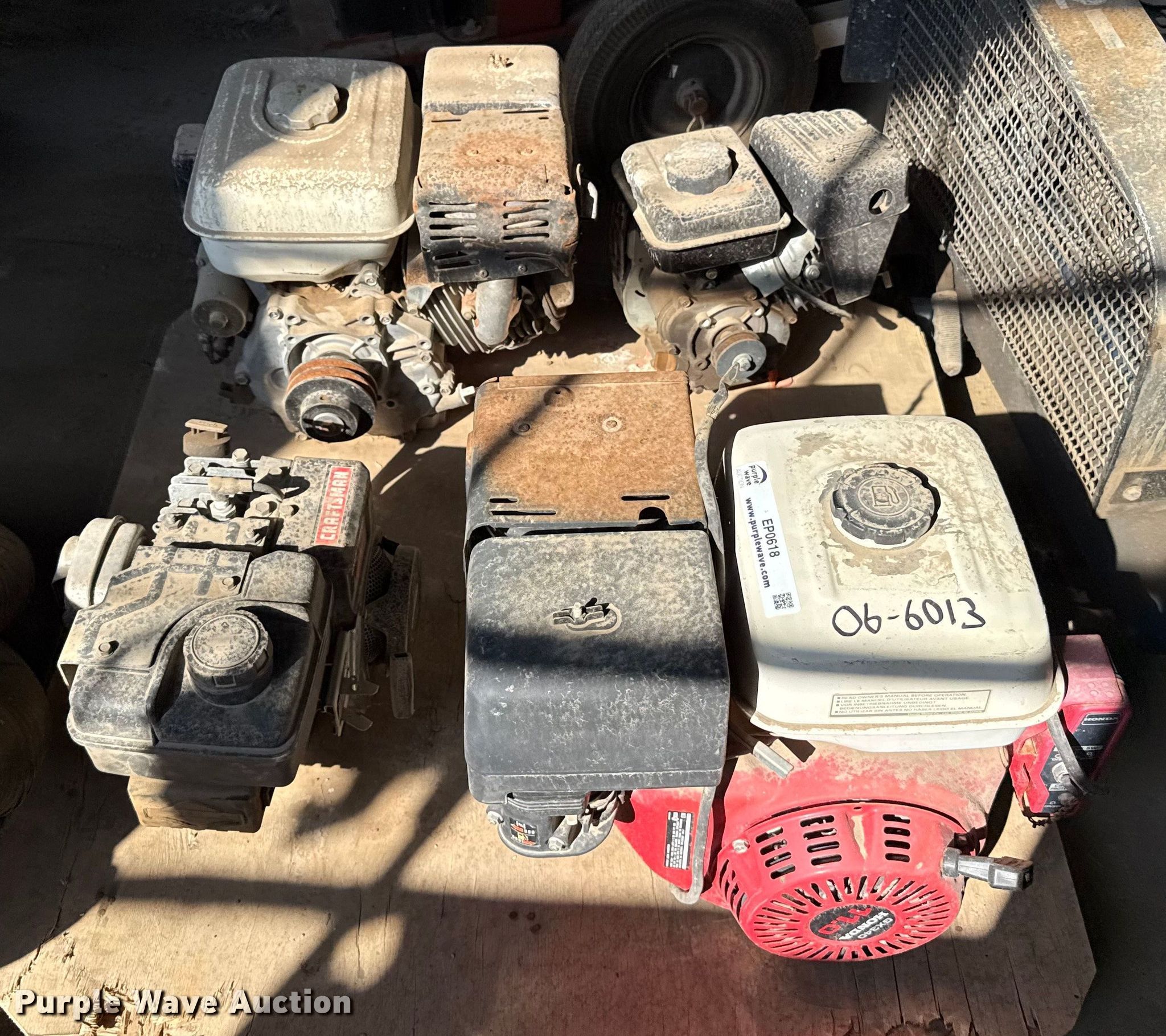 Purple Wave is selling a used Engine in Kansas. This item is a (4) gas engines with the following: KDOT ID: 06-6013, Honda GX340, HP: 11, Honda GX240, HP: 8, Craftsman, HP: 4, Powermate