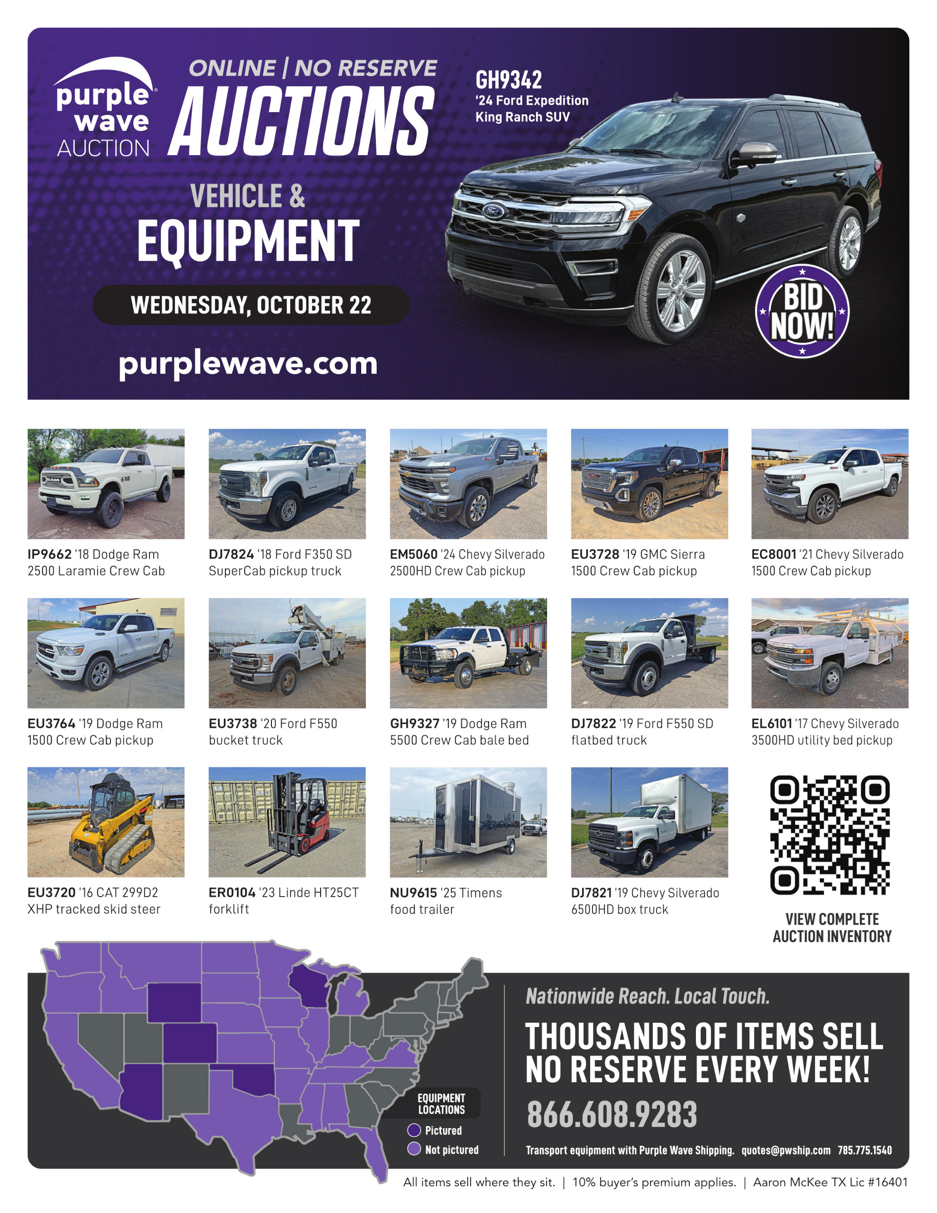 This auction is conducted by Purple Wave, Inc., whose home office is 825 Levee Drive, Manhattan, Kansas. Aaron McKee, Texas auctioneer license # 16401, operates Purple Wave, Inc. Complaints against us may be directed to the Texas Department of Licensing and Regulation, P.O. Box 12157, Austin, Texas 78711, (512) 463-6599. For additional required information, see the attached document.