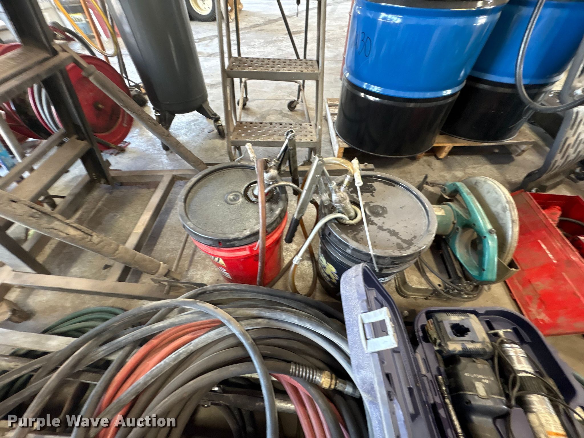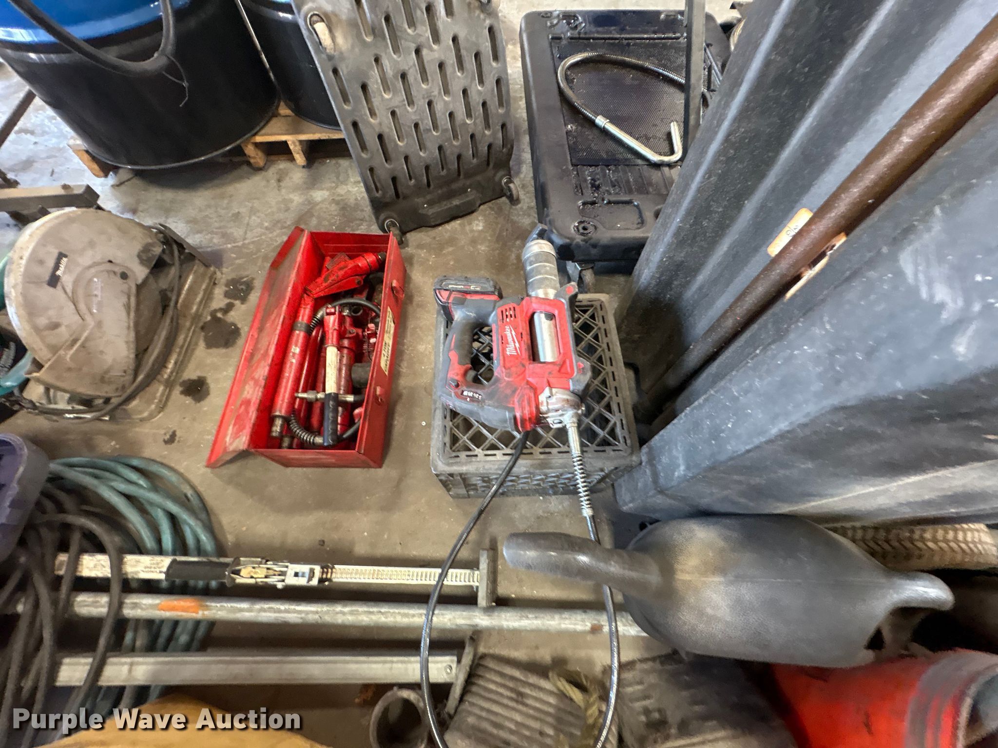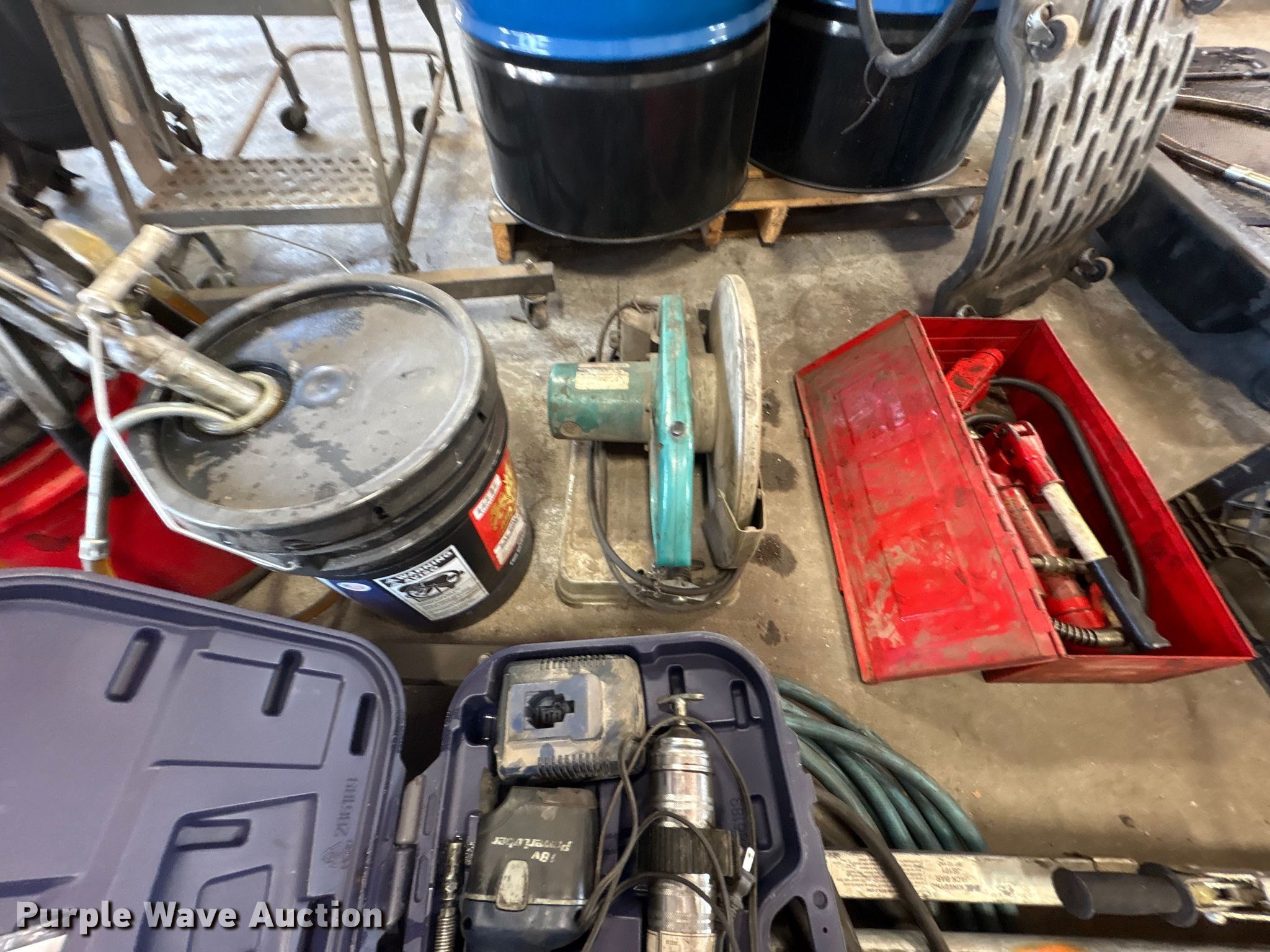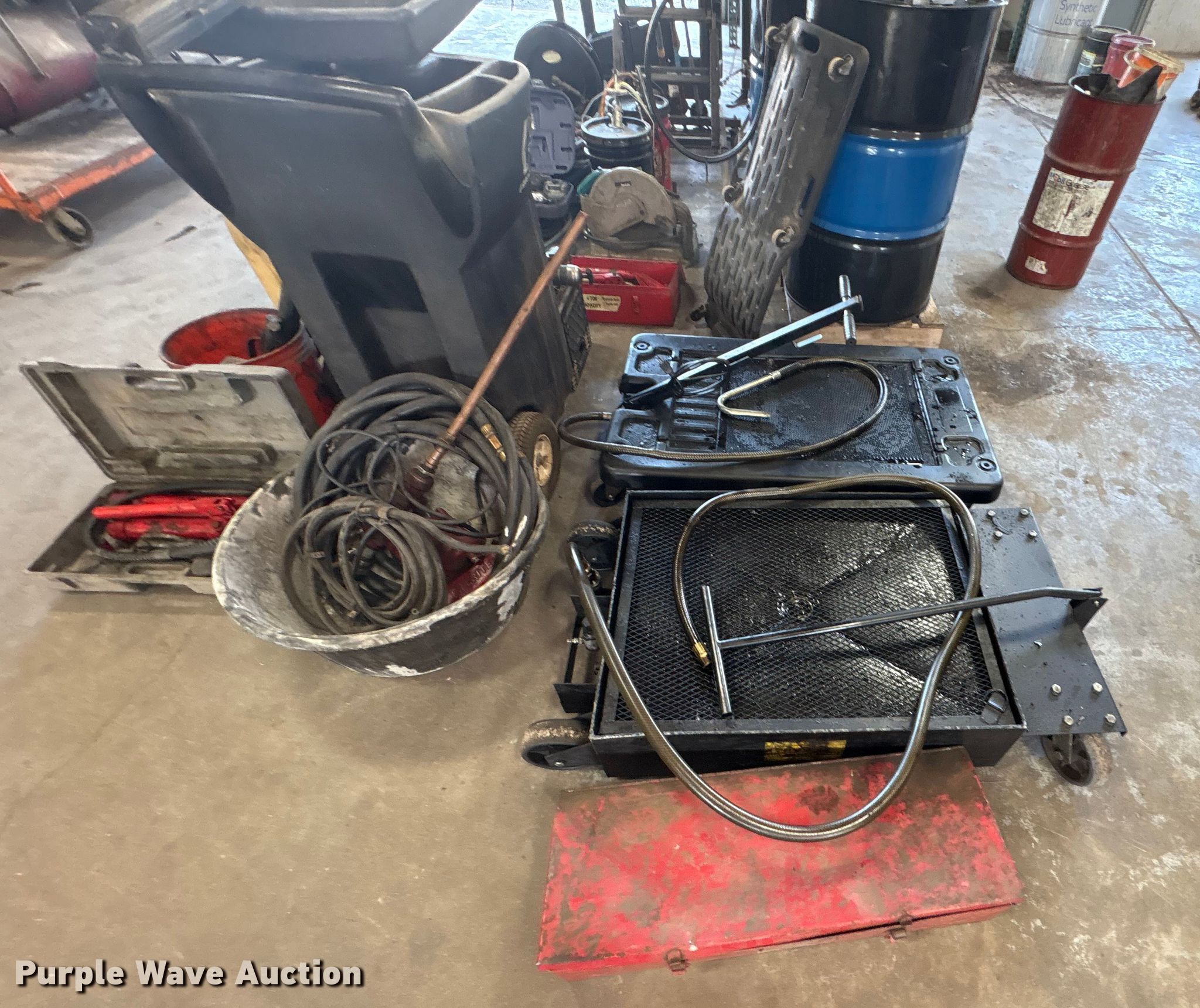 Purple Wave is selling a used Tools in Kentucky. This item is a Tools with the following: Hoses, Oil drain pans, Service cart, Topside creeper, Rolling ladder, Oil pumps, Chop saw, (2) Porta power, (2) Cordless grease guns