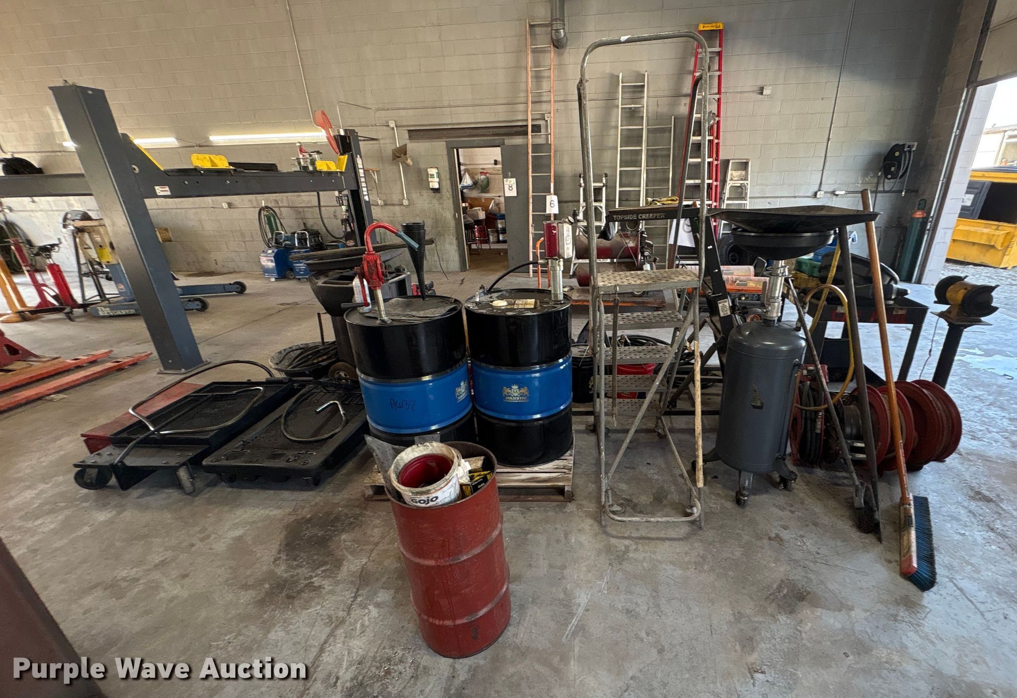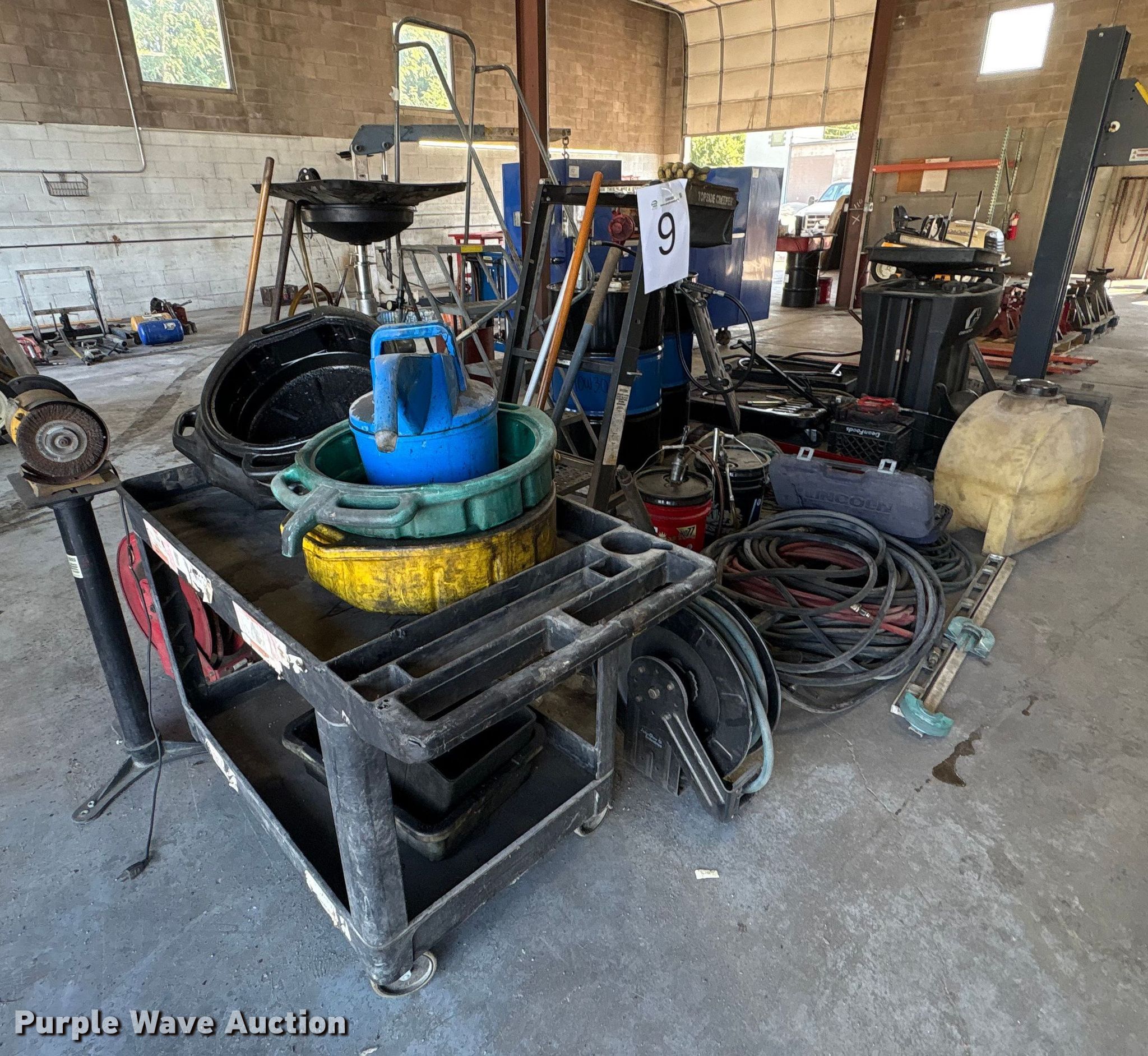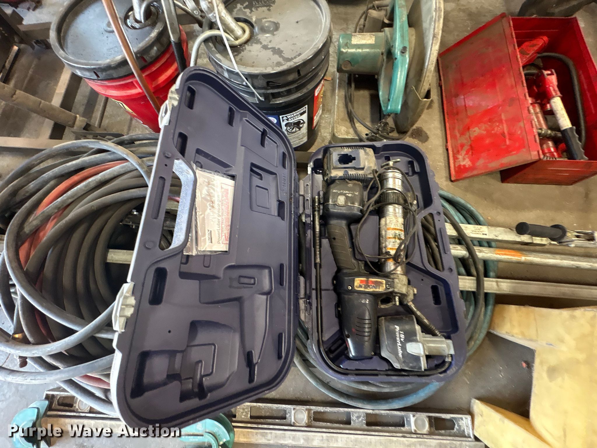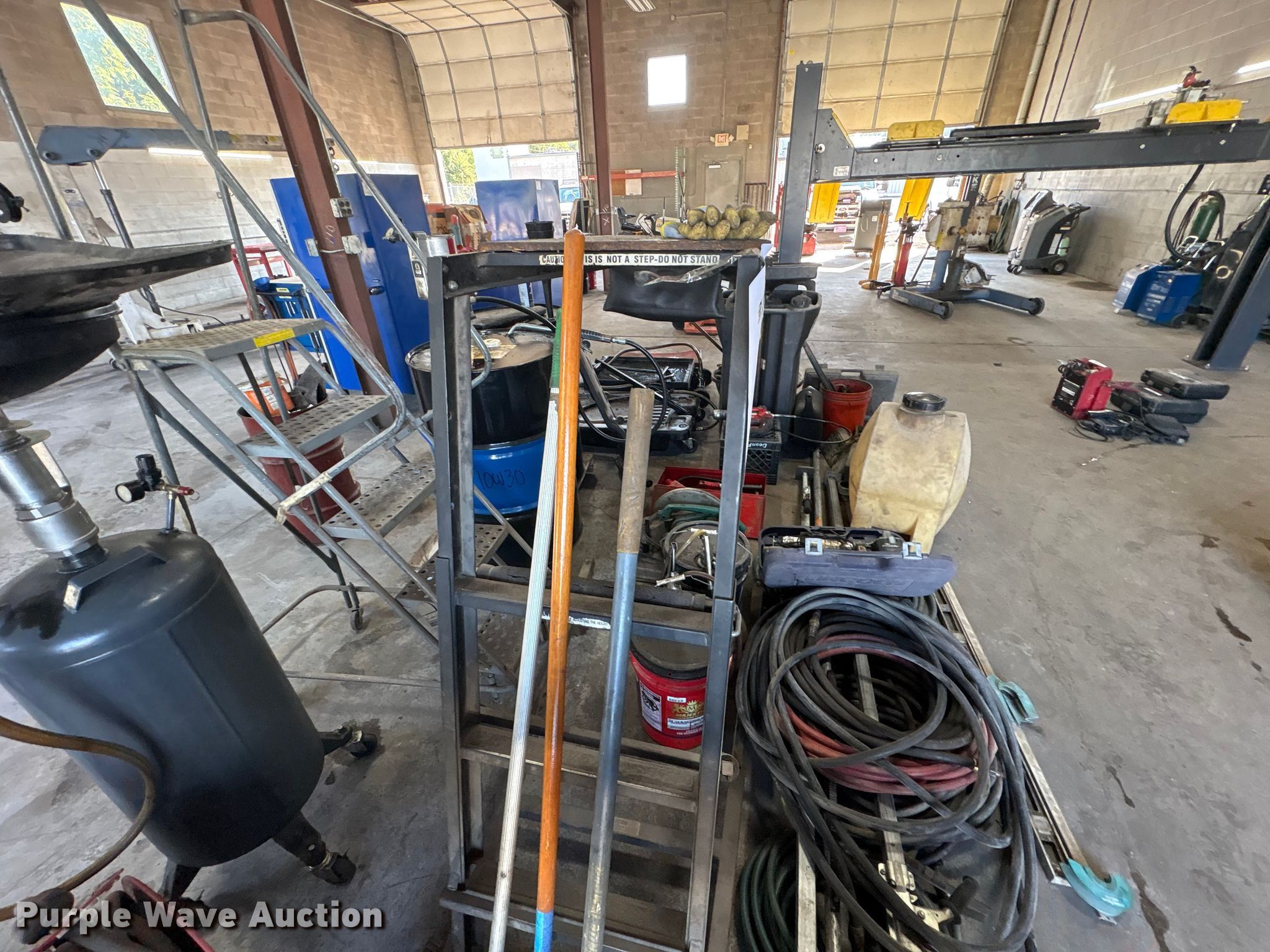 Purple Wave is selling a used Tools in Kentucky. This item is a Tools with the following: Hoses, Oil drain pans, Service cart, Topside creeper, Rolling ladder, Oil pumps, Chop saw, (2) Porta power, (2) Cordless grease guns