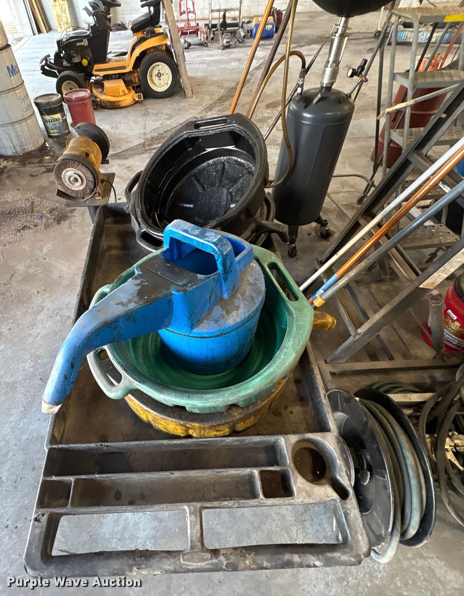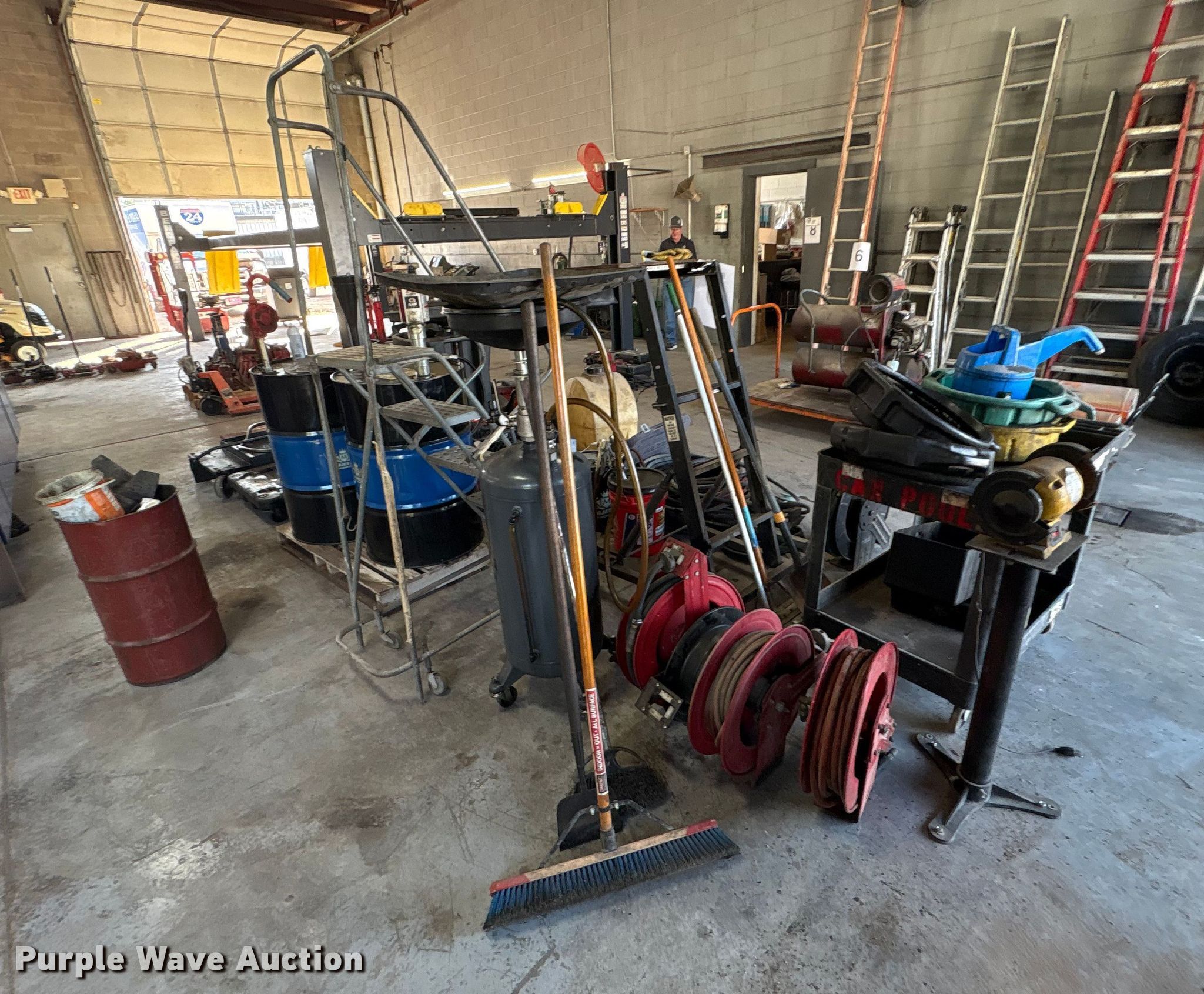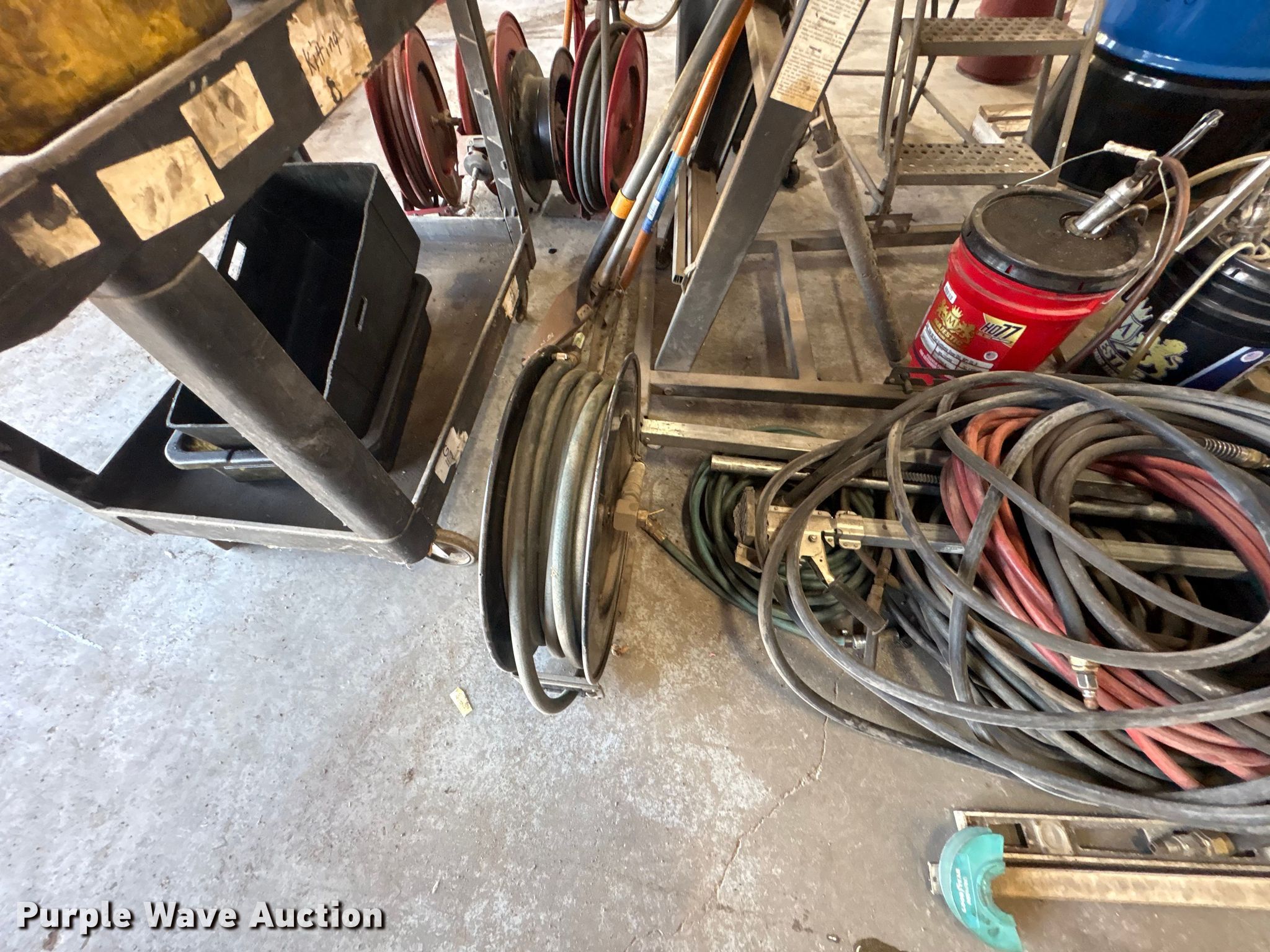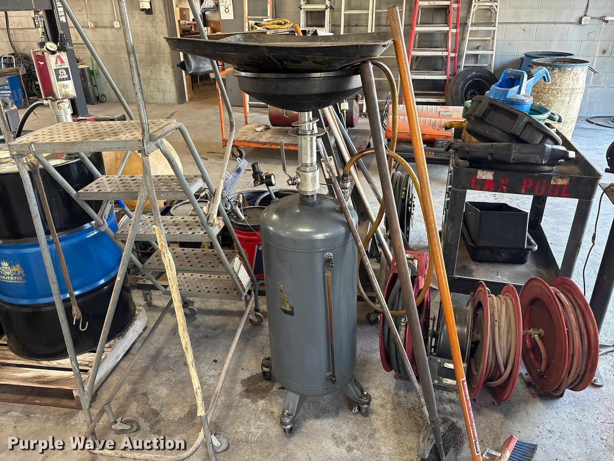 Purple Wave is selling a used Tools in Kentucky. This item is a Tools with the following: Hoses, Oil drain pans, Service cart, Topside creeper, Rolling ladder, Oil pumps, Chop saw, (2) Porta power, (2) Cordless grease guns