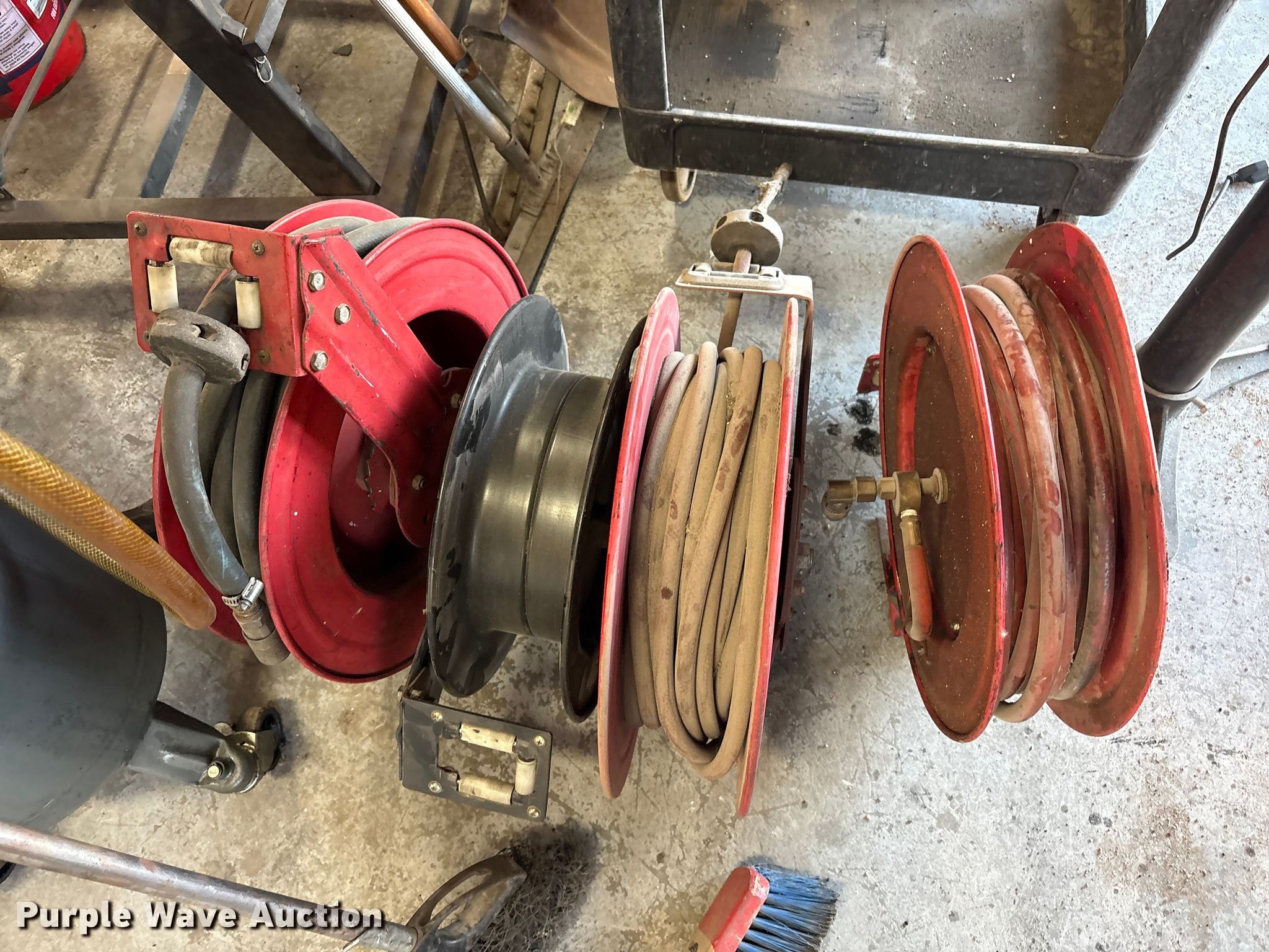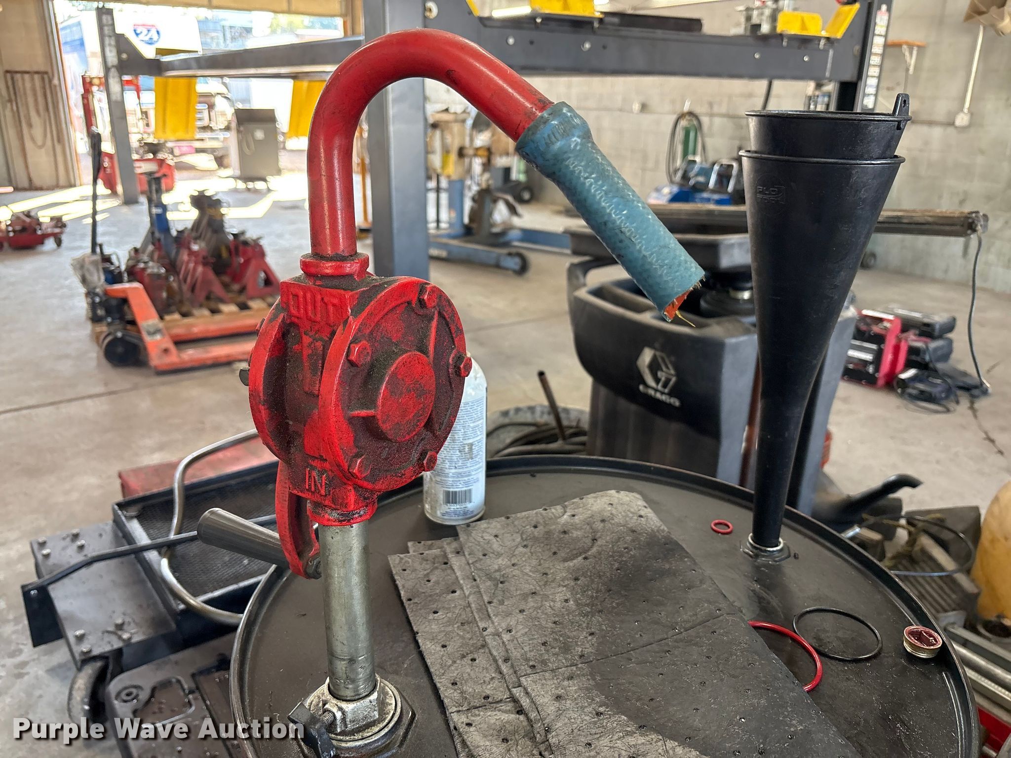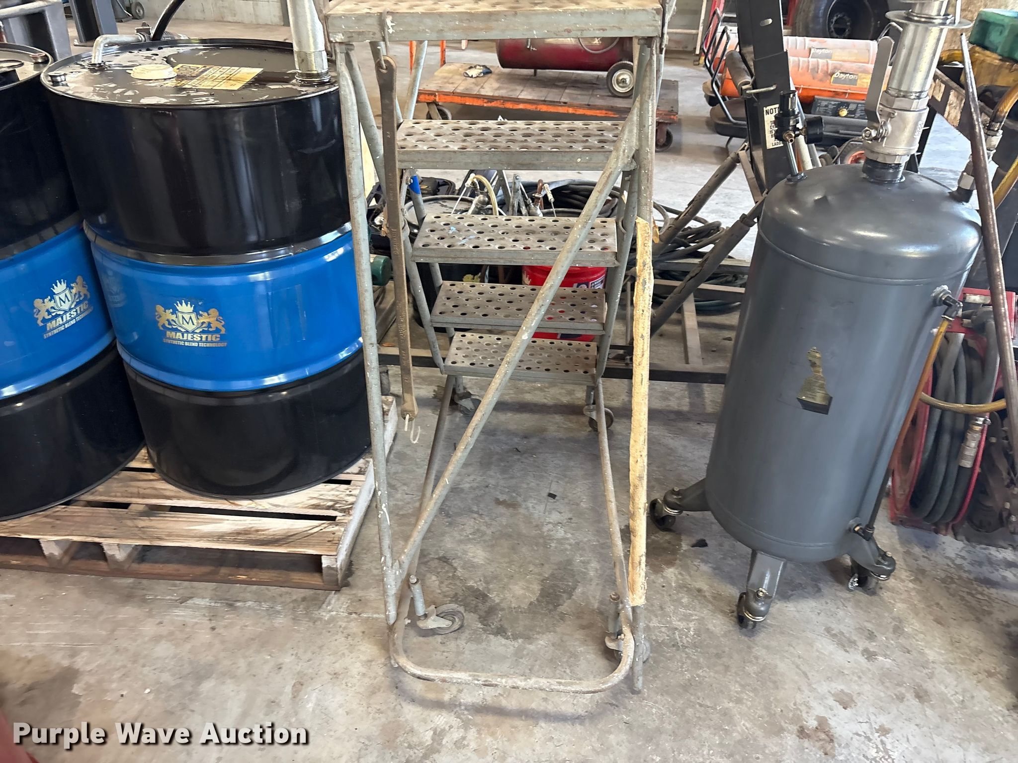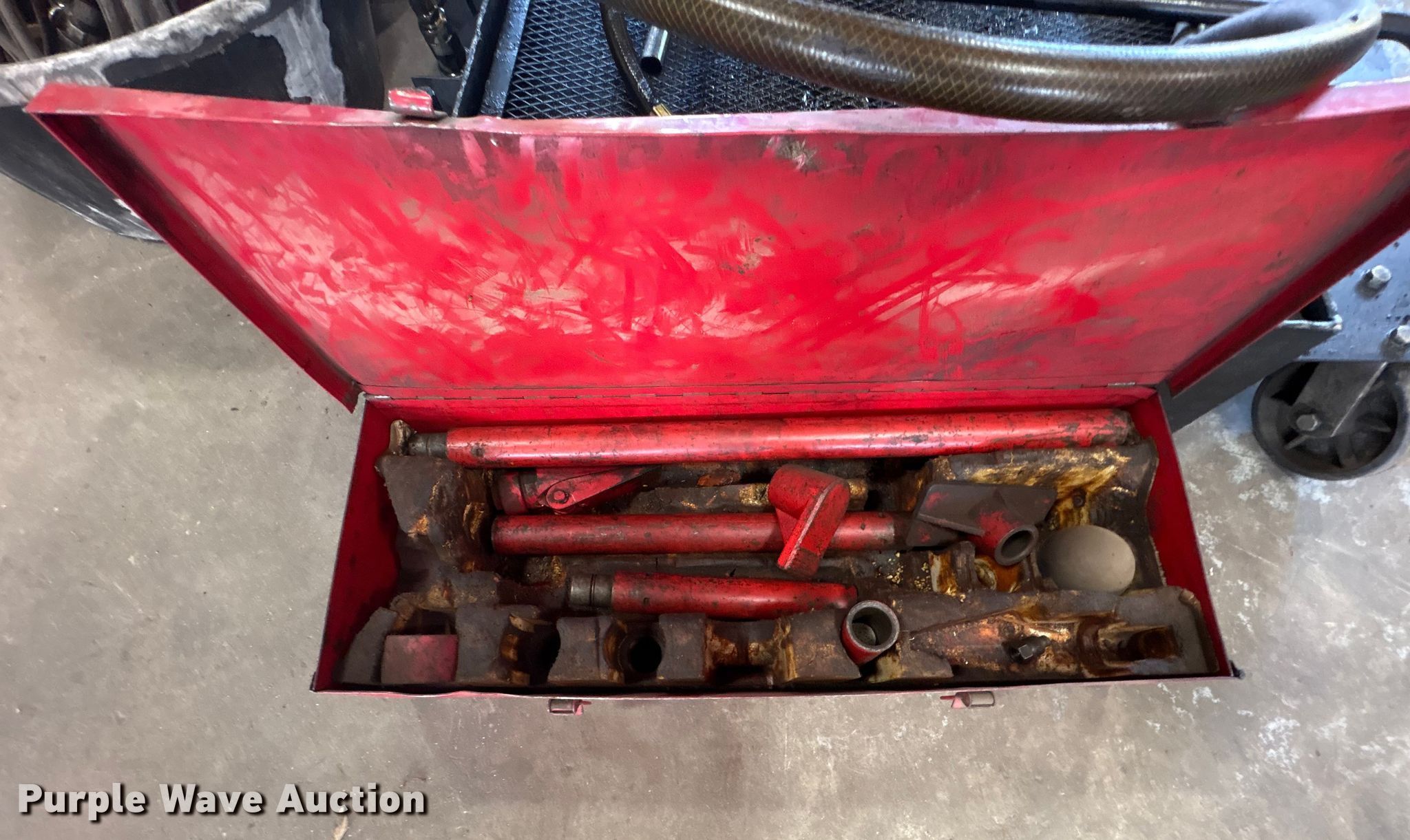 Purple Wave is selling a used Tools in Kentucky. This item is a Tools with the following: Hoses, Oil drain pans, Service cart, Topside creeper, Rolling ladder, Oil pumps, Chop saw, (2) Porta power, (2) Cordless grease guns