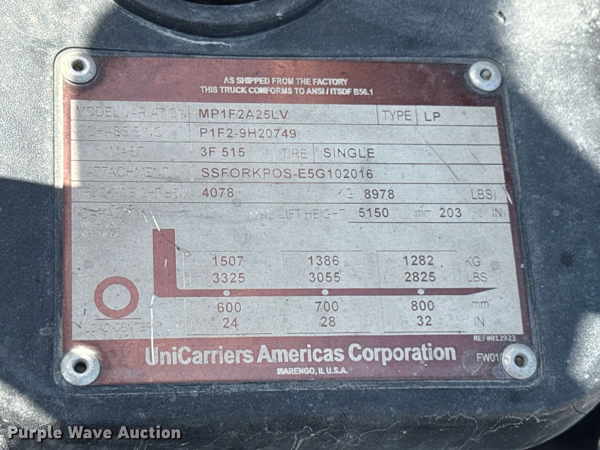 2016 UniCarriers PF50 forklift. Hours: 4,404 on meter, Miles or hours may vary, unit still in use, Serial: P1F2-9H20749, Unit #: SFS2491. Engine GCT K21L, Displacement: 2.1L, Cylinders: 4, Fuel type: LPG LP bottle: Not included. Transmission Automatic. Operators station OROPS. Features Maximum lift capacity: 3,325 lbs, Maximum lift height: 203", Collapsed mast height: 80", Mast stages: 3, Side shift, Mast tilt, Fork positioner, Fork length: 47". Tires Front: 7.00-12, Rear: 6.00-9, Solid. Notes Warning indicator: Master warning. Ferguson. Tulsa, OK 74112