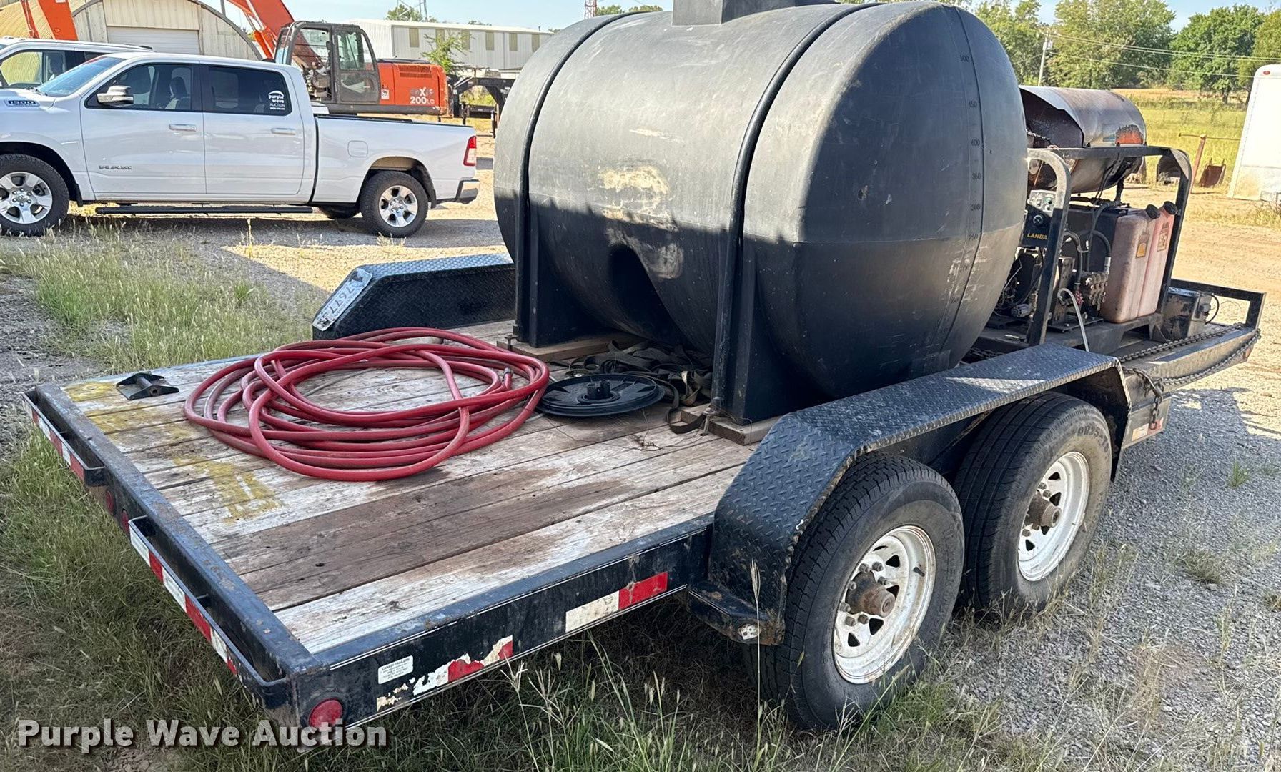 2012 PJ Trailers CC162 equipment trailer. VIN: 4P5CC1622C1176930. Dimensions Overall Length: 20', Width: 102", Deck Length: 16', Width: 84". Features Water tank Capacity: 525 gallons, Tank Capacity: 35 gallons, Water heater: Gas Deck type: Wood, Landa LT6035L.1 pump PSI: 3500, GPM: 6.0, RPM: 1540. Chassis Ball hitch: 2 5/16", Landing gear: Single, Suspension: Spring, Brakes: Electric, Axles: Tandem, GVWR: 14,000 lbs, GAWR: 6,999 lbs. Tires Size: ST235/80R16. Oklahoma title. Title distribution may be delayed up to 14 days from verification of funds. MILLER BROS WELDING & ROUSTABO. Stroud, OK 74079