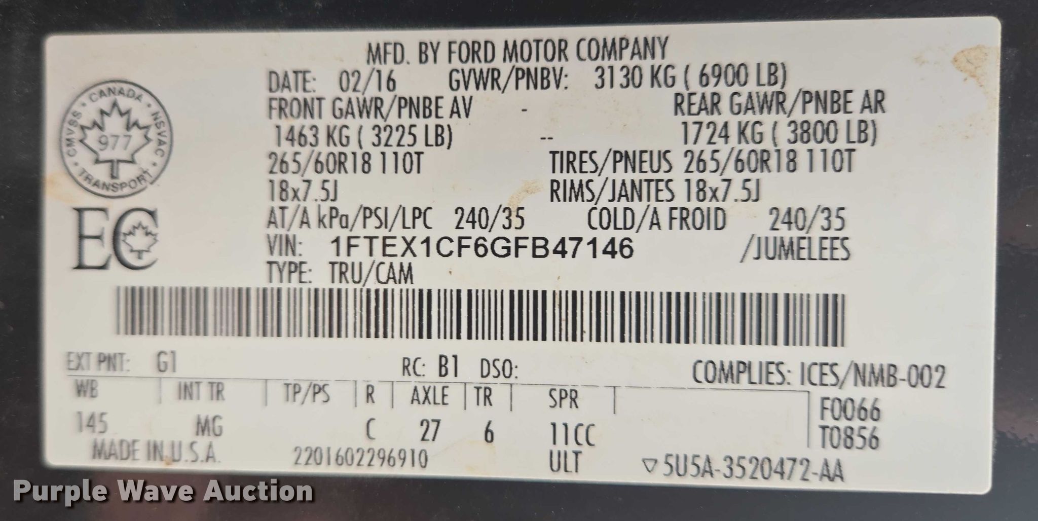 2016 Ford F150 XLT SuperCab pickup truck. Miles: 208,080 on odometer, Hours: 6,645 on meter, VIN: 1FTEX1CF6GFB47146. Engine Displacement: 5.0L V8 SOHC, Cylinders: 8, Fuel type: Gas. Transmission Automatic. Interior AC, Heat, Power windows, Power locks, Cruise control. Tires Size: 275/65R18. Notes Non-operational backup camera screen, Dash warning indicator: TPMS, Windshield chipped or cracked, Hail damage, Jump start required during on-site data collection. Wyoming title. Title distribution may be delayed up to 14 days from verification of funds. Croell Inc. Sundance, WY 82729
