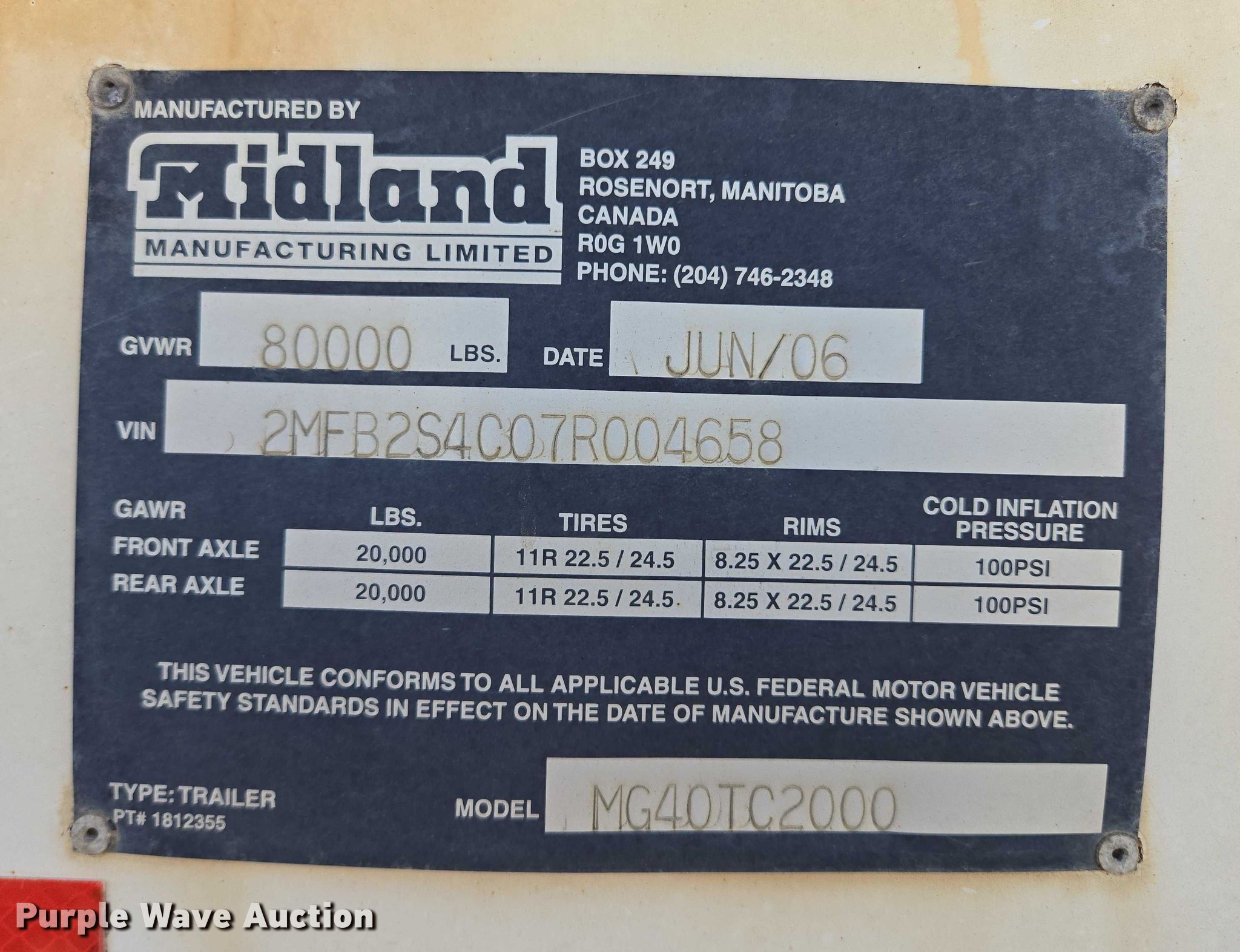 2007 Midland MG40TC2000 bottom dump trailer. VIN: 2MFB2S4C07R004658. Dimensions Overall Length: 41' 6", Width: 102", Body Length: 40', Side height: 58". Features Body type: Steel, Clamshell gate: Air operated, Trailer controls, Rear push block, Roll tarp. Chassis Landing gear: Dual, Suspension: Air, Brakes: Air, Axles: Tandem, GVWR: 80,000 lbs, GAWR: 20,000 lbs. Tires Aluminum wheels, Size: 445/65R22.5. Iowa title. Title distribution may be delayed up to 14 days from verification of funds. GCC. Alton, IA 51003