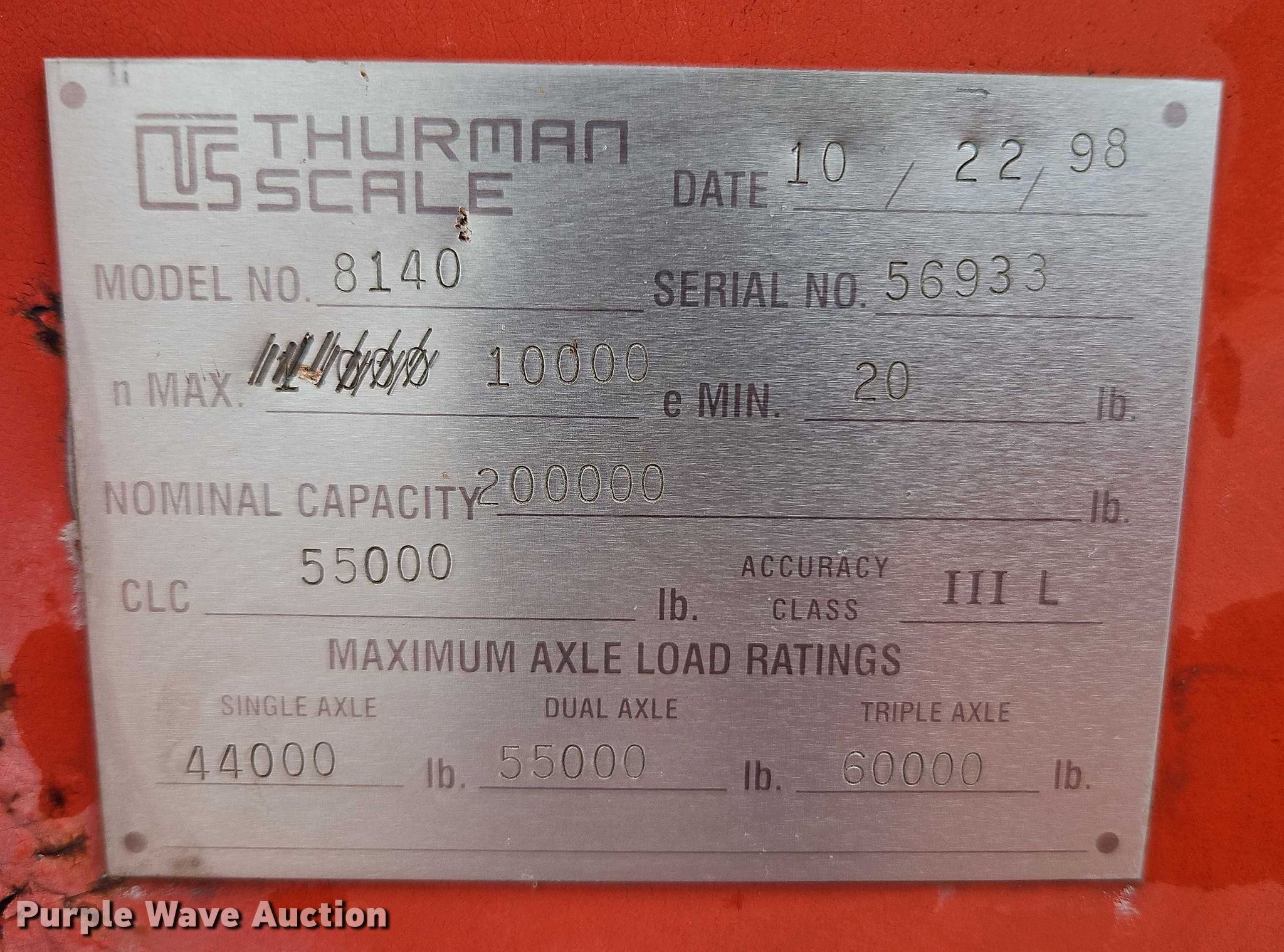 Purple Wave is selling a used Other Industrial or Business in Missouri. This item is a 1998 Thurman Scale 8140 truck scale with the following: Serial: 56933, Capacity: 200,000 lbs, Cardinal 210 monitor