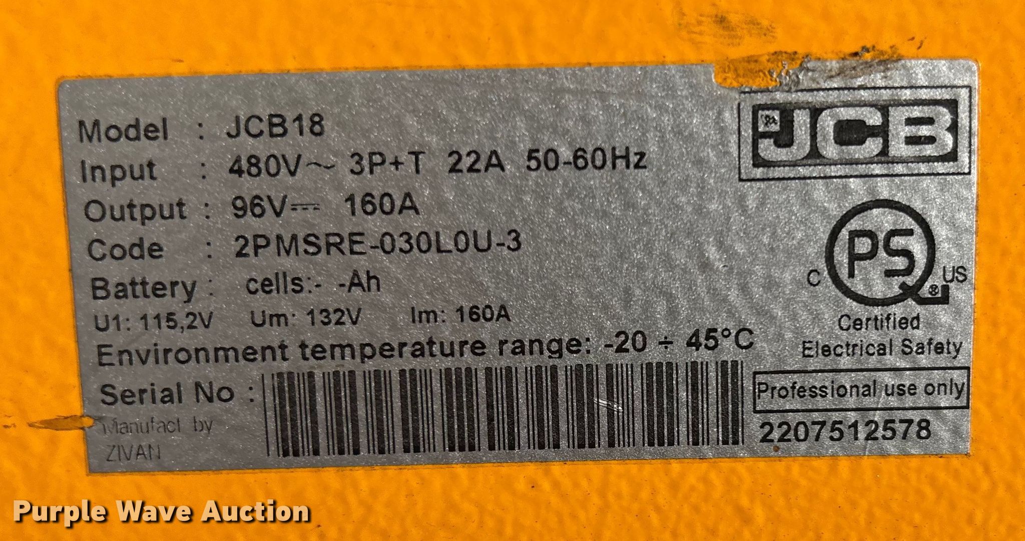 Purple Wave is selling a used Forklift Attach. in Florida. This item is a 2022 JCB JCB18 forklift charger with the following: Serial: 2207512578, Volts: 480, Amps: 22, Phase: Three, Unknown operating condition