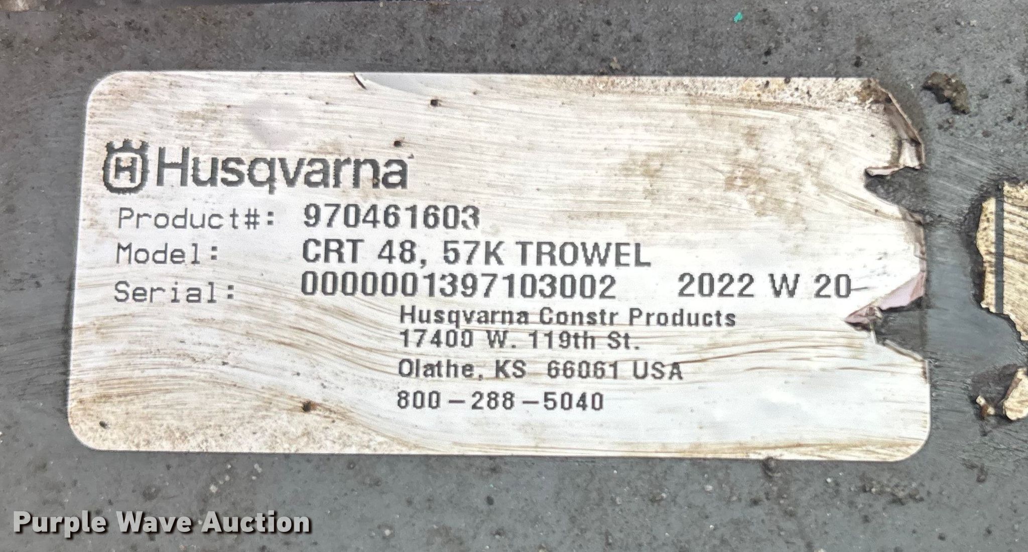 Purple Wave is selling a used Concrete Equip. or Acces. in South Carolina. This item is a Husqvarna CRT48 power trowel with the following: Hours: 414 on meter, Serial: 0000001397103002