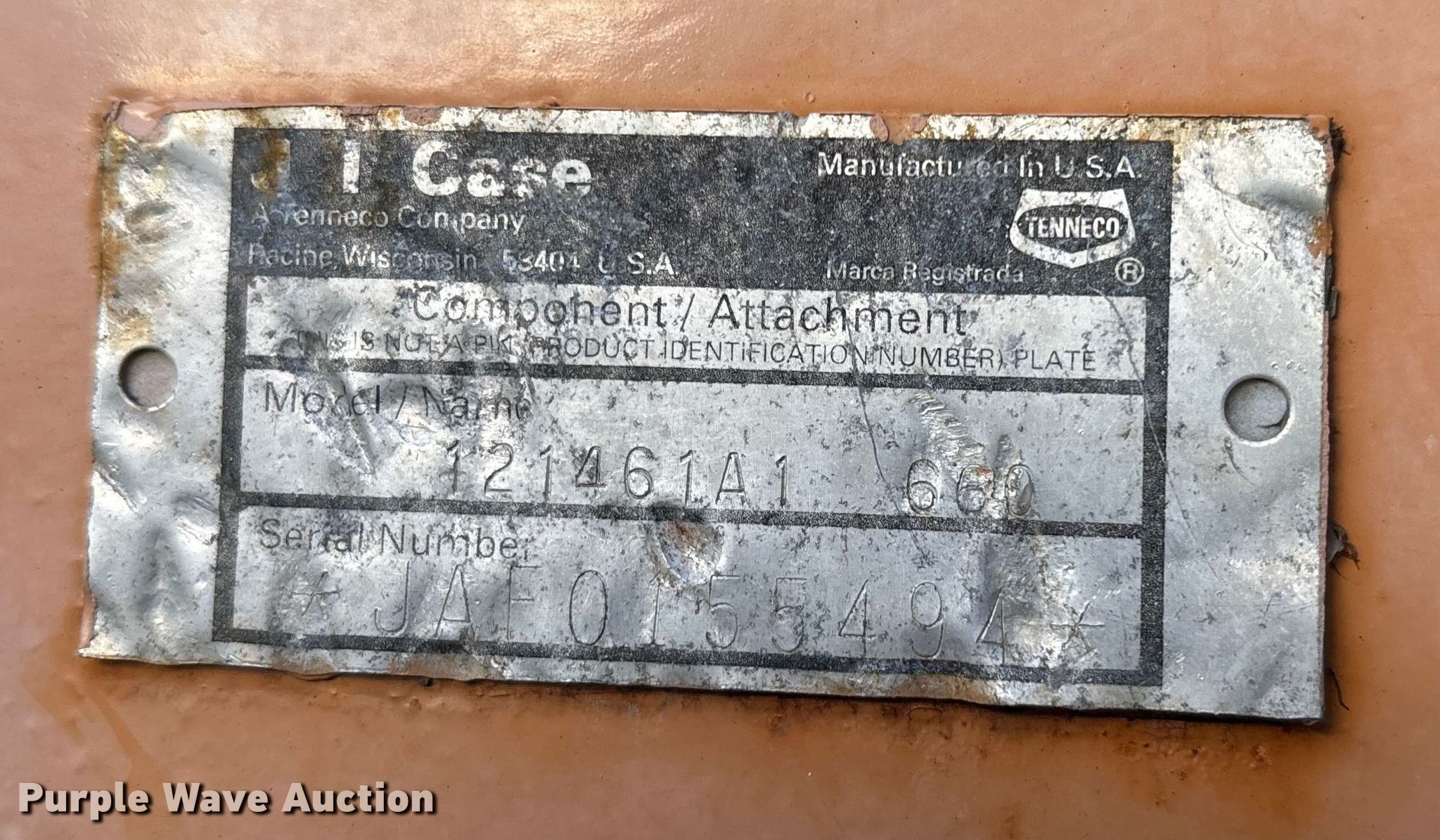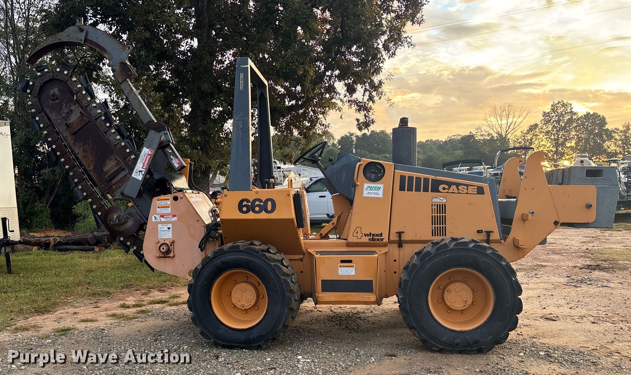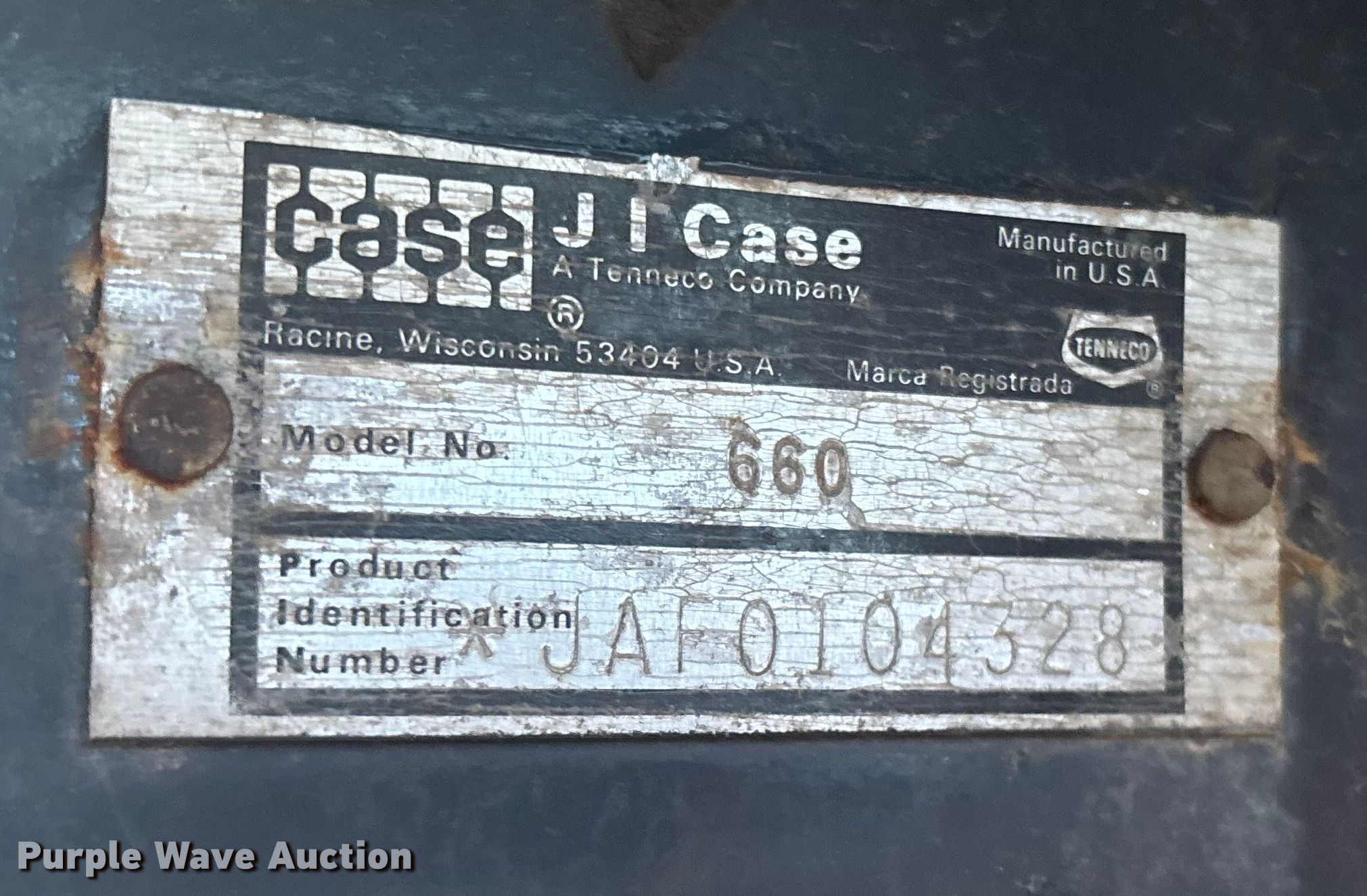1992 Case 660 trencher. Serial: JAF0104328. Engine Case 4-390, Serial: 44672137, Cylinders: 4, Fuel type: Diesel. Transmission Hydrostatic. Chassis Four wheel drive, Four wheel steer. Features Trencher Model: 121461A1, Estimated dig depth: 60", Cutting width: 6", Teeth: Dirt, Manual crumber, Suitcase weights: 14. Tires Size: 14.17.5. JKL Associates Inc. Colfax, NC 27235