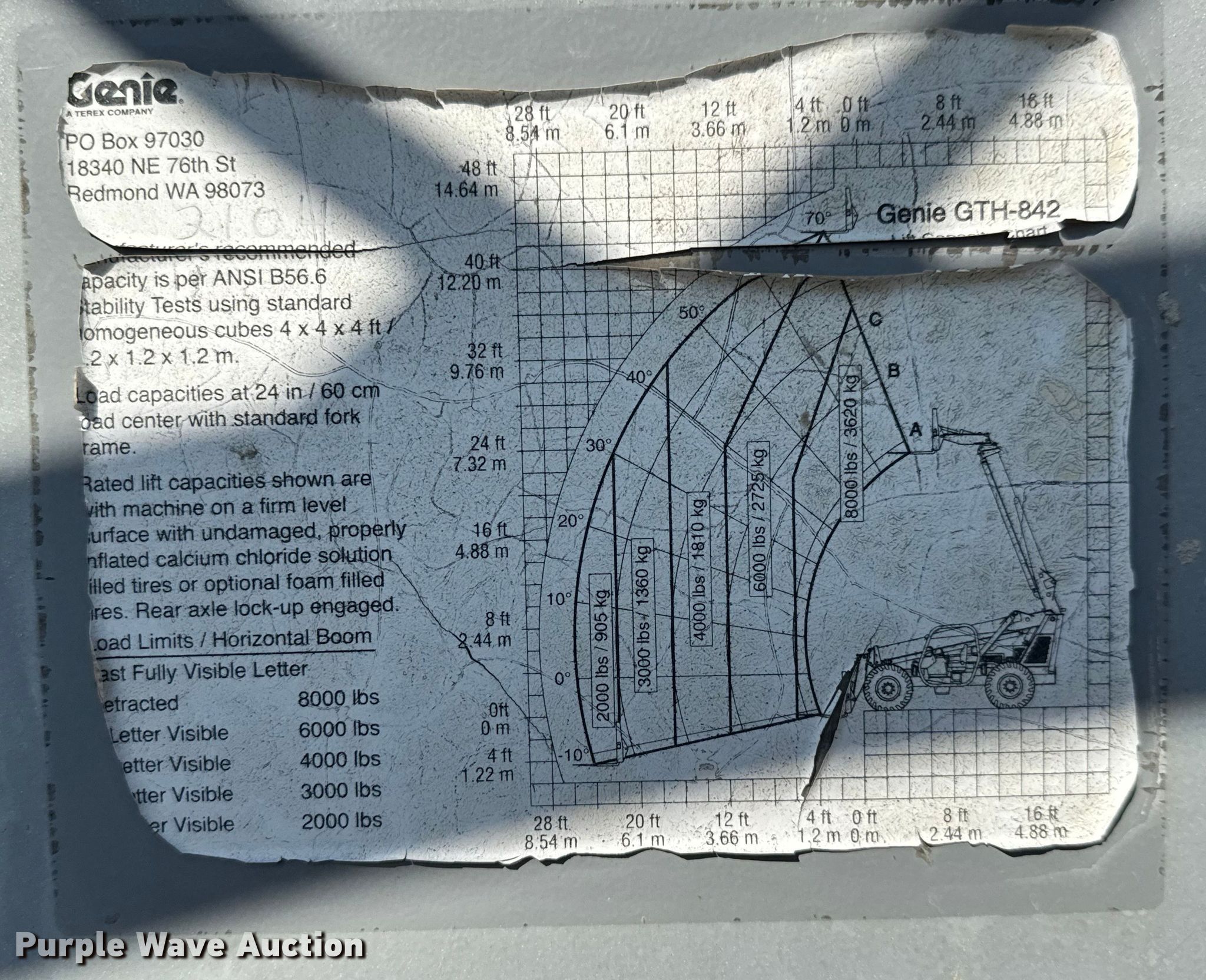 2007 Genie GTH-842 telehandler. Hours: 2,869 on meter, Serial: GTH0807B-7787. Engine John Deere 4045TF270B, Displacement: 4.5L, Cylinders: 4, Fuel type: Diesel, kW: 74. Transmission Powershift, 3F - 3R, Four wheel drive. Operators station Canopy, Steering: Crab, Four wheel. Features Maximum lift capacity: 8,000 lbs, Maximum lift height: 42', Boom stages: 3, Fork length: 47", Hydraulic leveling. Tires Size: 13.00-24. Born Masonry. Wichita, KS 67214