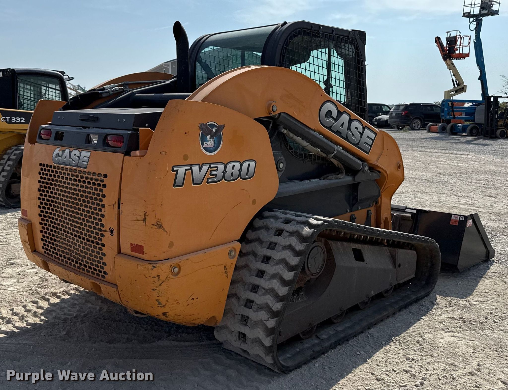2012 Case TV380 tracked skid steer loader. Hours: 1,605 on meter, Serial: NCM463699. Engine Cylinders: 4, Fuel type: Diesel. Transmission Hydrostatic, Two speed travel. Operators station Enclosed cab, AC, Heat, Bucket control: Hand. Features Auxiliary hydraulics, Quick coupler: Hydraulic, Counter weights, Bucket Kivel, Width: 78", Low profile. Tracks Width: 17". Notes Lap bar strut issues, needs replaced. Hoover Rental and Sales. Cantril, IA 52542