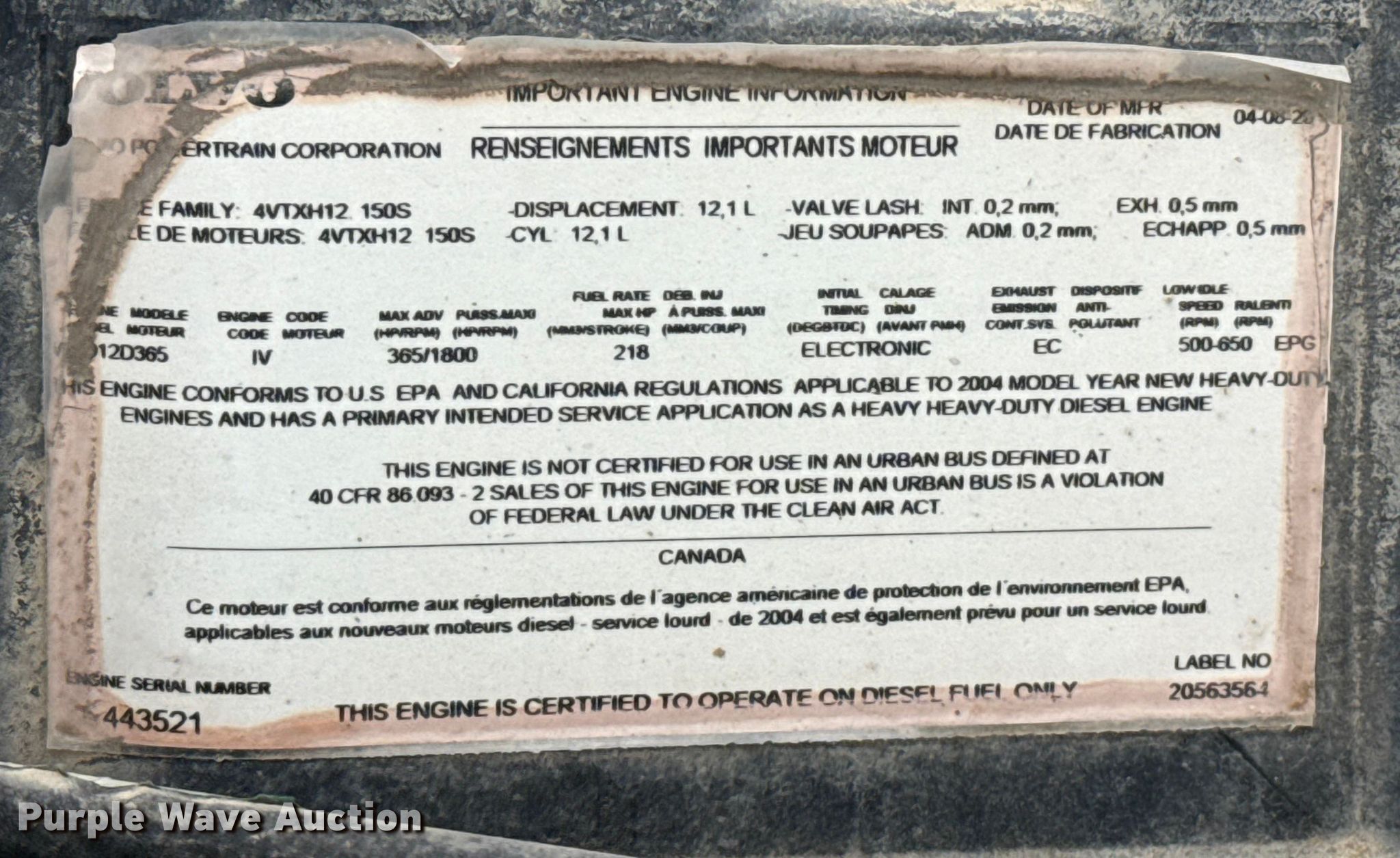 2005 Volvo VHD ready mix truck. Miles: Unknown, VIN: 4V5KC9GF05N390039. Engine Volvo, Displacement: 12.1L, Cylinders: 6, Fuel type: Diesel, Engine brake. Transmission Manual. Chassis Axles: Tandem, Differential lock: Inter-axle, Suspension: Spring, Brakes: Air, PTO. Interior AC, Heat. Features Mixer Beck, Serial: J-04-02, Capacity: 10.5 cu.yd., Discharge: Rear, In-cab controls, Rear drum controls, Water tank capacity: 150 gallons, Chute Extensions: 2, Chute type: Steel.. Tires Front: 425/65R22.5, Rear: 11R22.5. Notes Electrical issues, Non-operational ECM, Unit must be towed or hauled , Non-operational unit. Iowa title. Mileage has not been verified. Exempt will be written in the odometer disclosure on the title. Title distribution may be delayed up to 30 days from verification of funds. Croell Inc.. Clayton, NM 88415